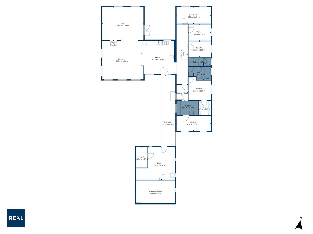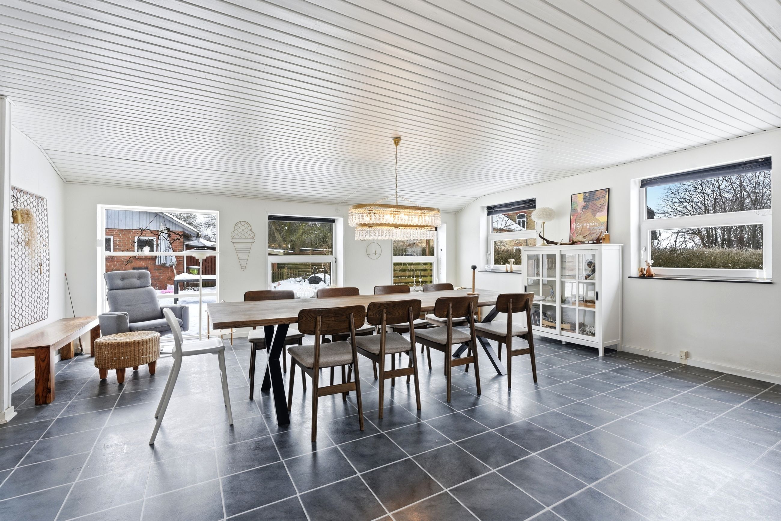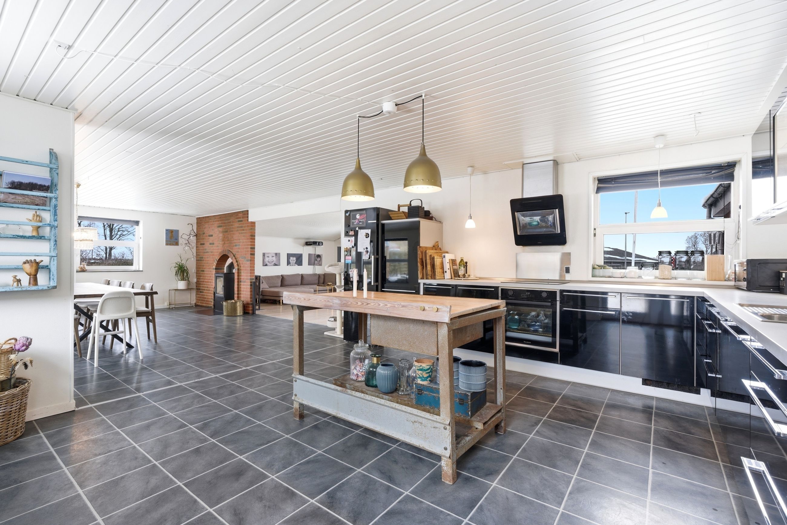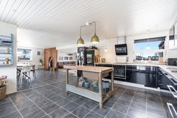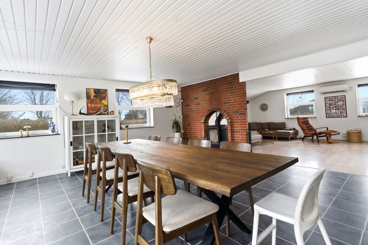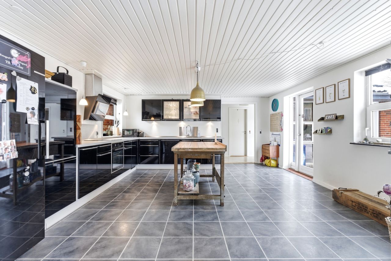Boligen byder på et stort og lyst køkken i åben forbindelse med spiseafdeling og alrum, hvor familien naturligt samles. Her er god plads til både hverdagsliv og gæster, og rummenes størrelse giver mange indretningsmuligheder. Køkkenet ligger centralt placeret og skaber en god sammenhæng mellem opholdsrum og værelsesafdeling.