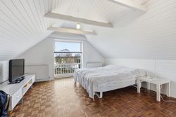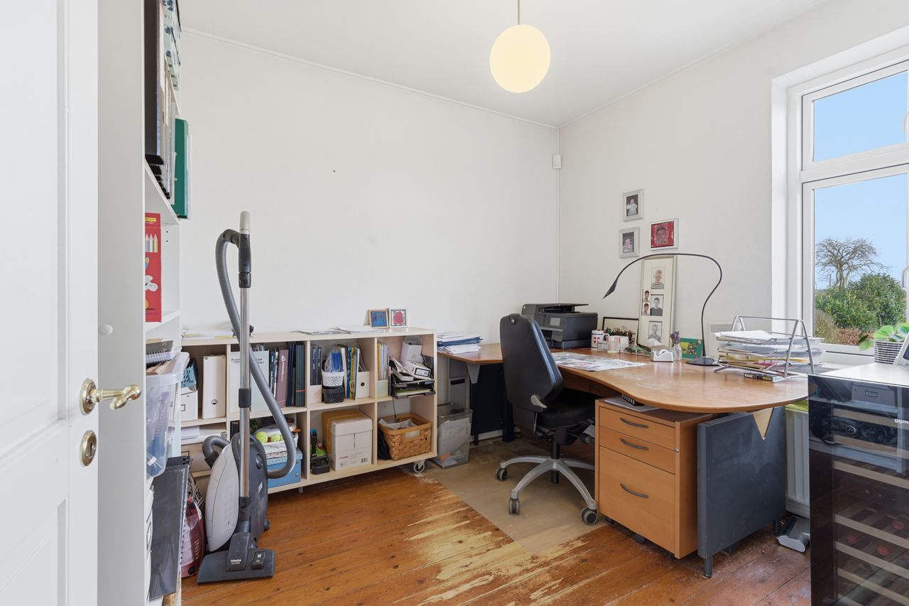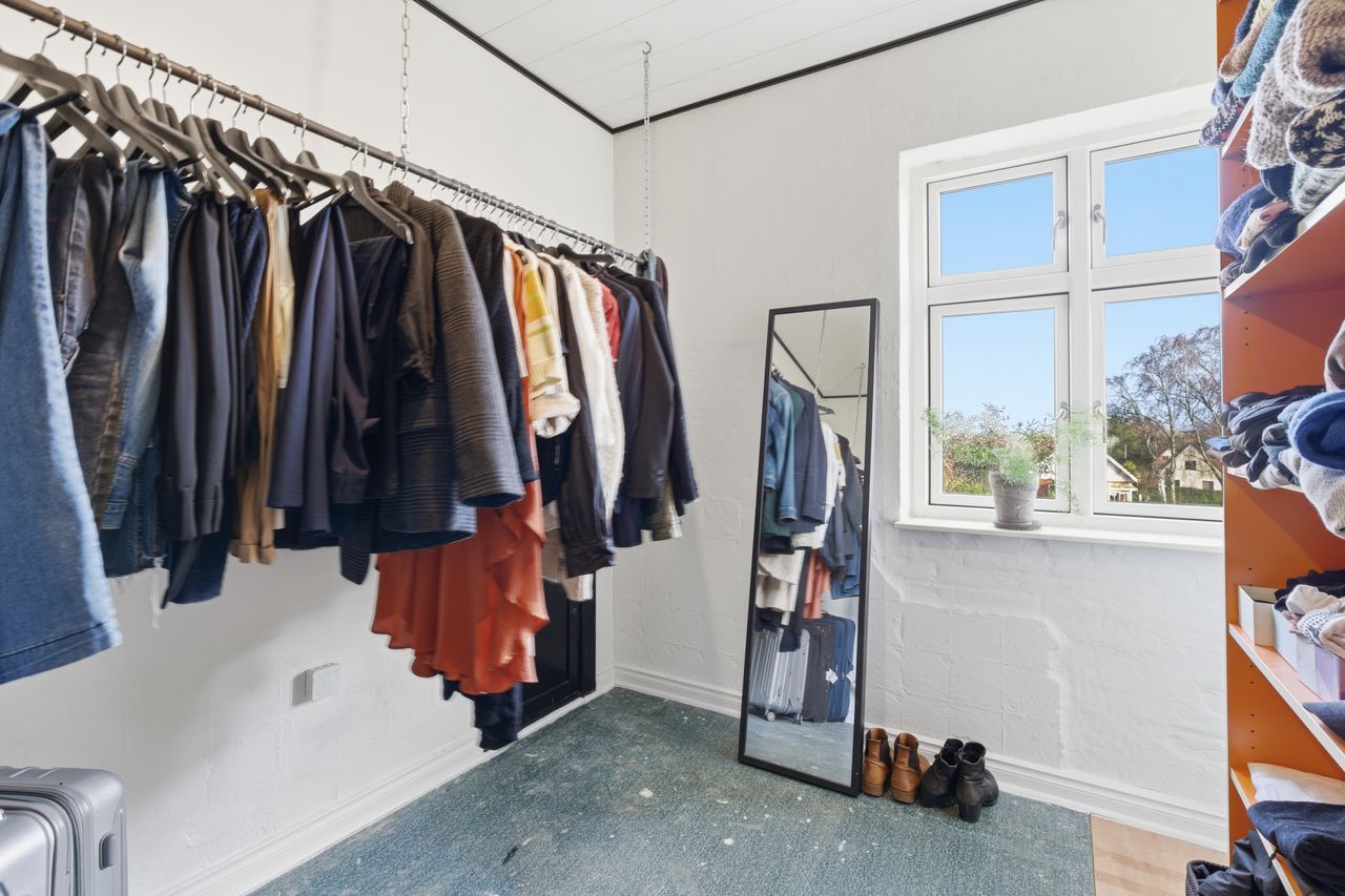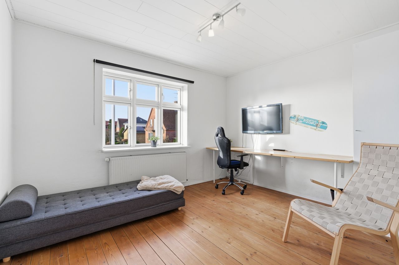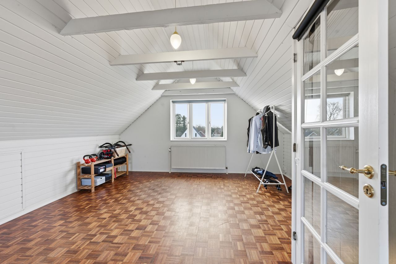Når man bevæger sig op ad den sindssygt flotte trappe – et af husets helt store æstetiske højdepunkter – åbner 1. salen sig med tre rigtig gode værelser, der alle fremstår både velholdte og lette at indrette. Øverst oppe ligger 2. salen, som i dag er indrettet som et ekstra værelse. Rummet er imponerende flot og tilfører huset en ekstra dimension af charme og karakter.