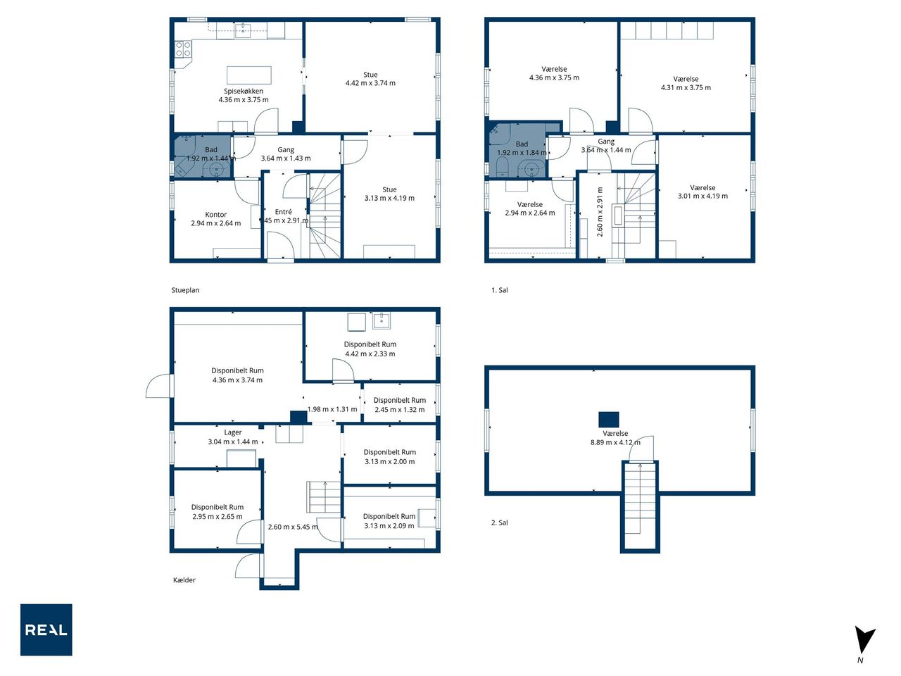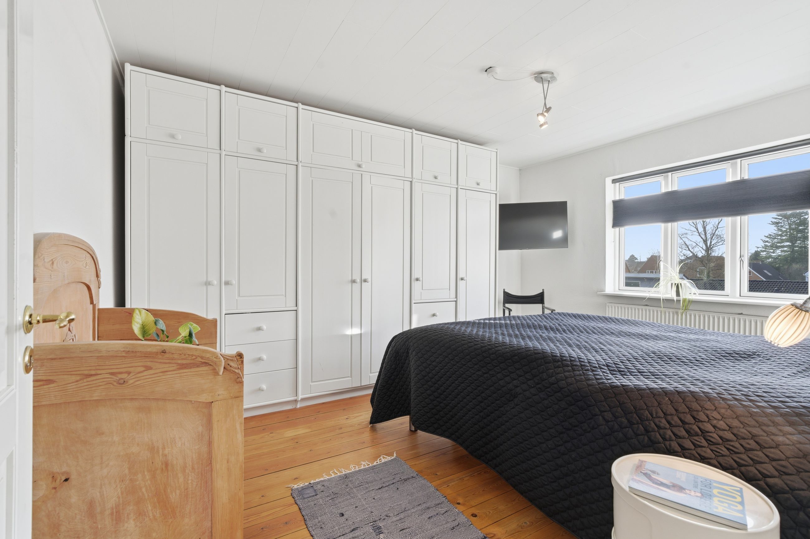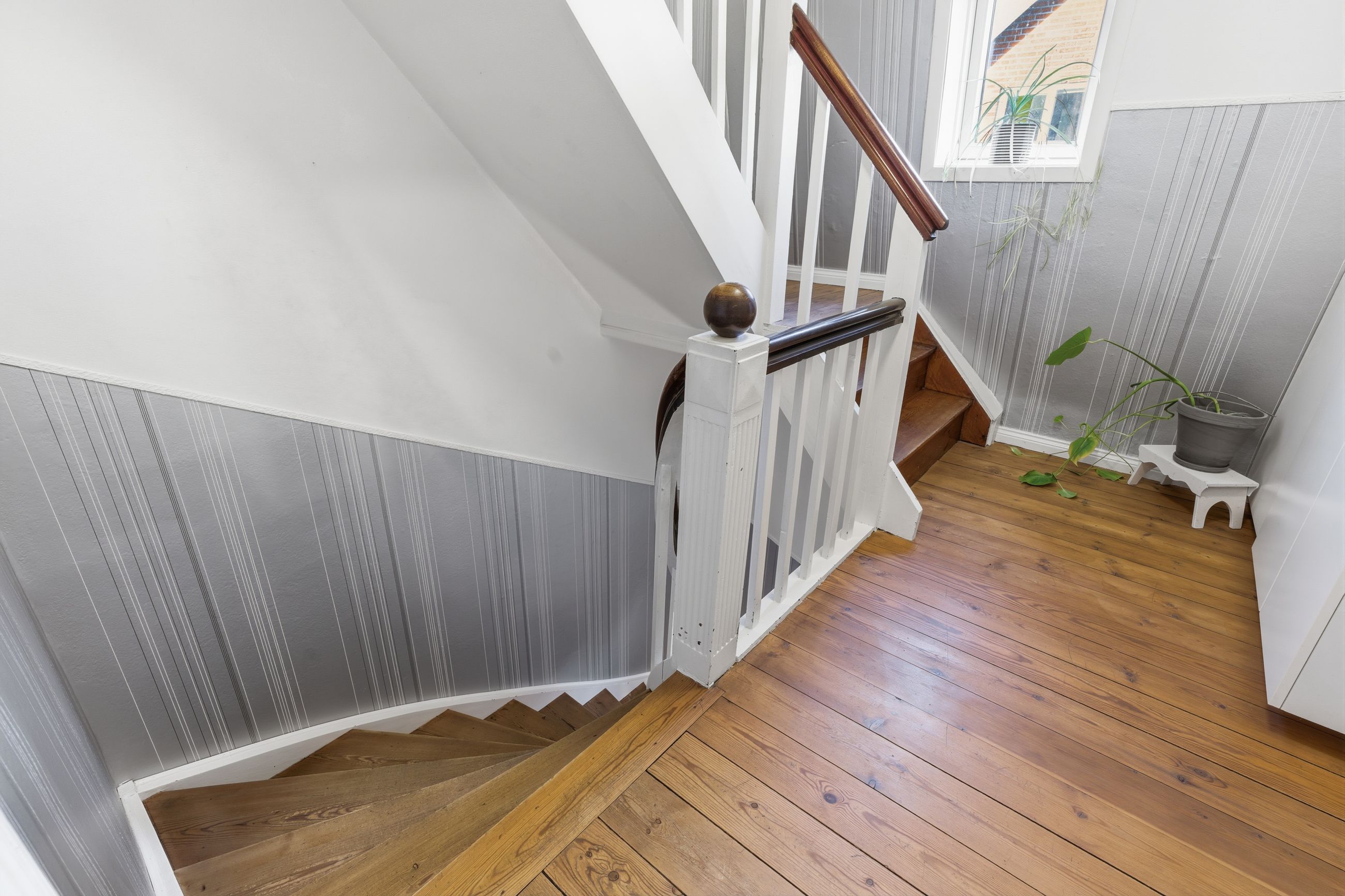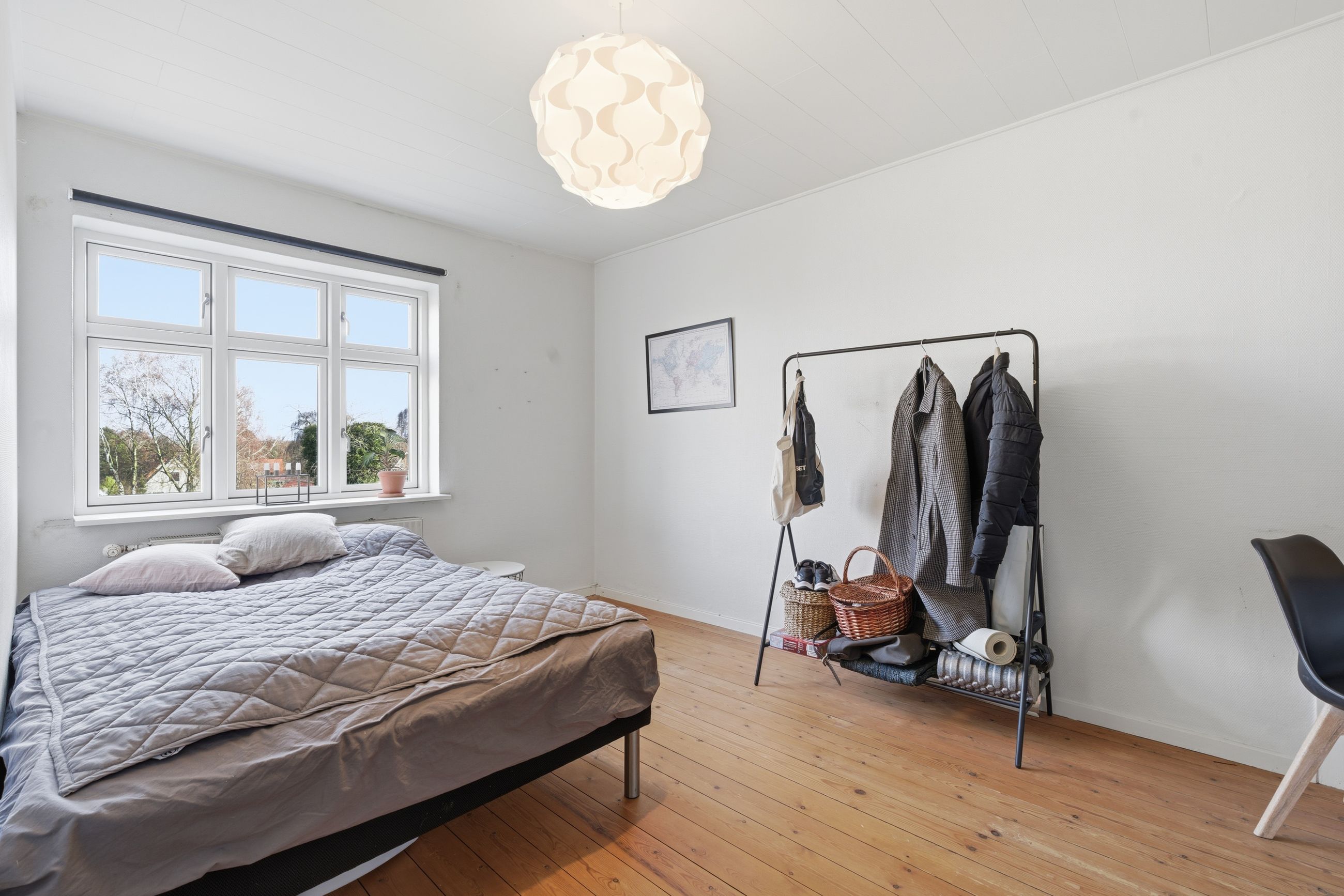 Når man bevæger sig op ad den sindssygt flotte trappe – et af husets helt store æstetiske højdepunkter – åbner 1. salen sig med tre rigtig gode værelser, der alle fremstår både velholdte og lette at indrette. Øverst oppe ligger 2. salen, som i dag er indrettet som et ekstra værelse. Rummet er imponerende flot og tilfører huset en ekstra dimension af charme og karakter.