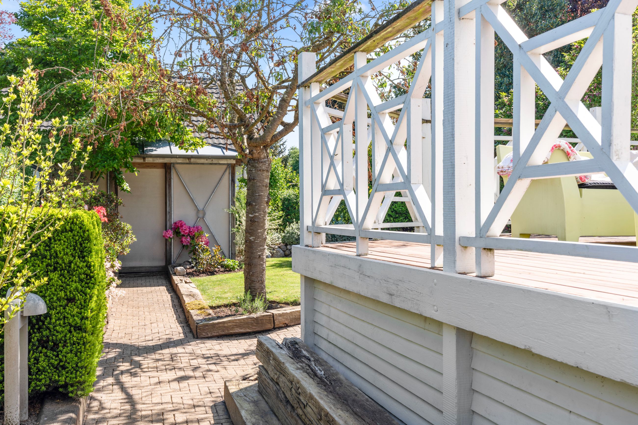Haven er nærmest eventyrlig og har både træterrasse, carport og skur til haveredskaber.