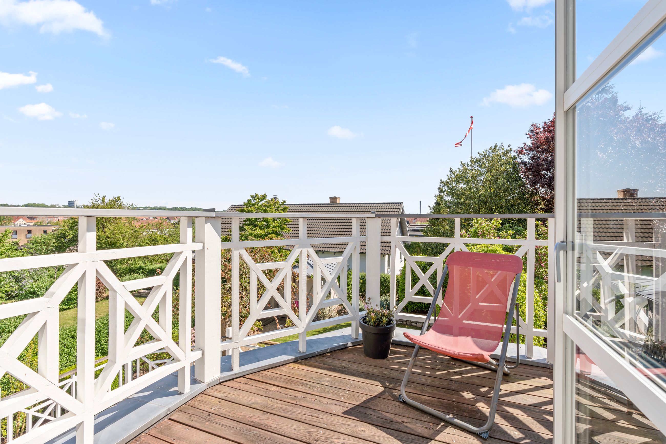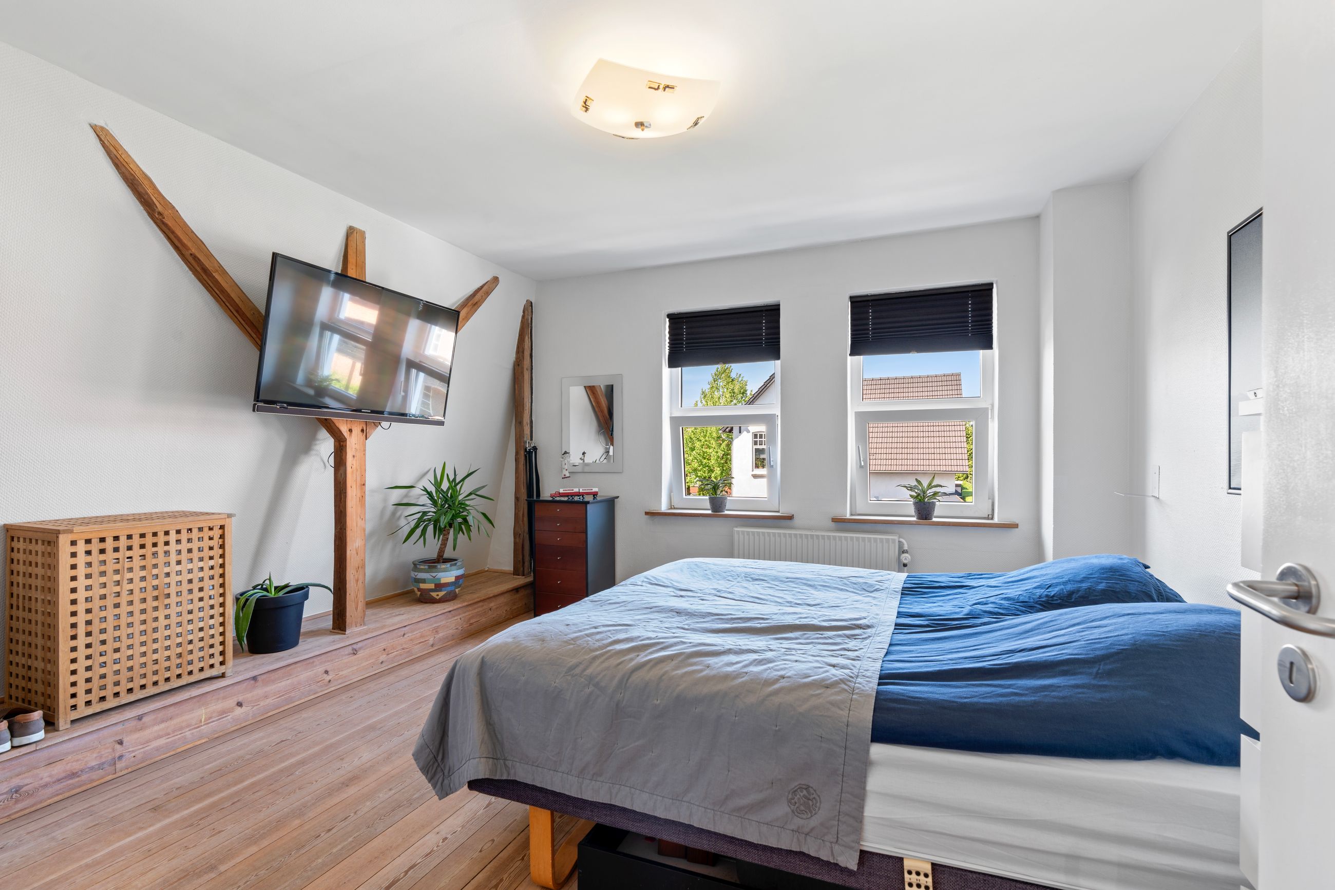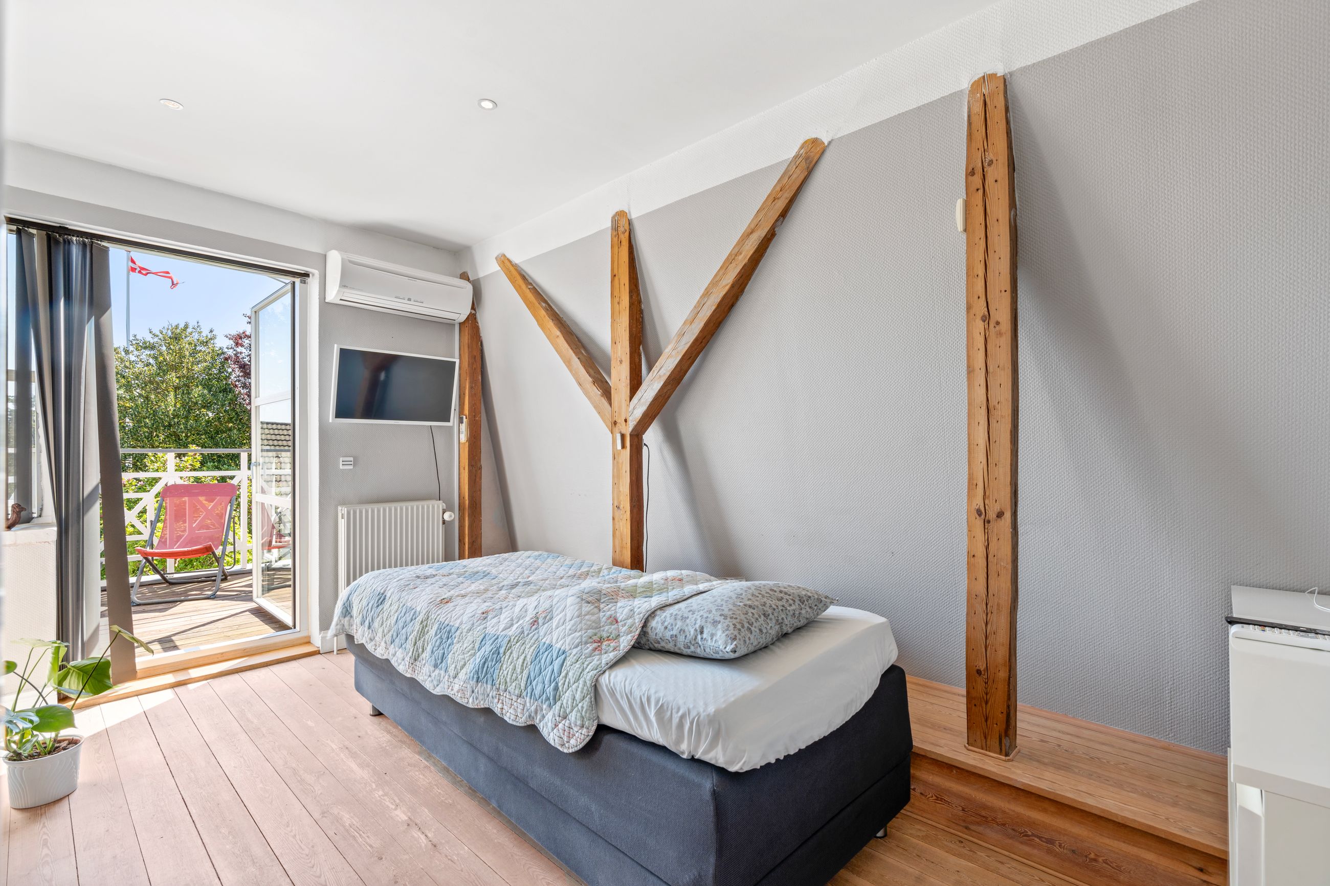 Førstesalen rummer tre rummelige værelser og et badeværelse. Fra soveværelset er der udgang til en