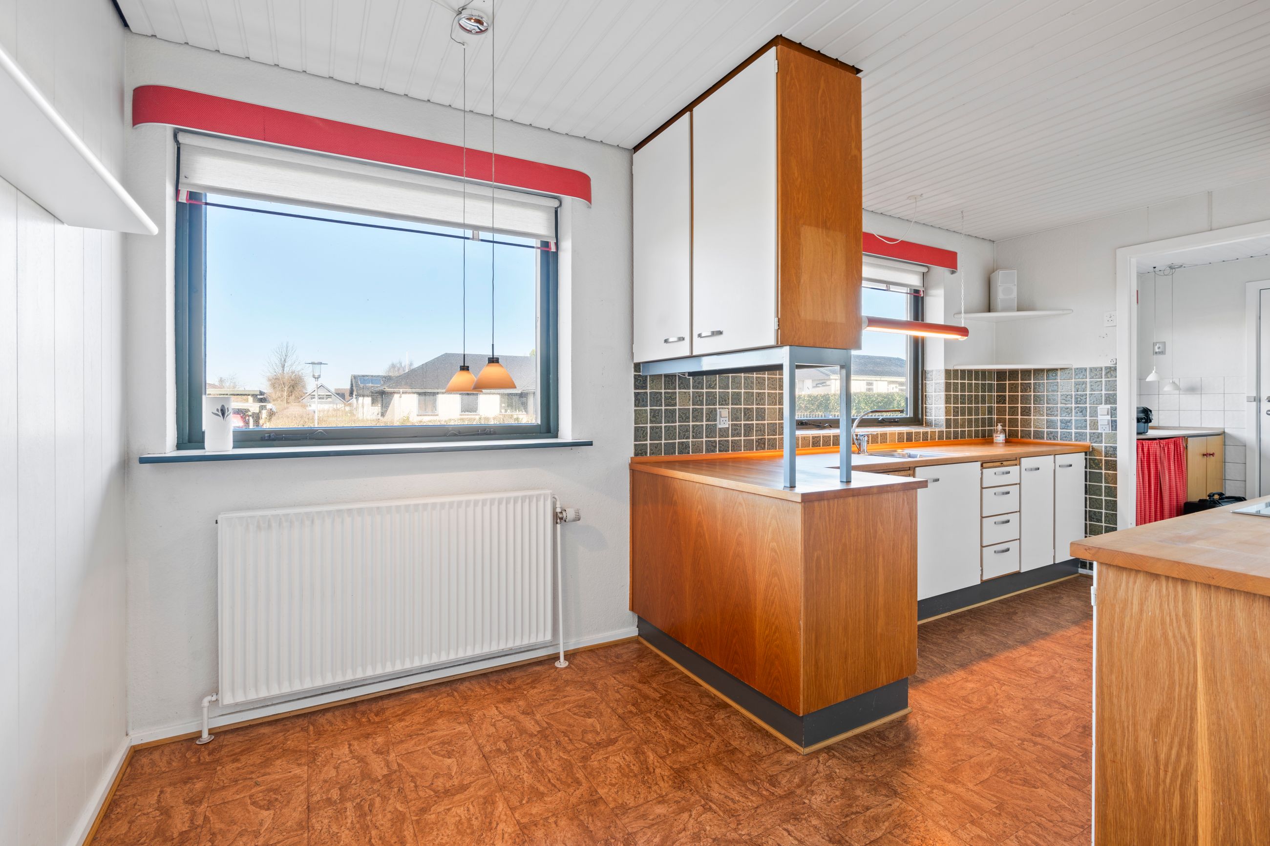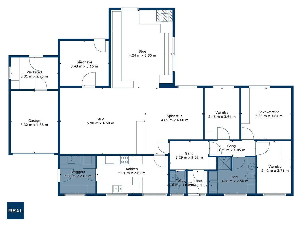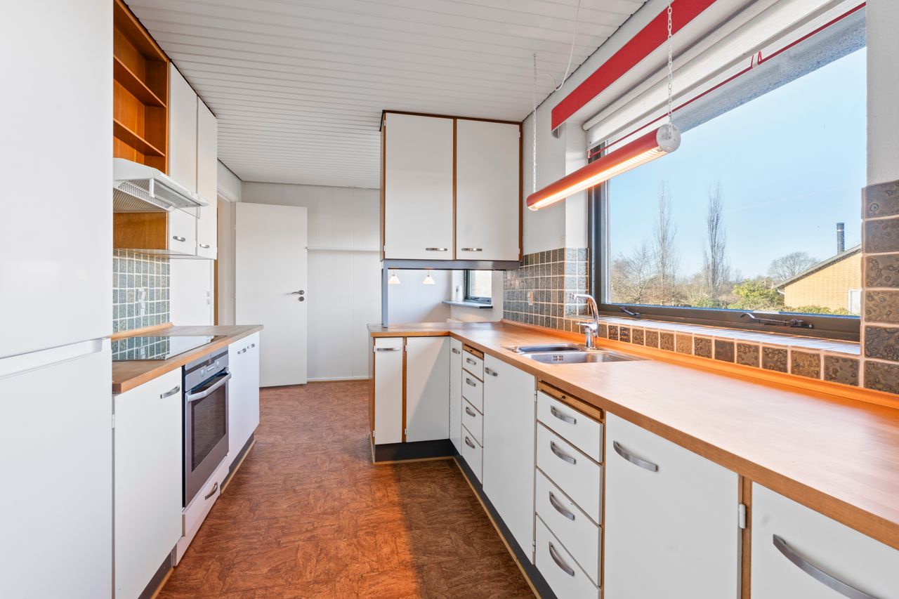 Ved ankomst mødes du af en lys og indbydende entré, hvorfra der er adgang til husets gæstetoilet. Herfra føres du videre til et rummeligt køkken med spiseplads og gode opbevaringsmuligheder. Der er samtidig mulighed for at åbne op til stuen og skabe et stort, sammenhængende køkken-alrum med masser af lys og luft. Ved siden af køkkenet findes et praktisk bryggers med direkte adgang til haven – en oplagt løsning til opbevaring og vaskefaciliteter.