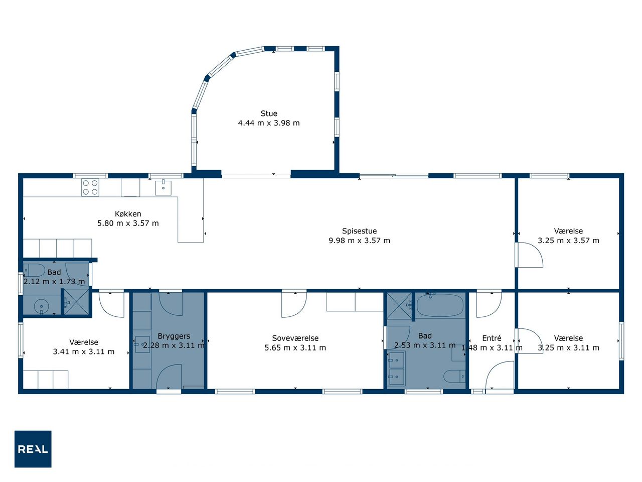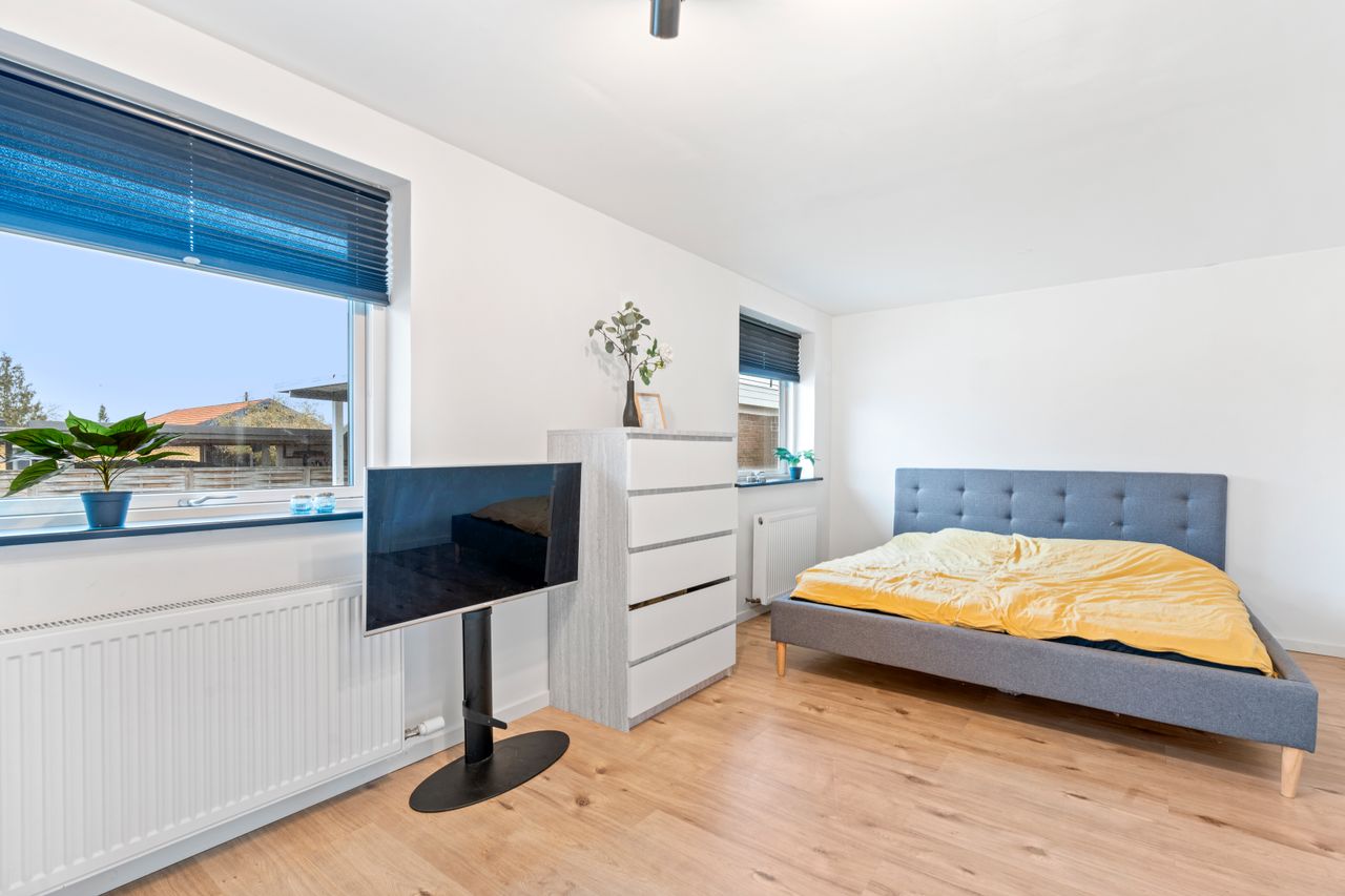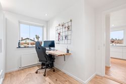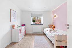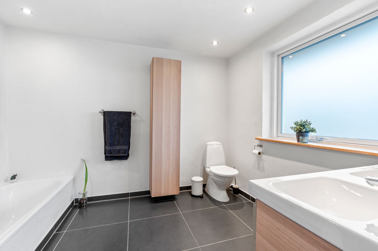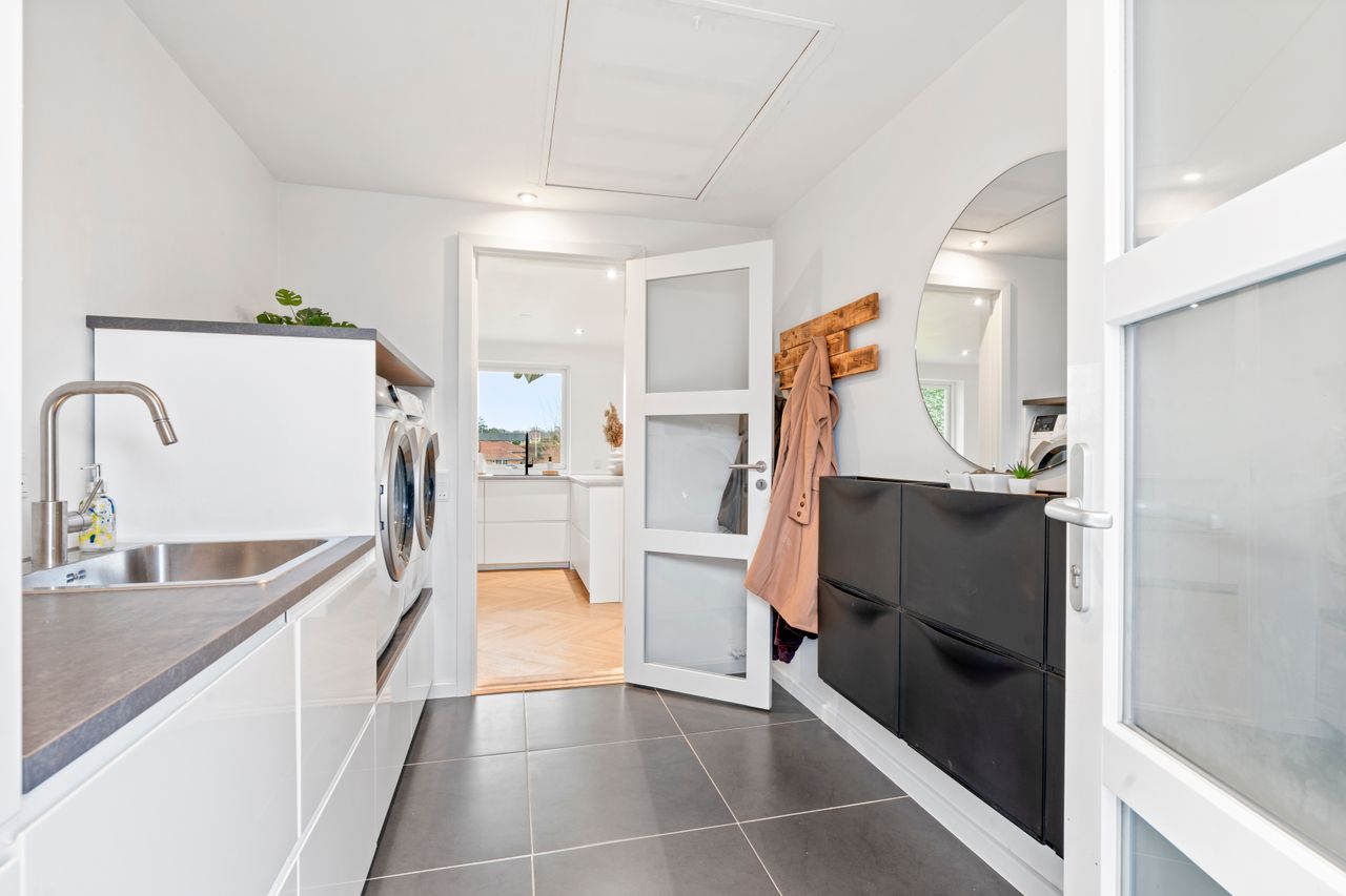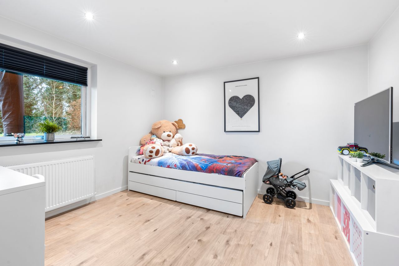 Boligen tilbyder desuden et skønt forældresoveværelse med et elegant badeværelse ensuite, hvor hverdagen får et strejf af luksus. Derudover finder du tre yderligere værelser, der giver masser af plads til børn, gæster eller hjemmekontor. Et ekstra badeværelse samt et praktisk bryggers fuldender boligens indretning.