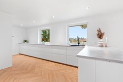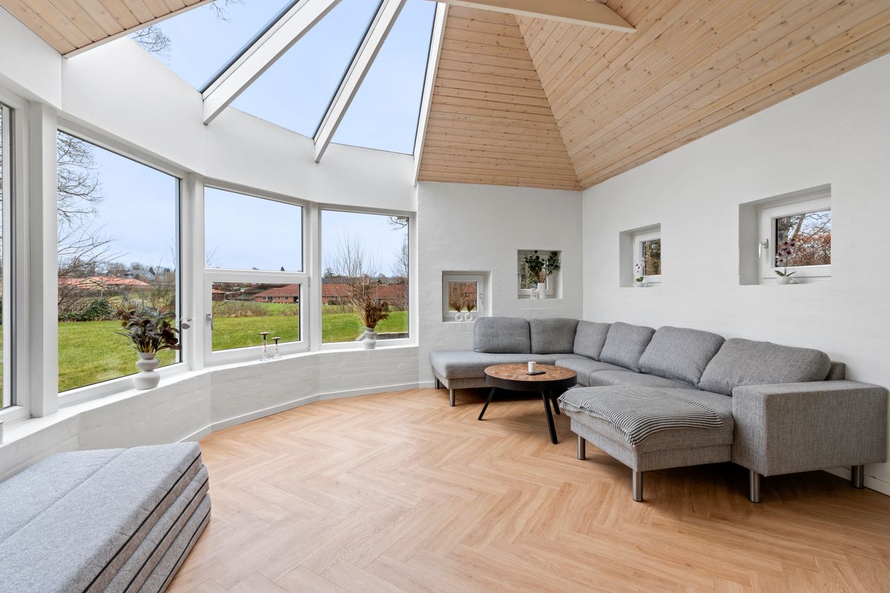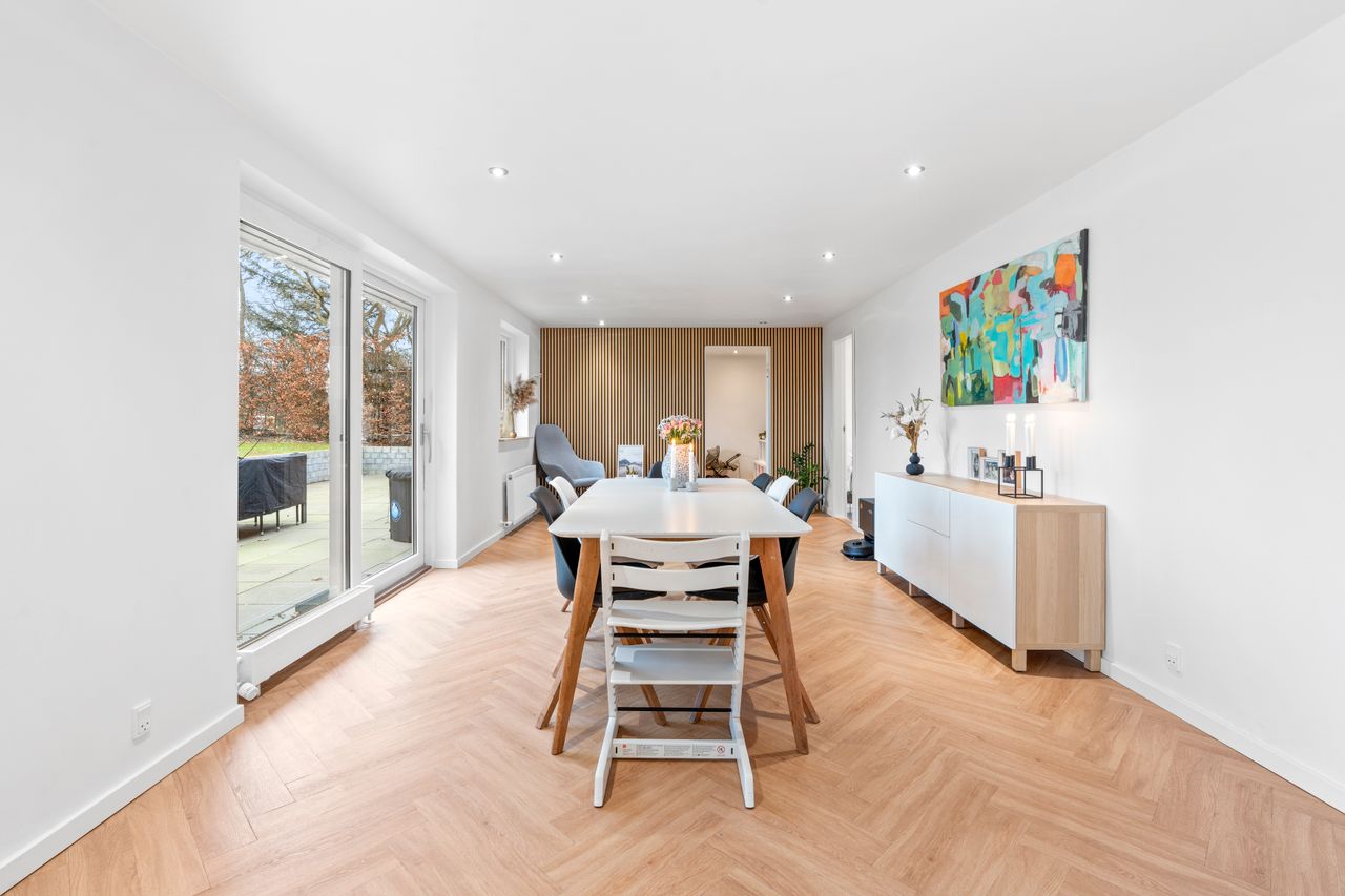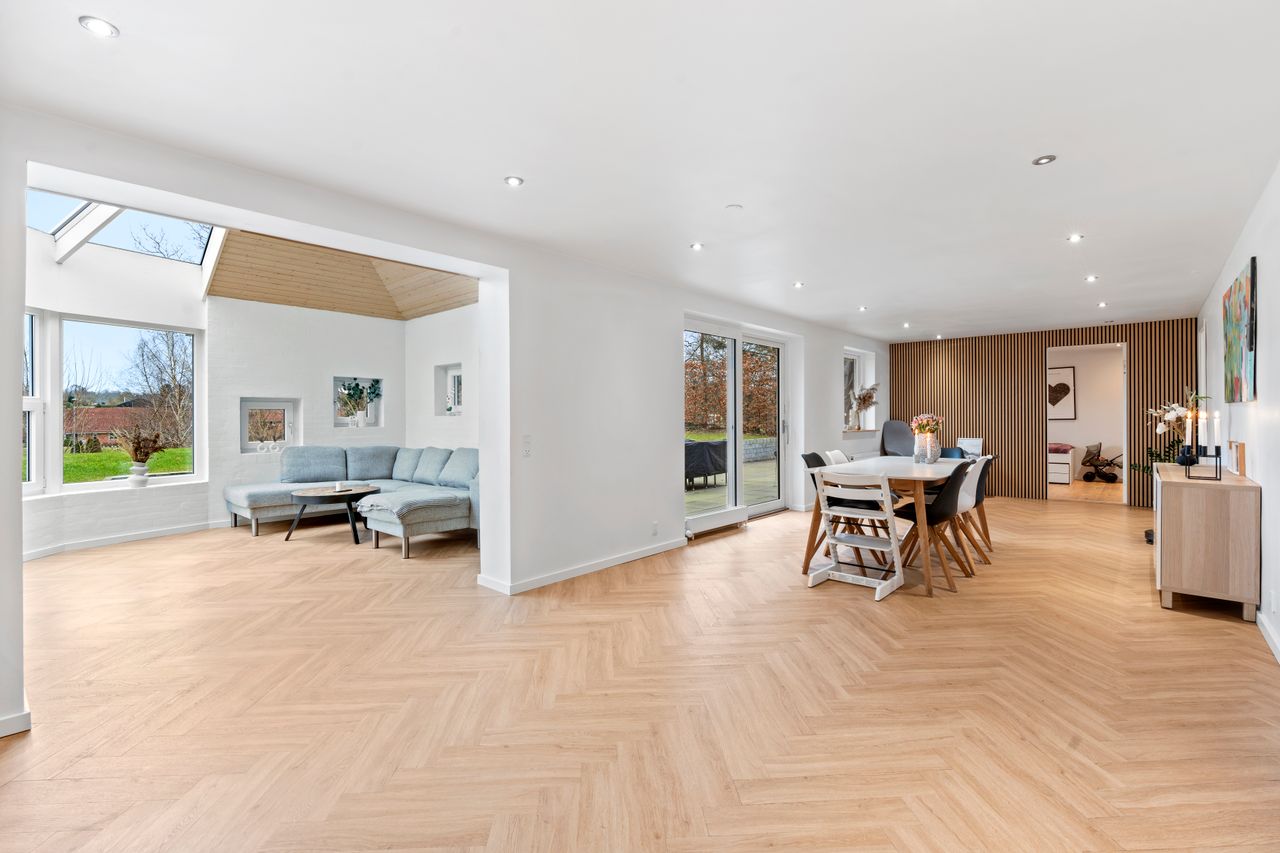 Ved ankomsten mødes du af en indbydende entré, der leder dig videre til det imponerende, lyse køkken-alrum. Her er der en fantastisk rummelighed med plads til et stort spisebord og en hyggelig sofakrog, hvor familie og venner kan samles. De store vinduespartier skaber et dejligt lysindfald og giver direkte adgang til den elegante udestue, hvor du kan nyde årstidernes skiften i smukke omgivelser. Køkkenet, som er udskiftet sidste år, fremstår moderne og stilrent med lækre materialer og eksklusive detaljer. Den flotte sildebensparket fuldender rummet og tilføjer et eksklusivt præg.