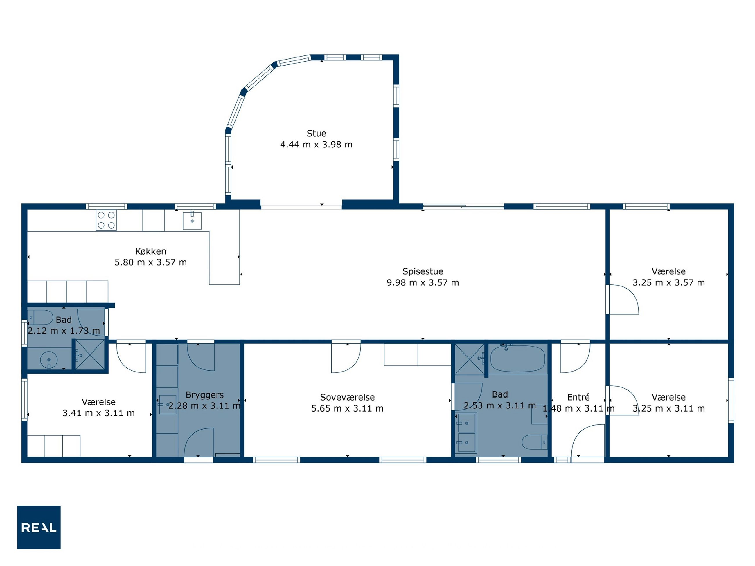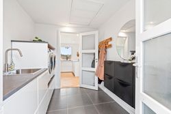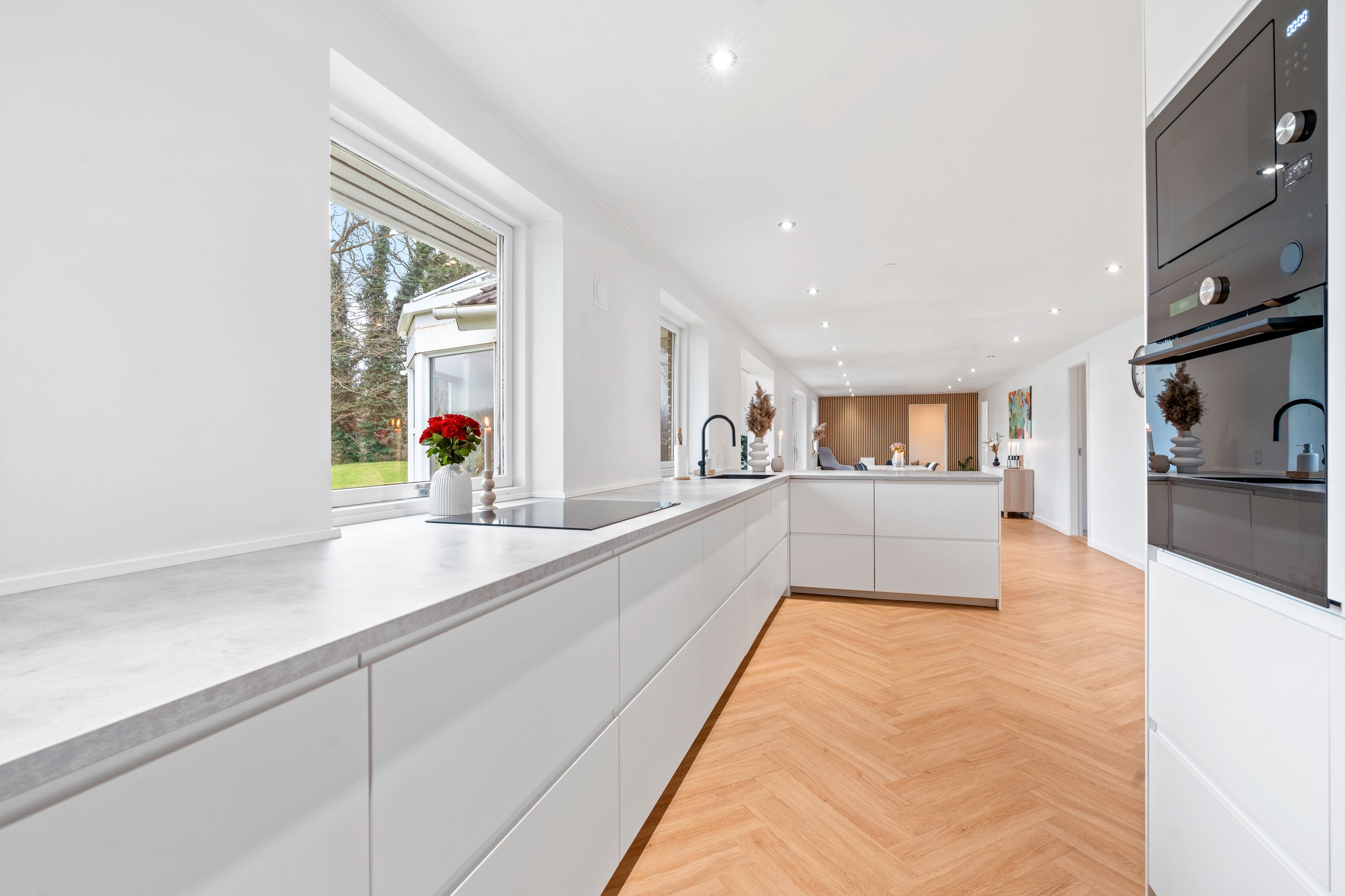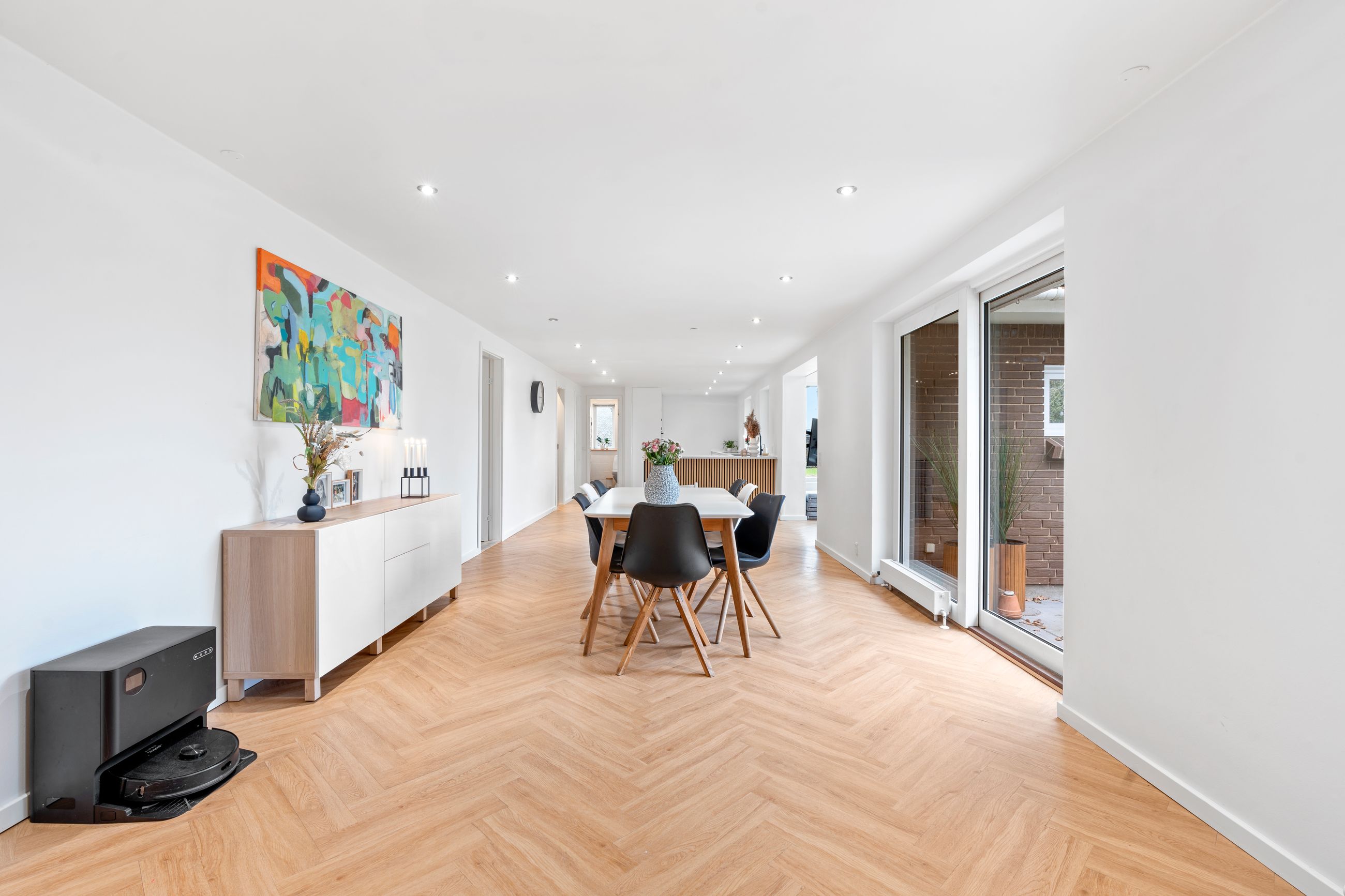 Ved ankomsten mødes du af en indbydende entré, der leder dig videre til det imponerende, lyse køkken-alrum. Her er der en fantastisk rummelighed med plads til et stort spisebord og en hyggelig sofakrog, hvor familie og venner kan samles. De store vinduespartier skaber et dejligt lysindfald og giver direkte adgang til den elegante udestue, hvor du kan nyde årstidernes skiften i smukke omgivelser. Køkkenet, som er udskiftet sidste år, fremstår moderne og stilrent med lækre materialer og eksklusive detaljer. Den flotte sildebensparket fuldender rummet og tilføjer et eksklusivt præg.