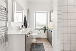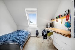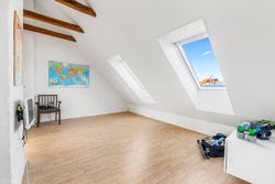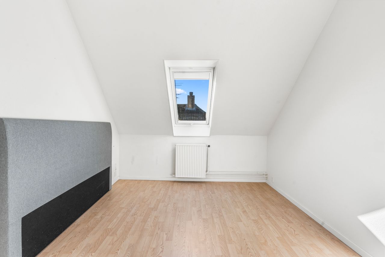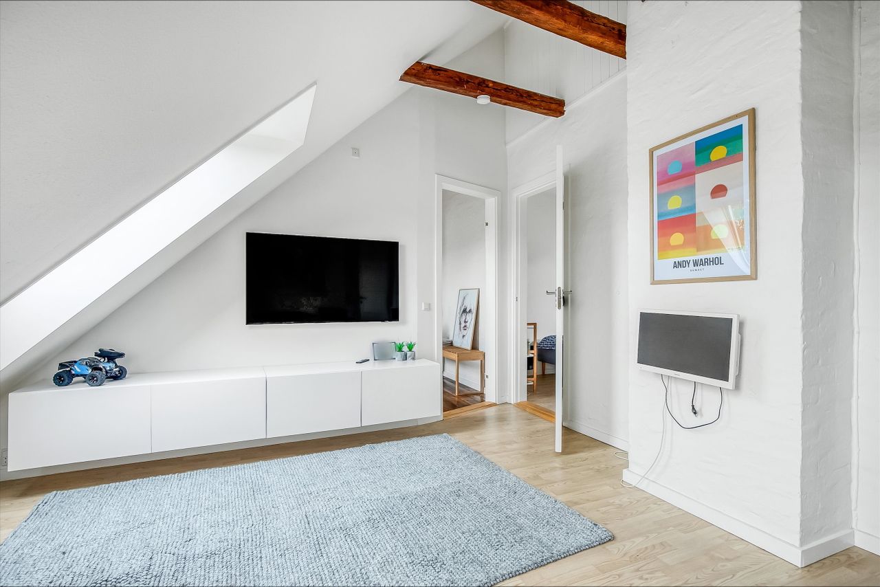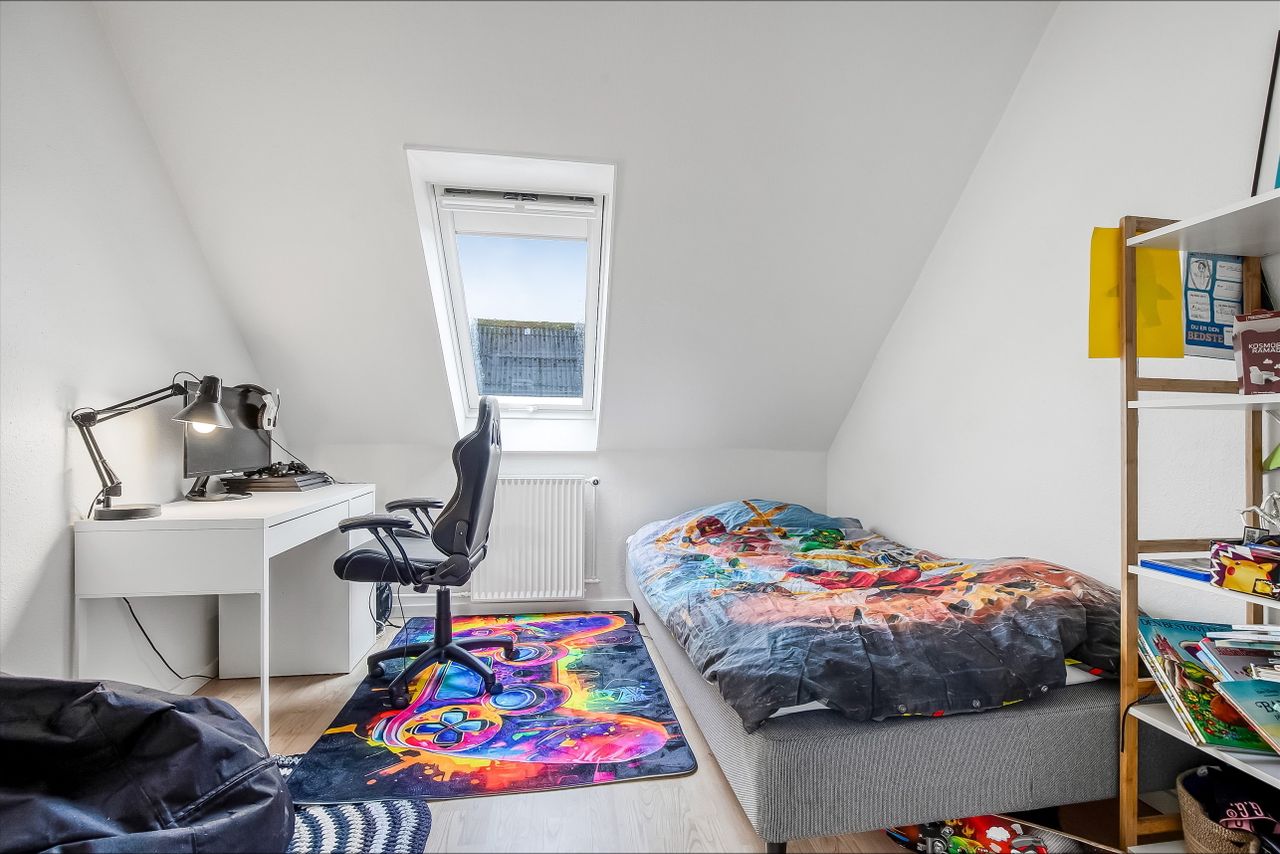 På øverste etage møder vi en repos, der åbner op til et stort multirum eller ekstra stue, som kan indrettes efter behov. Herudover findes tre gode værelser samt ekstra garderobeplads. Der er også mulighed for at etablere et fint gæstetoilet eller badeværelse, hvilket kan gøre etagen endnu mere funktionel.