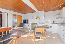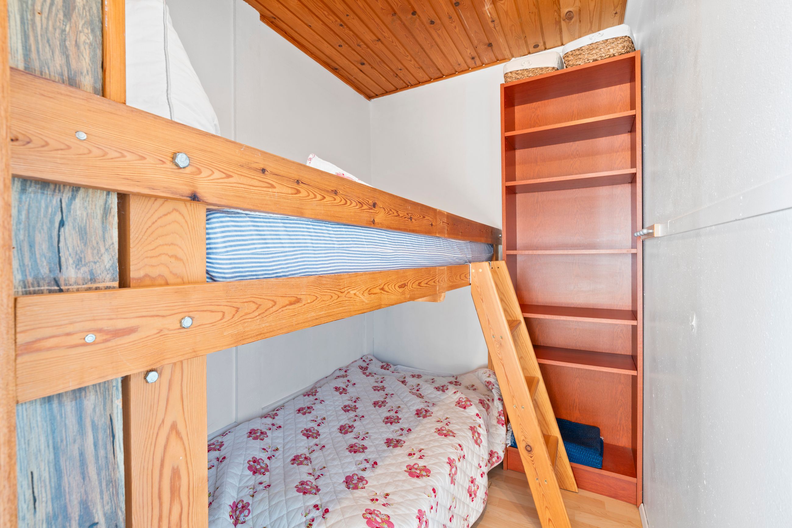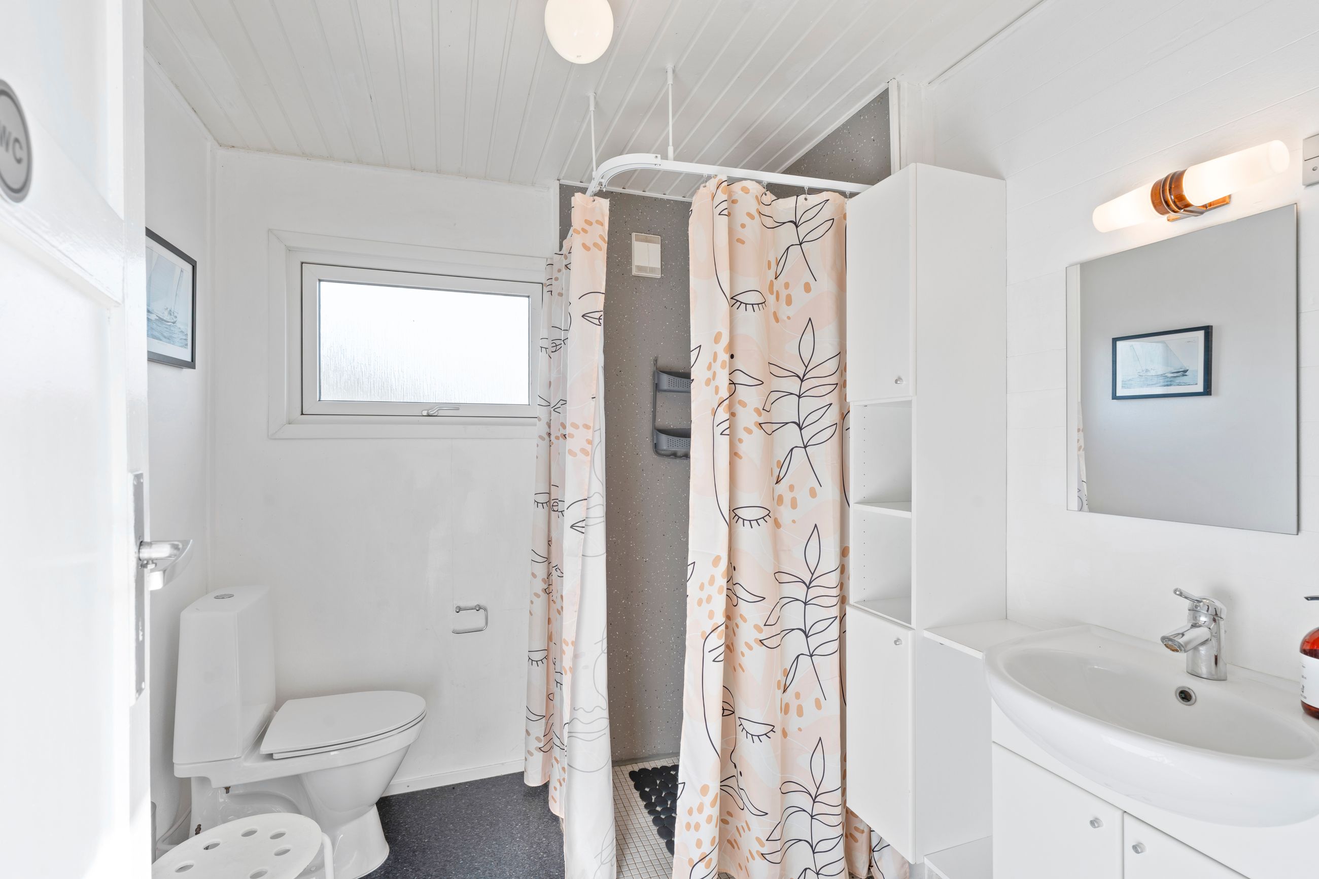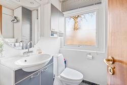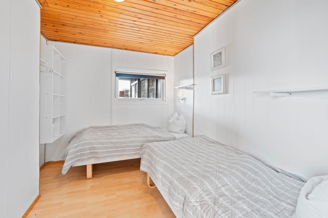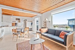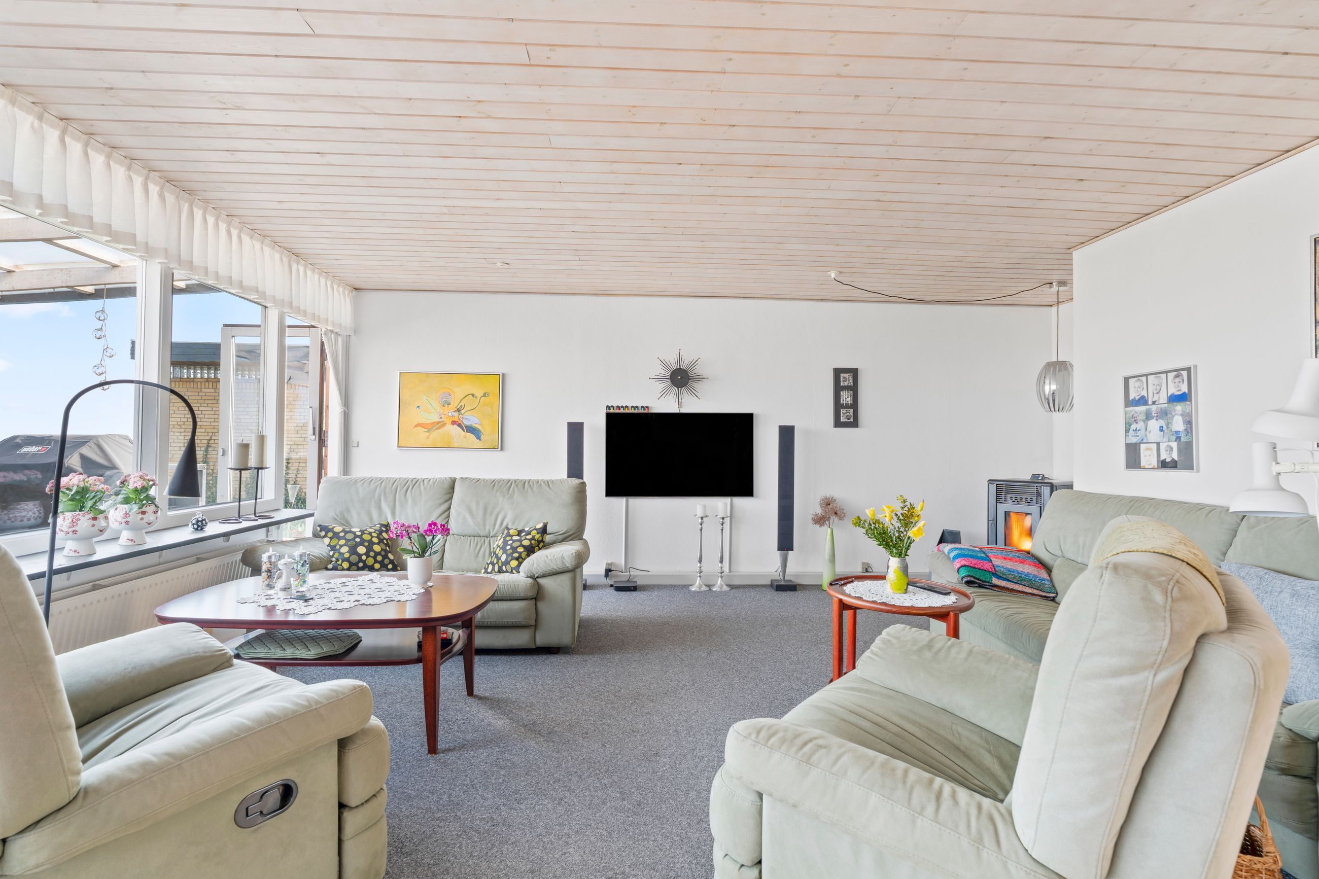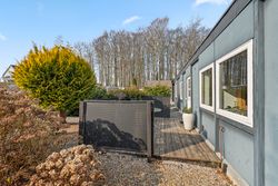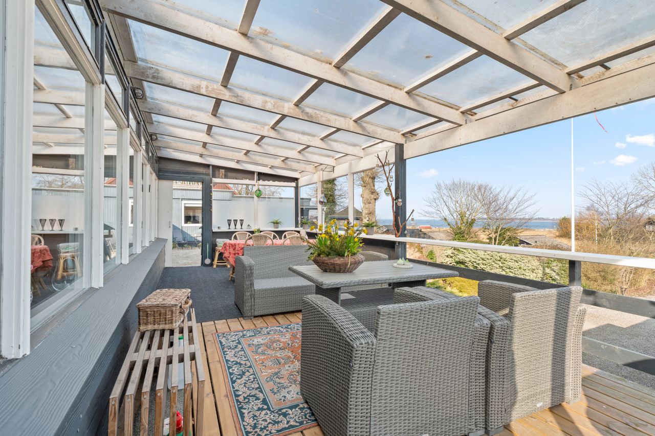 Terrassen er i en klasse for sig. Den er rummelig og perfekt til både store sammenkomster og hyggelige stunder i aftensolen. Her kan du nyde den fantastiske panoramaudsigt over vandet, mens du sidder i læ for vinden. Der er plads til både spiseområde, loungemøbler og krukker med smukke blomster, hvilket gør den til en skøn forlængelse af boligen i de varme måneder.