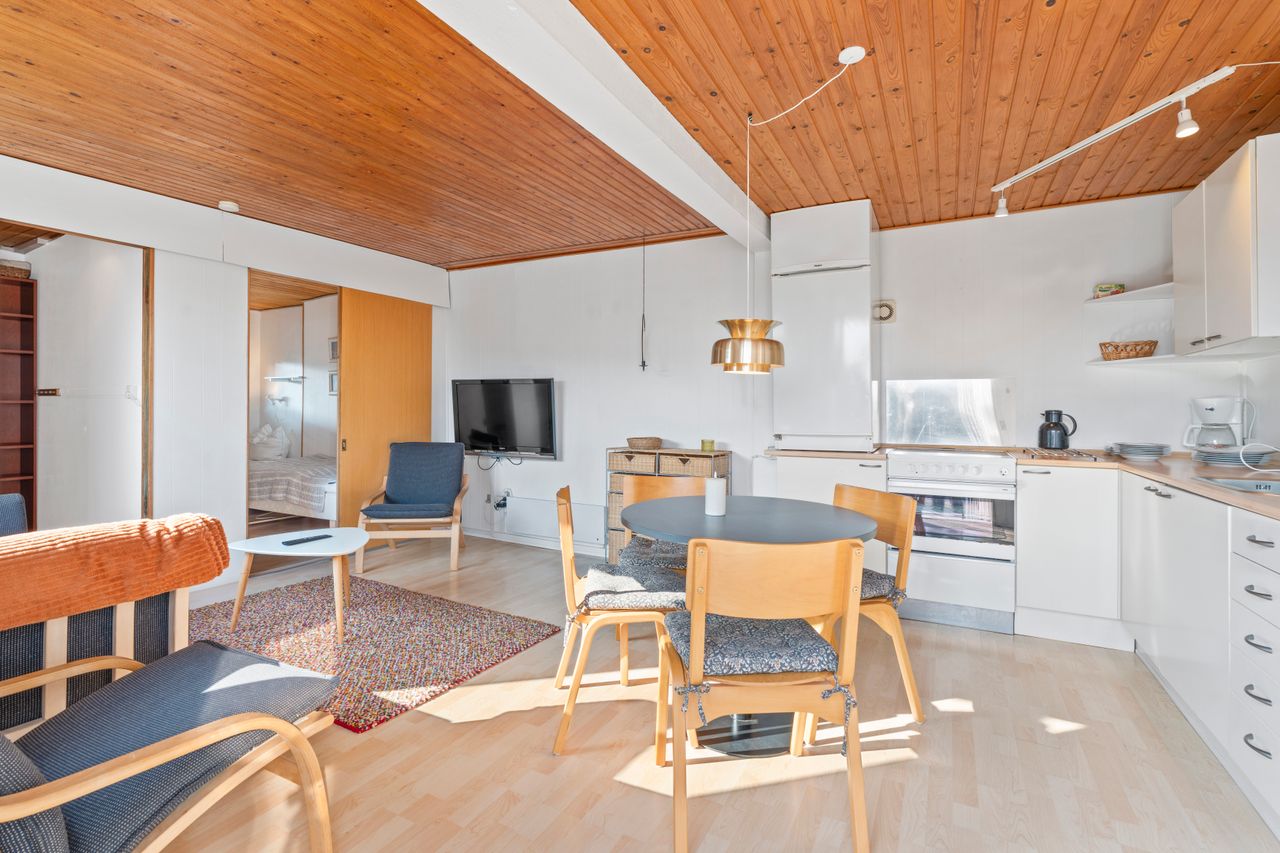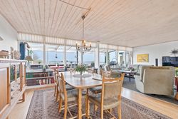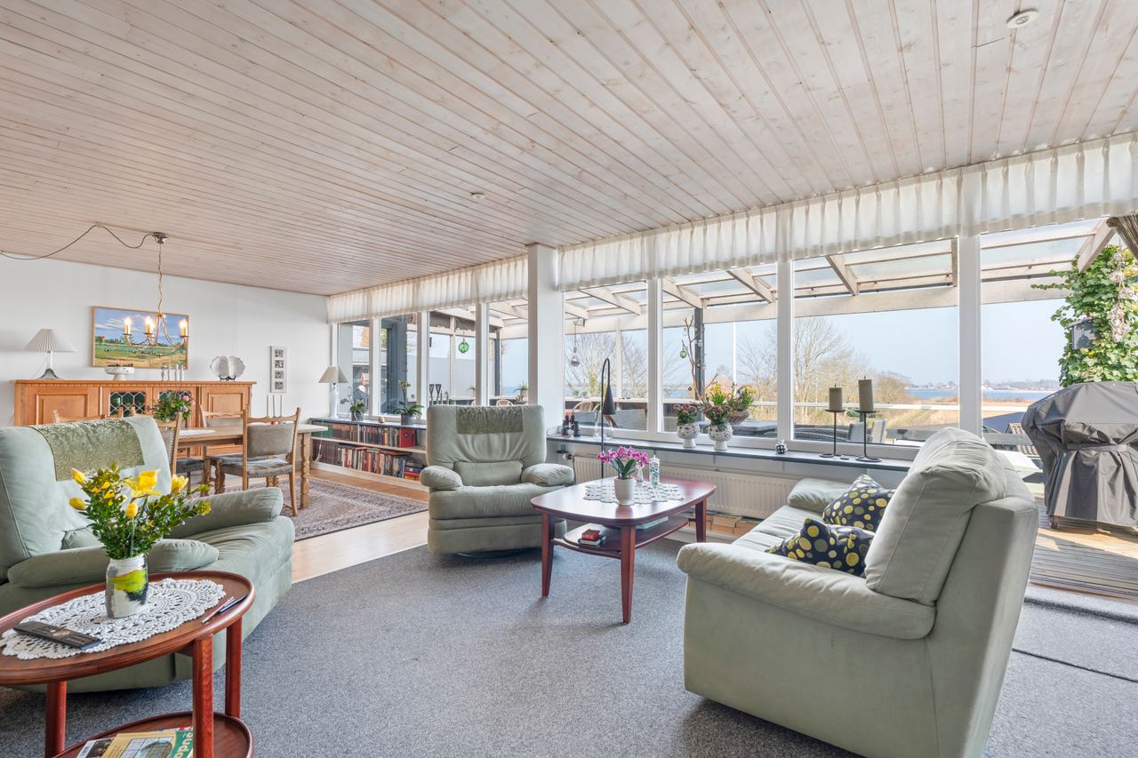 Selve hovedhuset er opført i 1963 og har et boligareal på 140 kvadratmeter. Huset fremtræder meget velholdt med løbende opdateringer, der sikrer en fin bolig. Her bydes du velkommen af en fin entré, hvor der er direkte adgang til badeværelset. Herfra tilgås husets leverum, nemlig den kæmpe store stue. De store vinduespartier sikrer et fantastisk lysindfald og giver samtidig en enestående udsigt over vandet direkte fra stuen. Herfra er der direkte adgang til den skønne terrasse, hvor udsigten kan nydes i fulde drag.
