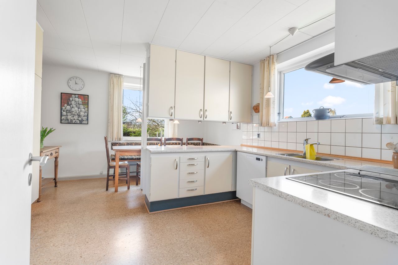 • Lyst og åbent køkken med god bordplads og direkte adgang til spisestue og opholdsstue, hvor store vinduespartier inviterer lyset indenfor.