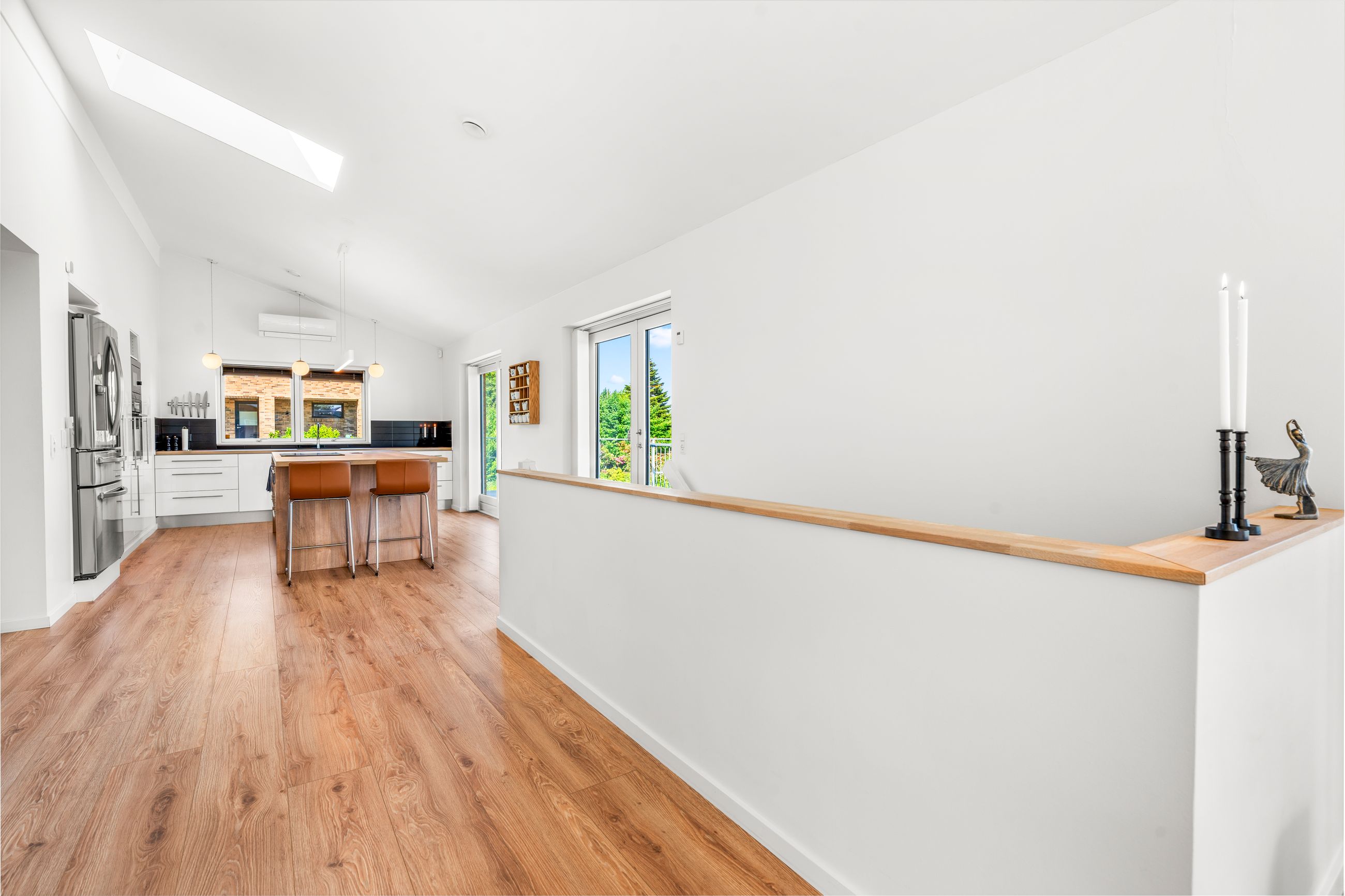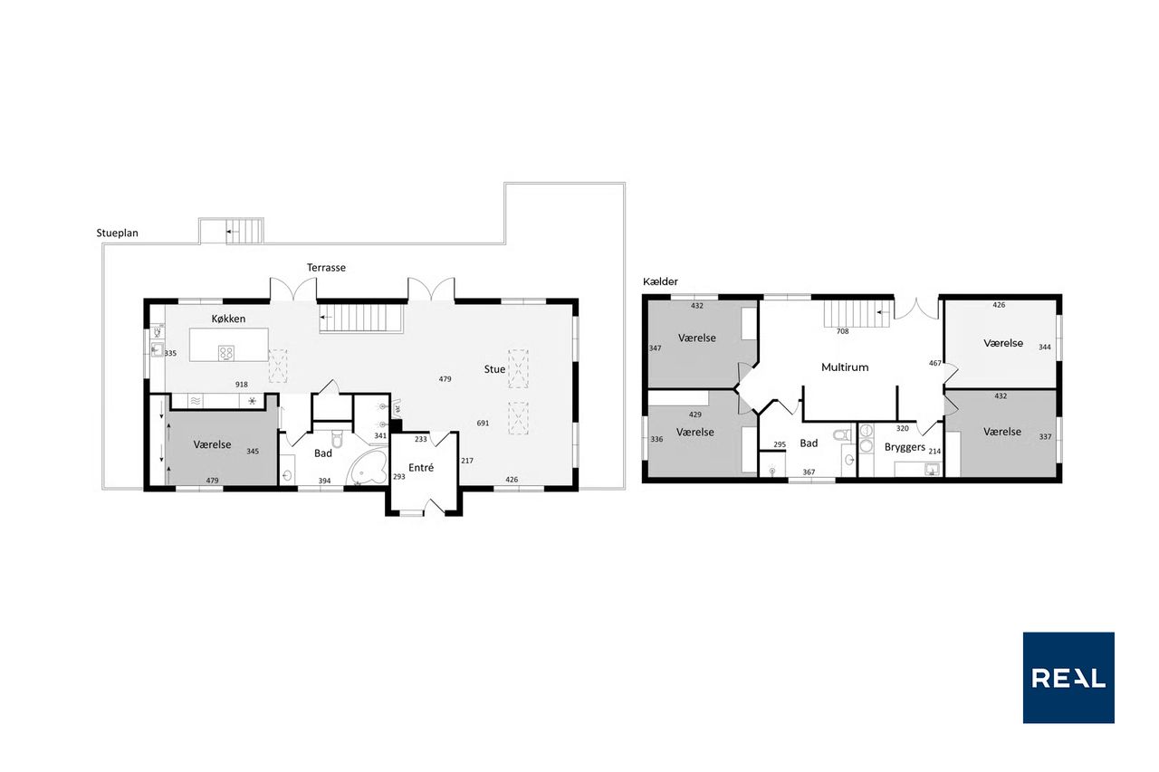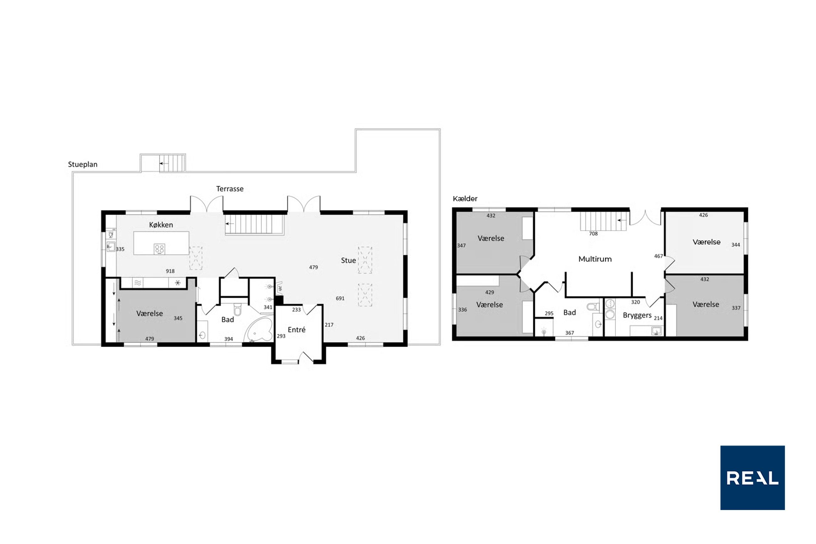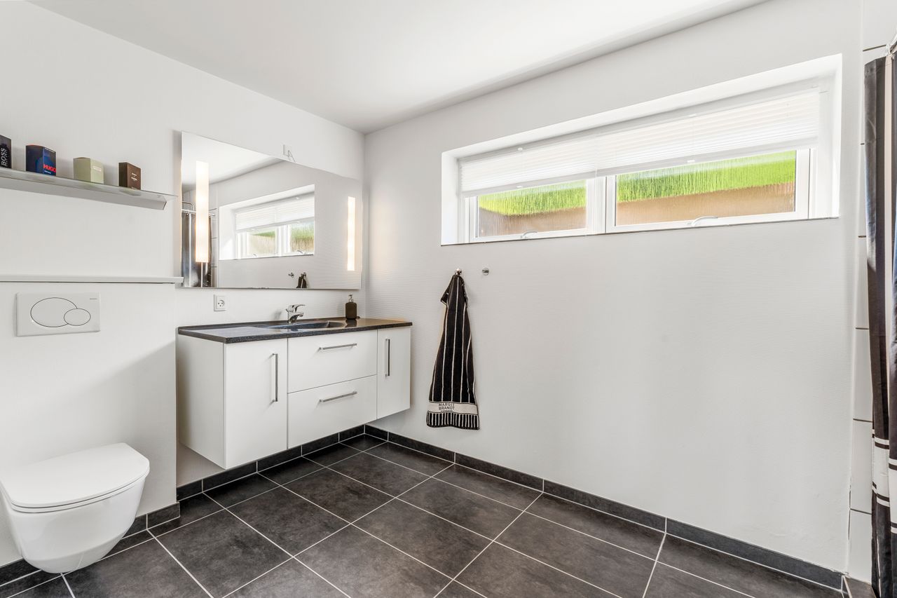 Huset rummer i alt 257 kvadratmeter bolig, hvoraf 127 kvadratmeter er placeret i underetagen. Planløsningen er gennemtænkt og funktionel med naturlig opdeling mellem voksen- og børneafdeling. I stueplan træder man ind i en præsentabel entré, der åbner op til husets store hjerterum – et åbent og lyst køkken-alrum og stue i ét, hvor udsigten og lysindfaldet spiller en central rolle. Her er masser af plads til både hverdagens gøremål og hyggelige sammenkomster. På samme etage ligger forældreafdelingen med soveværelse og eget badeværelse – en privat oase med ro og rummelighed. Fra dette plan er der flere udgange til den store terrasse, hvorfra man virkelig kan nyde udsigten og det fredelige område.