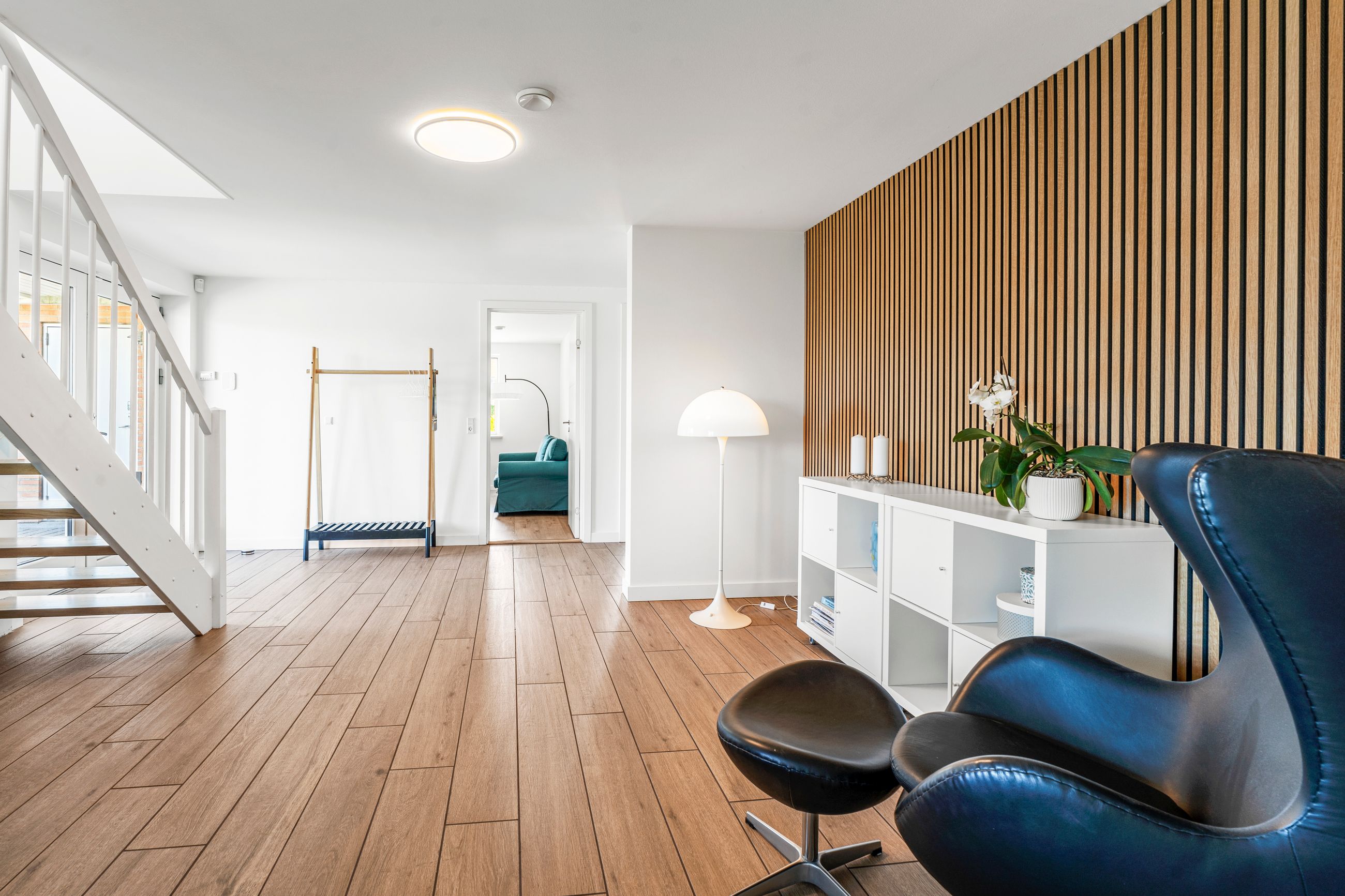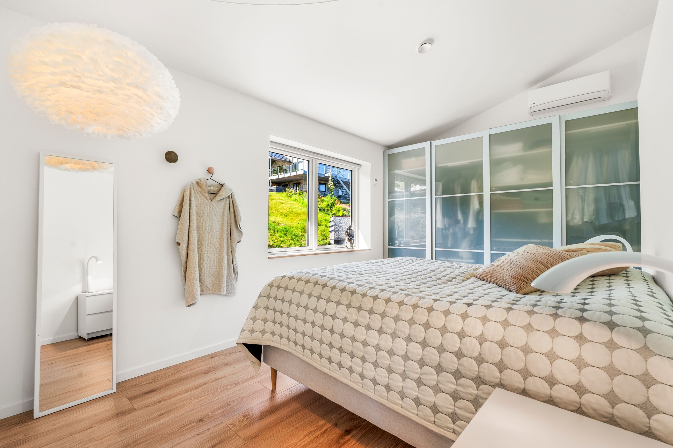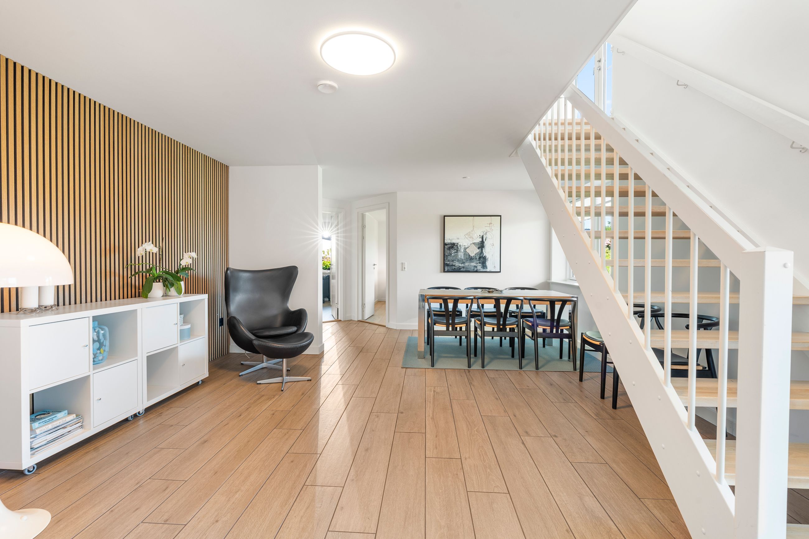 Der er gulvvarme i samtlige boligkvadratmeter, hvilket skaber en behagelig og ensartet varme hele året og giver frihed til at indrette rummene uden hensyn til radiatorer.