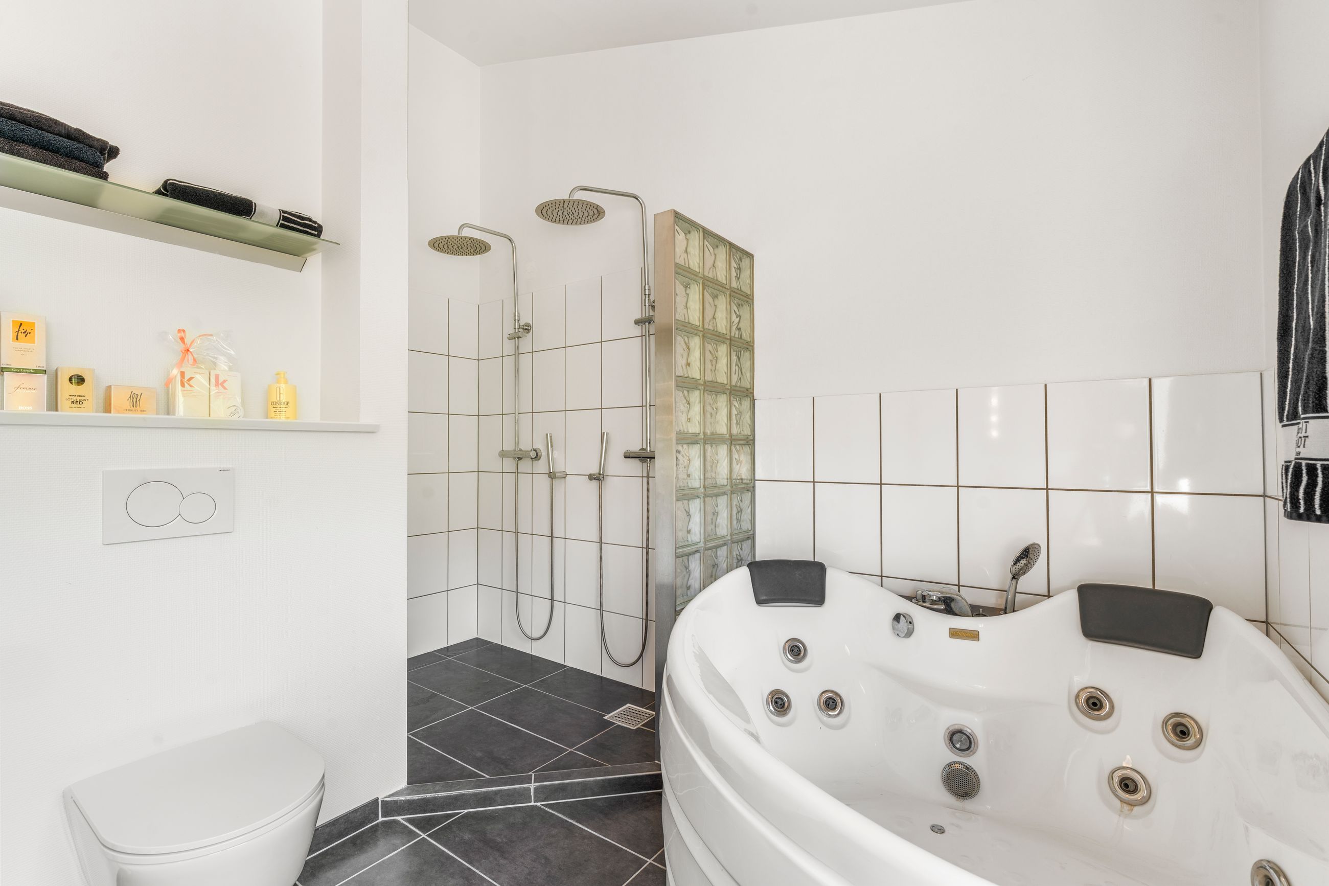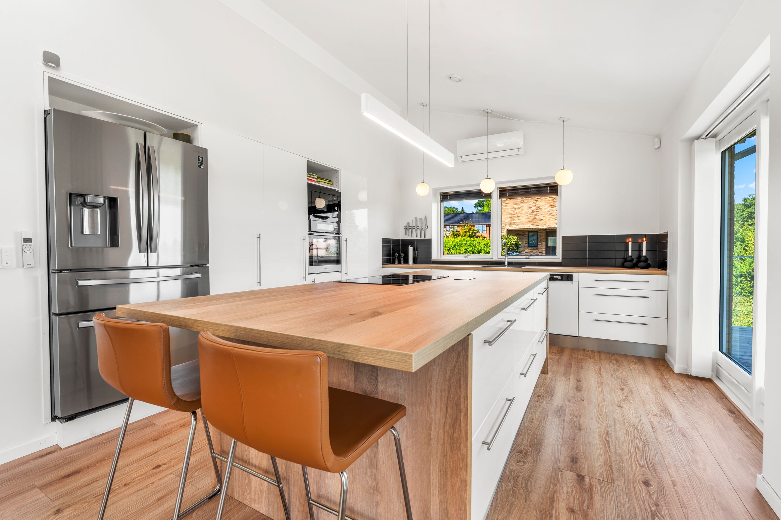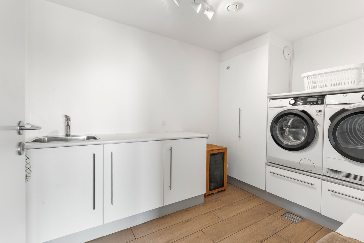 Der er gulvvarme i samtlige boligkvadratmeter, hvilket skaber en behagelig og ensartet varme hele året og giver frihed til at indrette rummene uden hensyn til radiatorer.