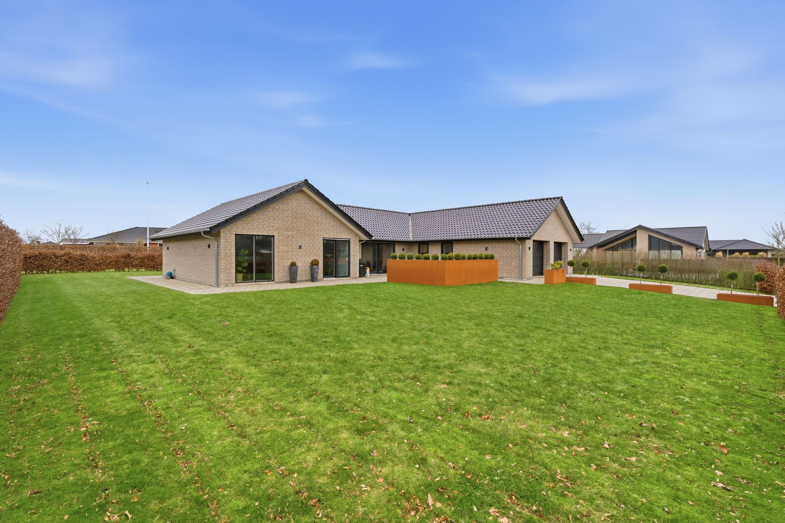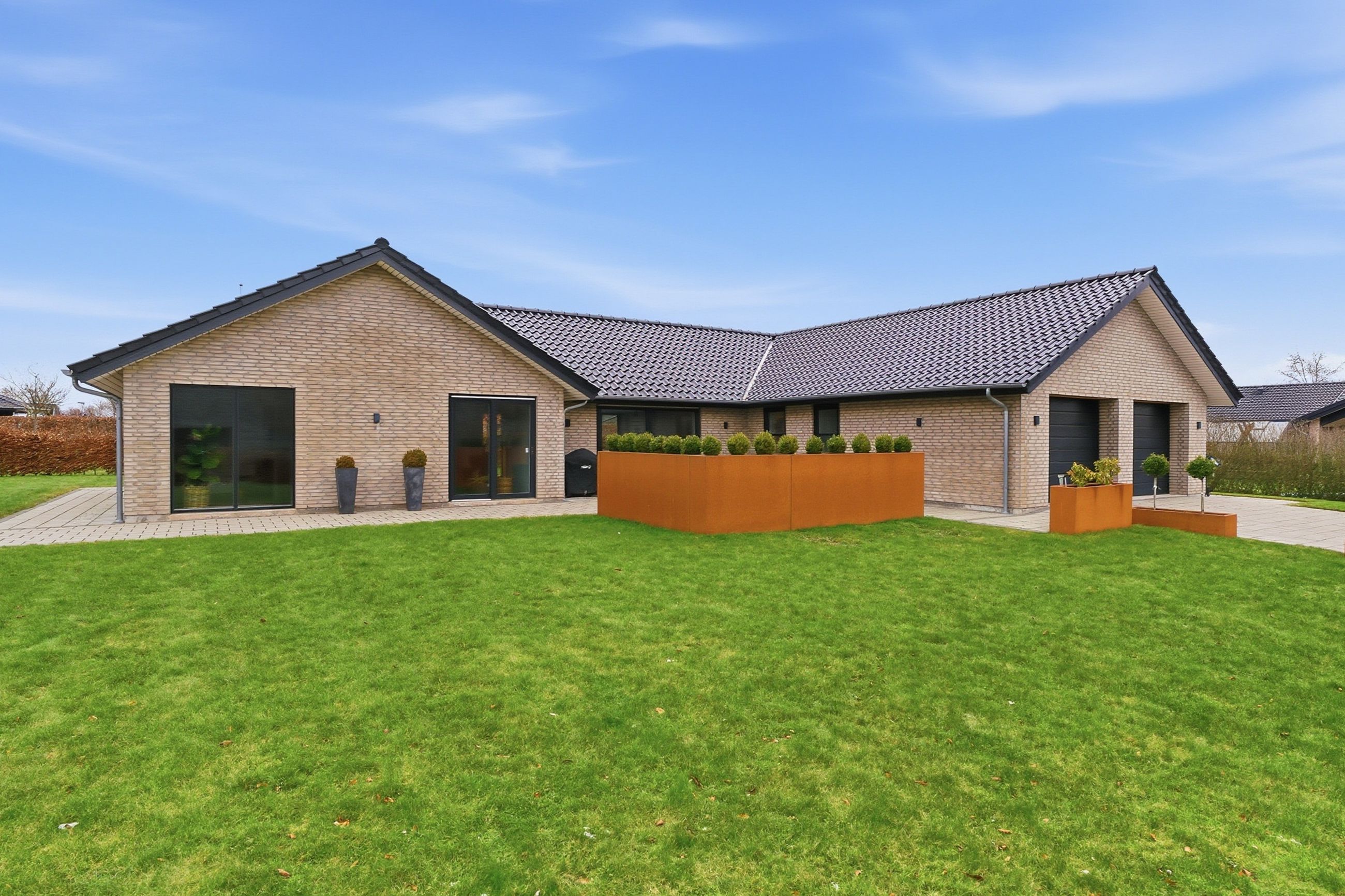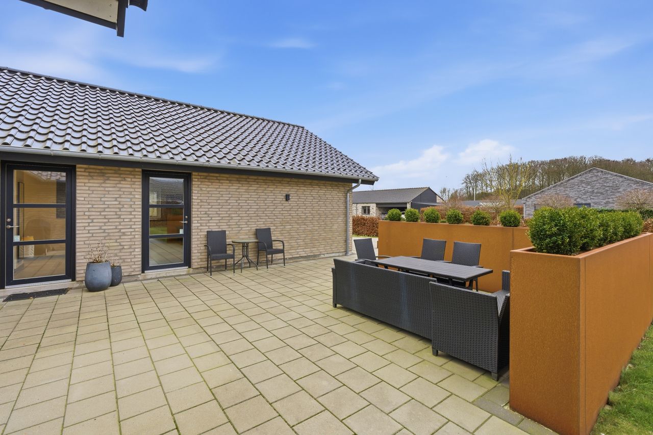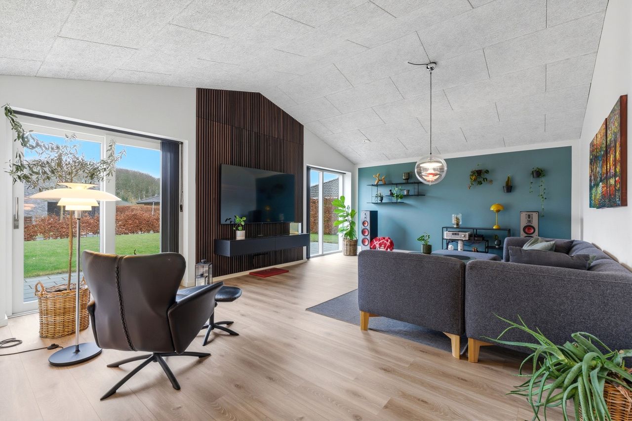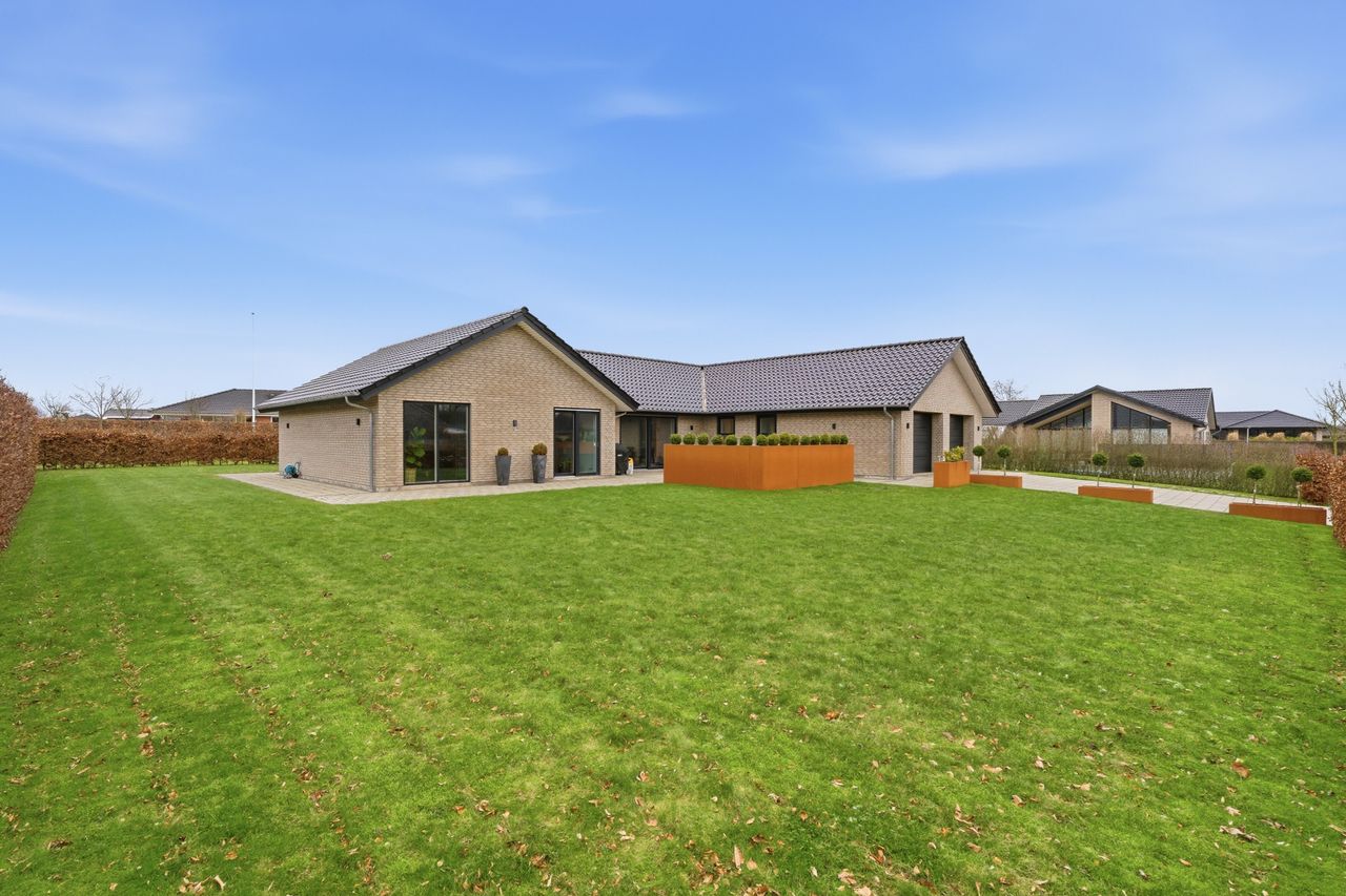 Velkommen til Steenbjerg 44 – en moderne kvalitetsvilla fra 2017 med 187 m2 bolig, hvor linjerne er rene, planløsningen gennemtænkt, og komforten helt i top.