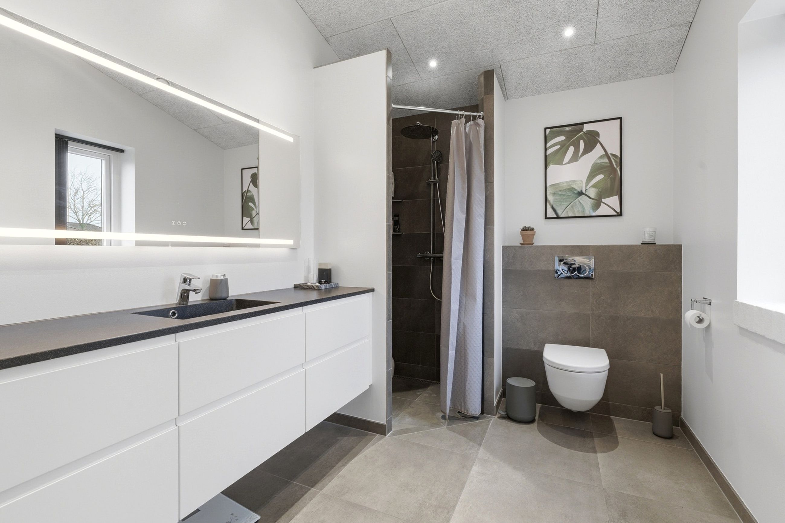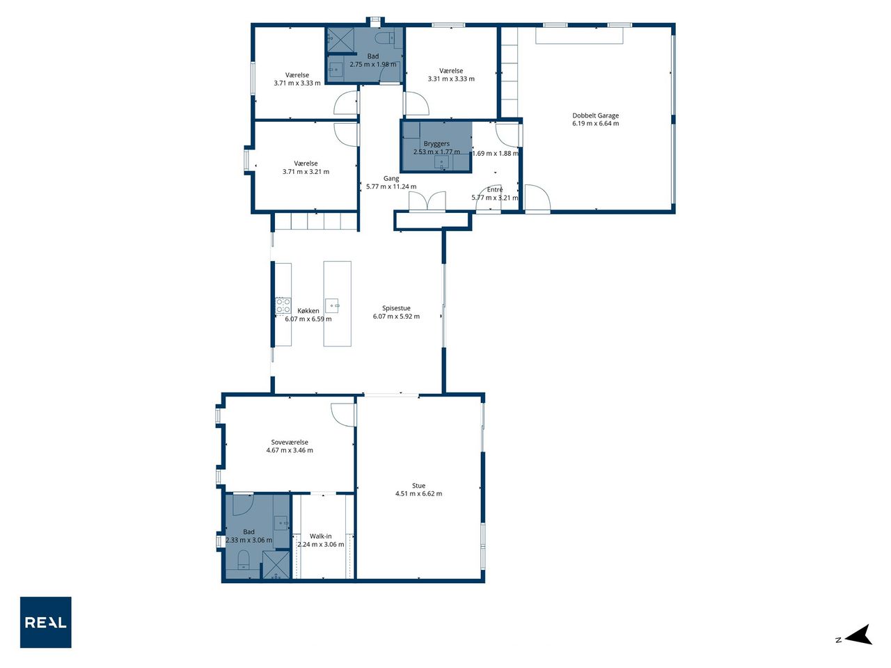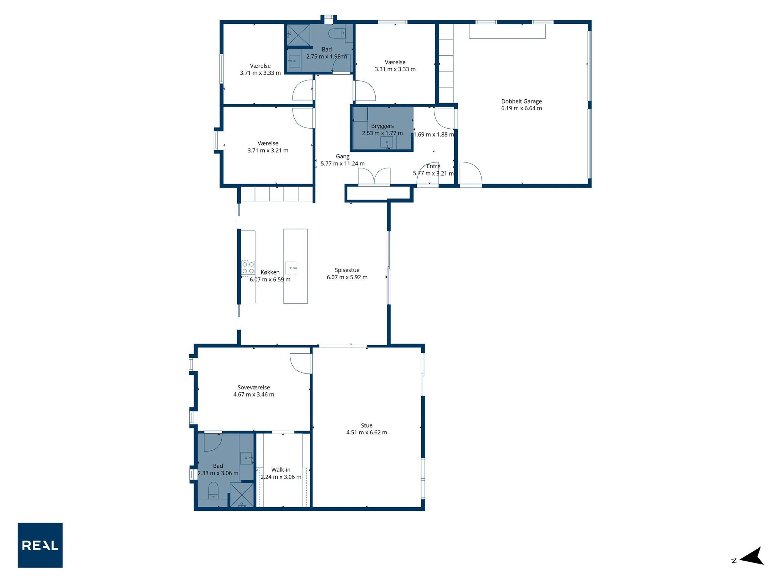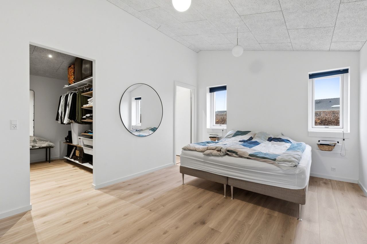 Planløsningen er ideel til familien. Boligen rummer 4 gode værelser og 2 badeværelser, fordelt med en separat forældreafdeling med eget bad og walk-in samt en børneafdeling med eget badeværelse. En løsning der giver både fællesskab og privatliv – præcis som det skal være i en moderne familievilla.