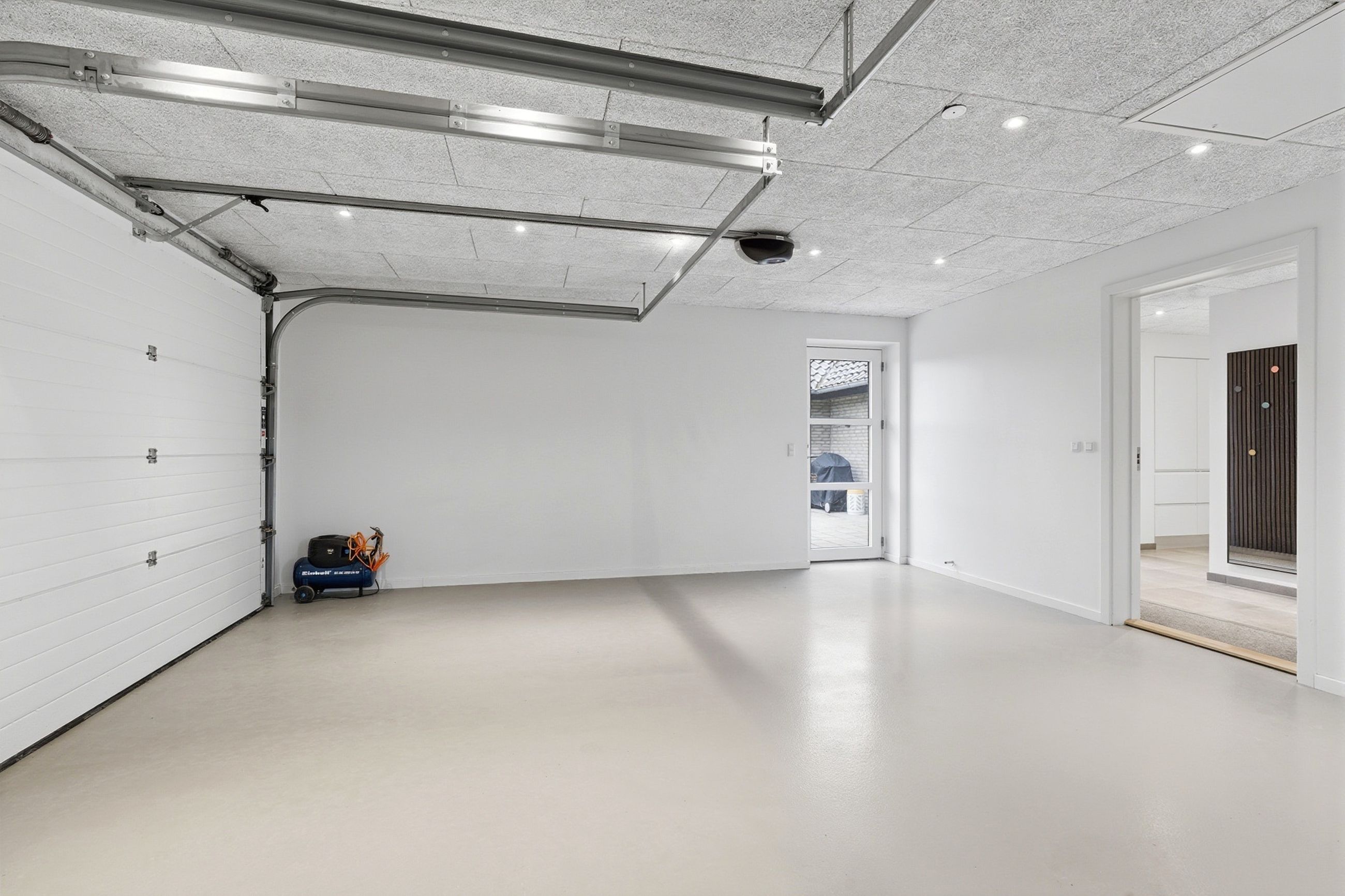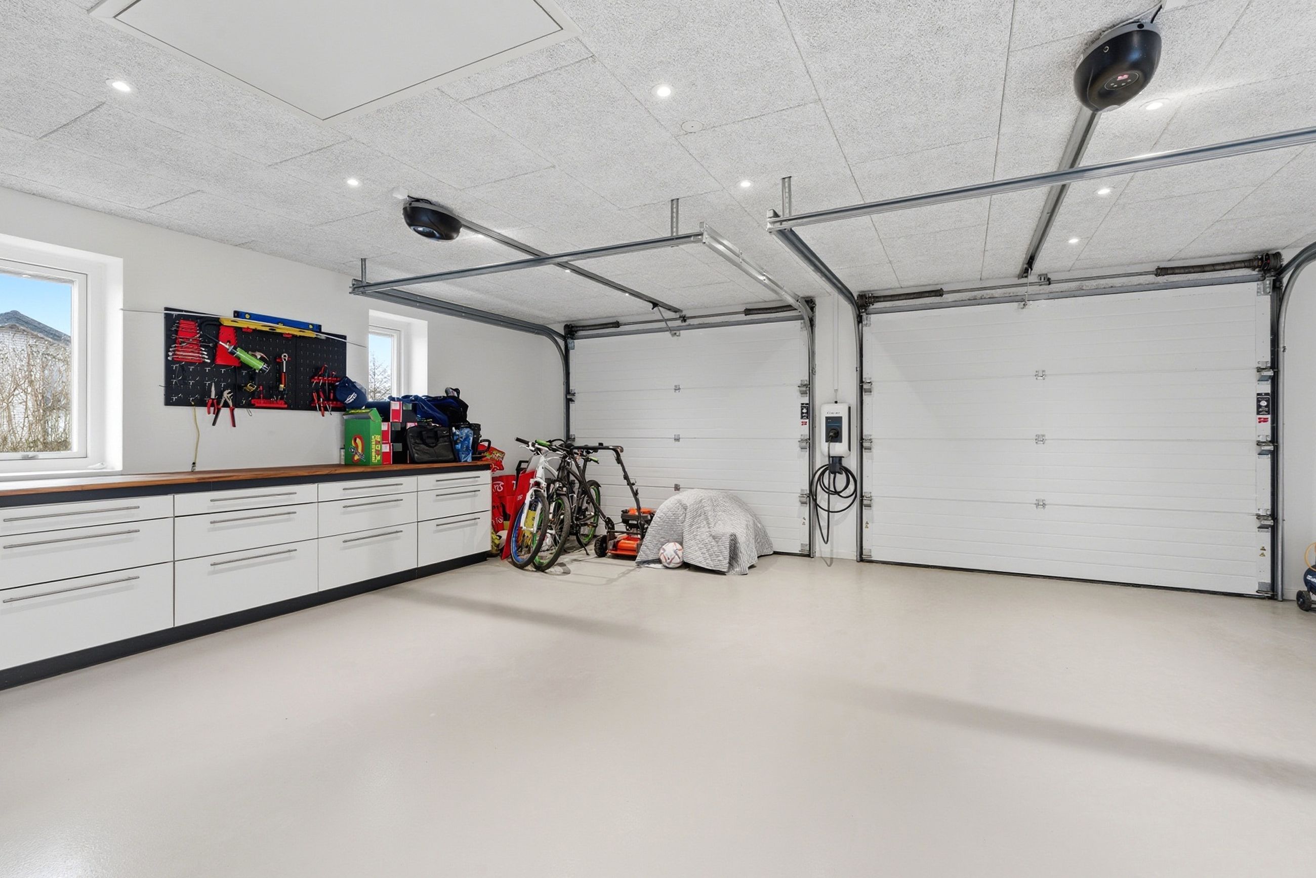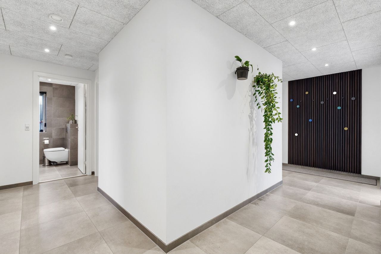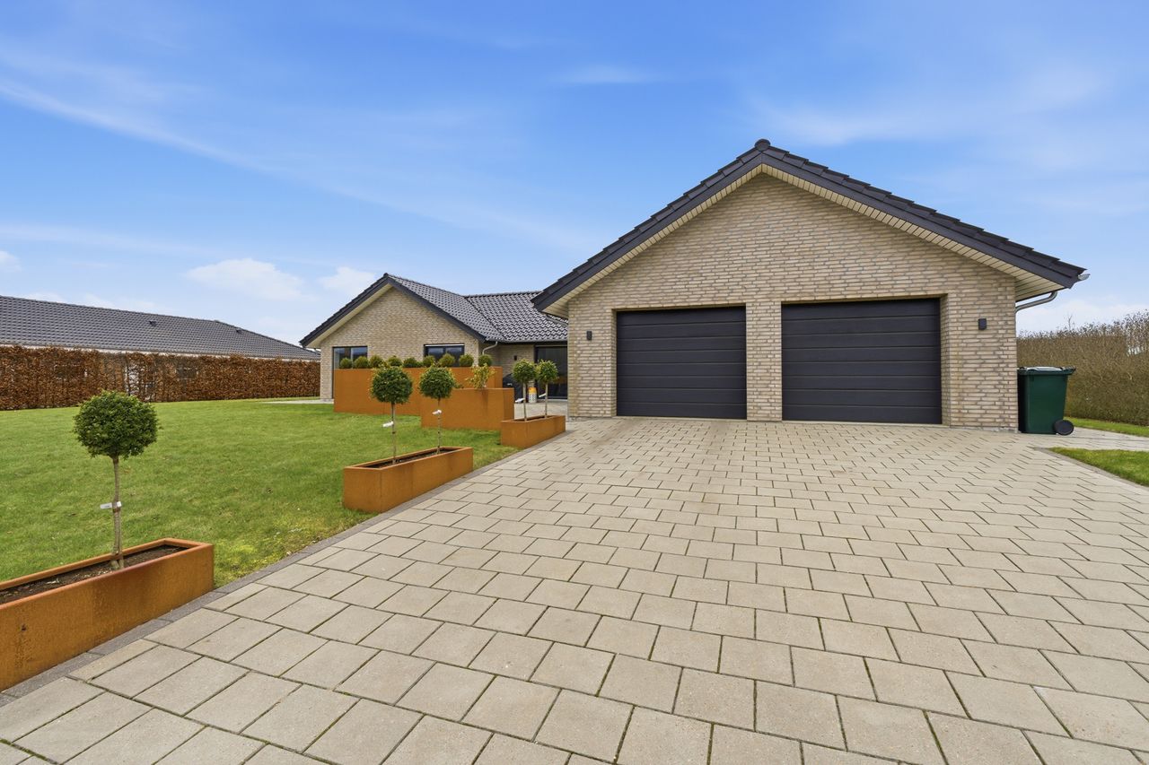 Og så til en af de helt store kvaliteter: Den 47 m2 integrerede dobbeltgarage med to porte og gulvvarme. Her får du ikke bare plads til bilerne – men et opvarmet, anvendeligt ekstra rum, der kan bruges til hobby, værksted, træning eller ekstra opbevaring året rundt. Det er en luksus, man først forstår værdien af, når man har den.