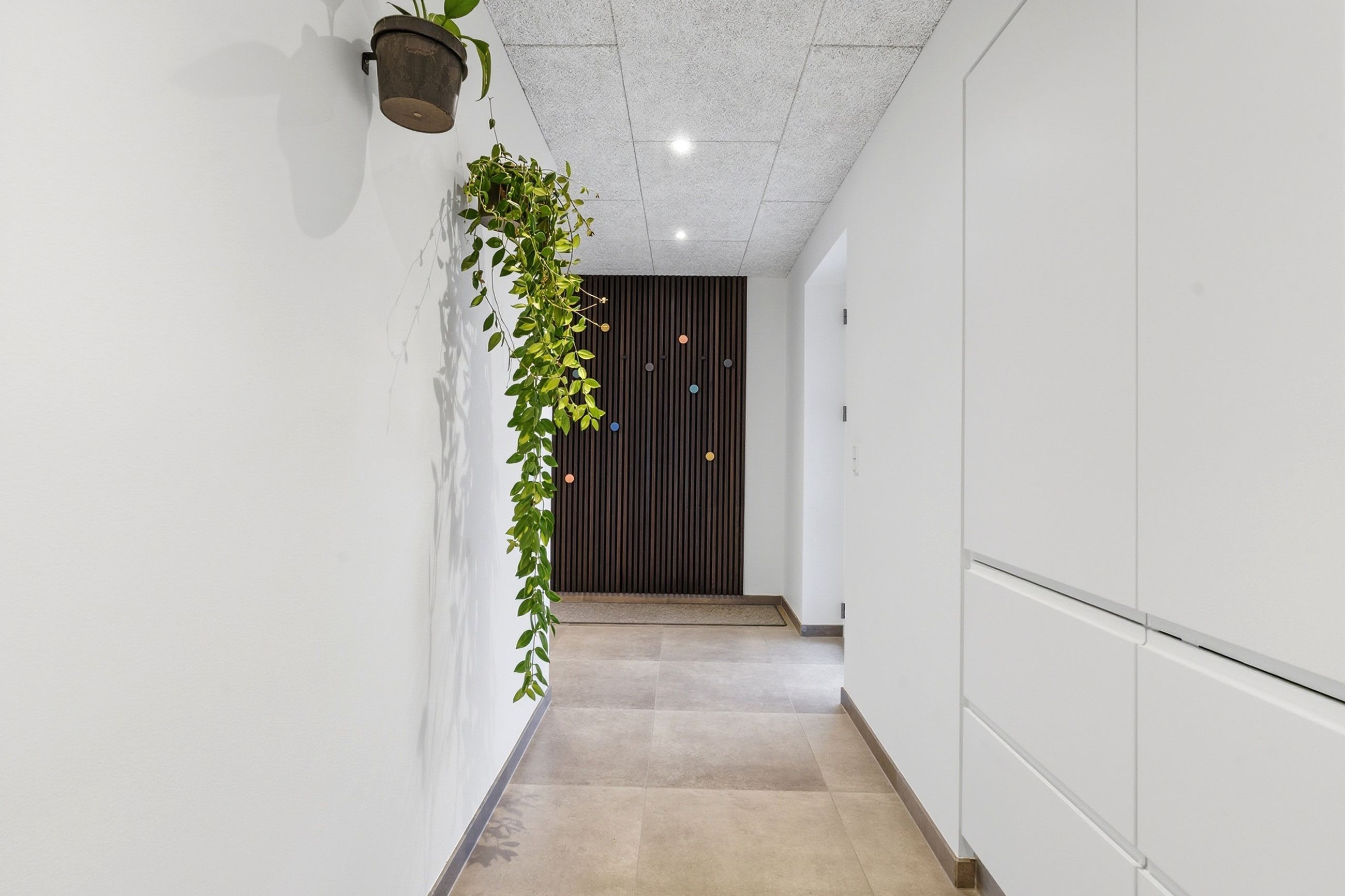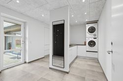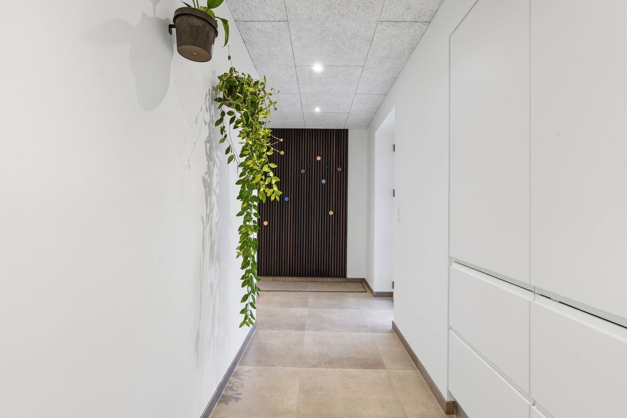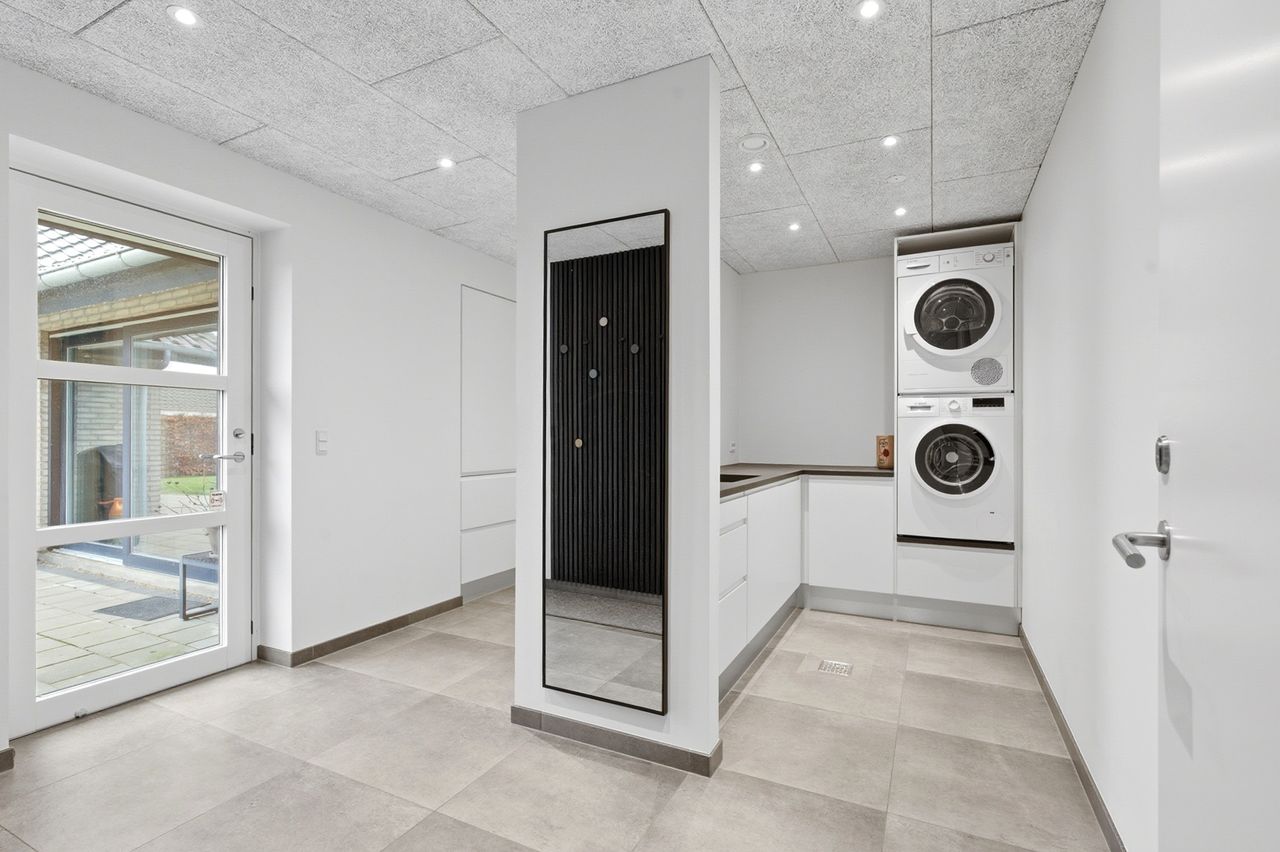 Bryggerset fungerer som en praktisk hverdagssluse med god opbevaringsplads og direkte adgang fra den integrerede garage.