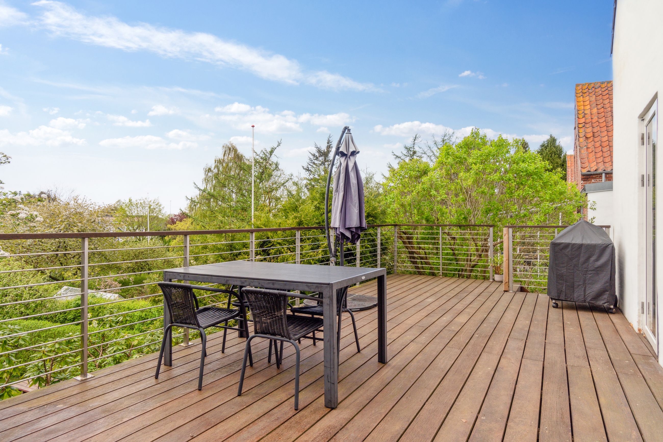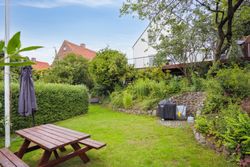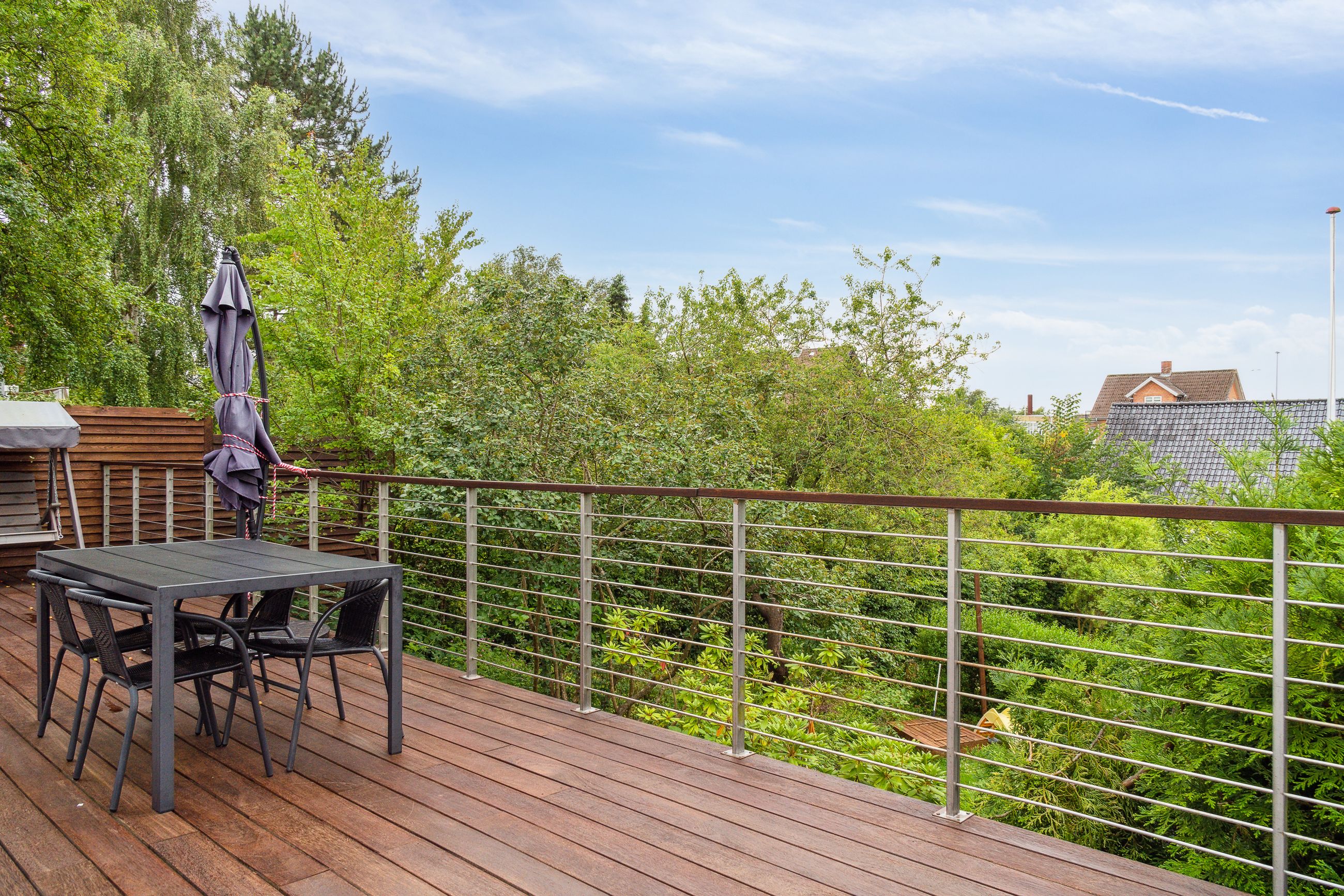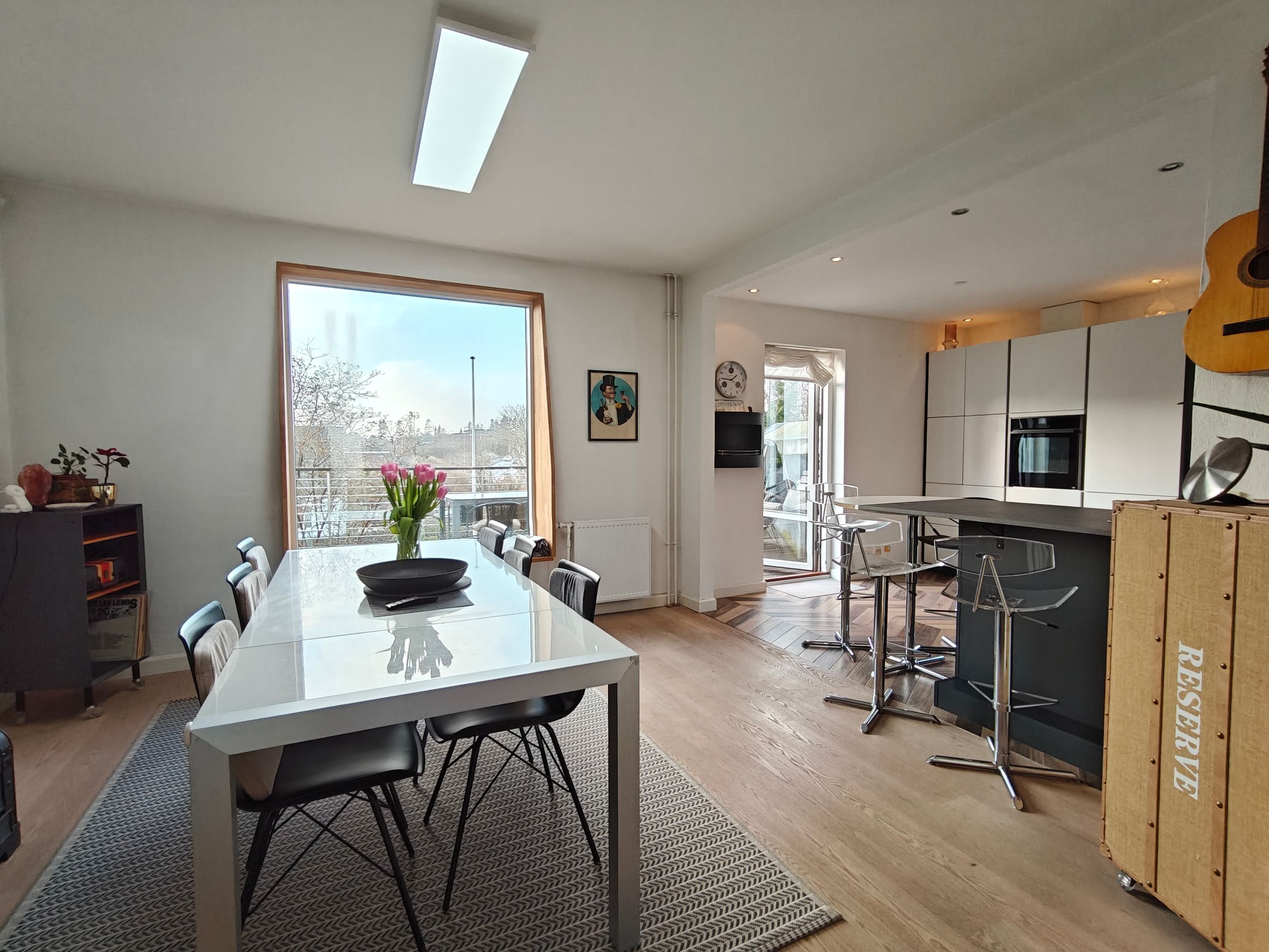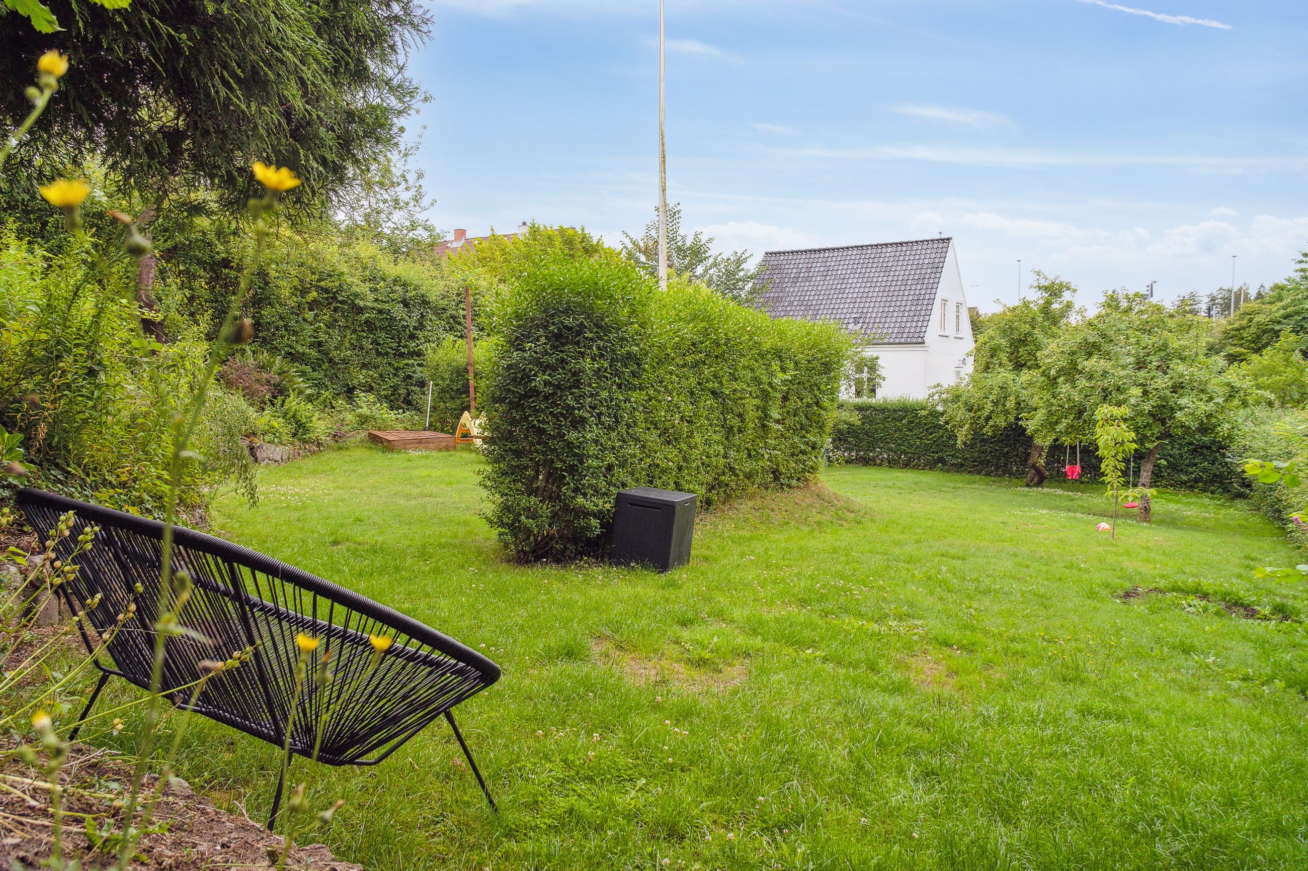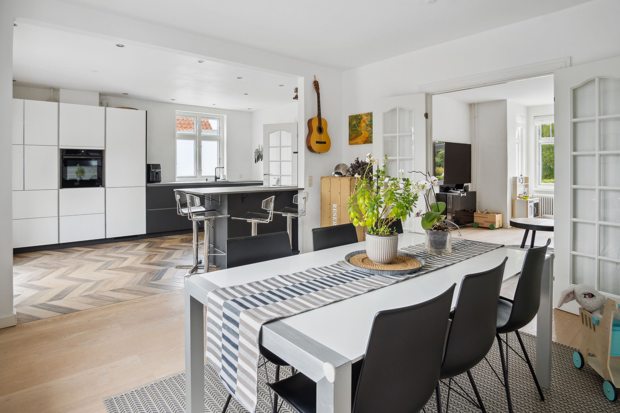 Udenfor kan familien samles på den store træterrasse eller i den hyggelige gårdhave, mens den opvoksede have byder på æbletræer og solrige kroge. Kælderen rummer 64 ekstra kvadratmeter, der kan anvendes til alt fra opbevaring og fitness til legeområde for børnene.
