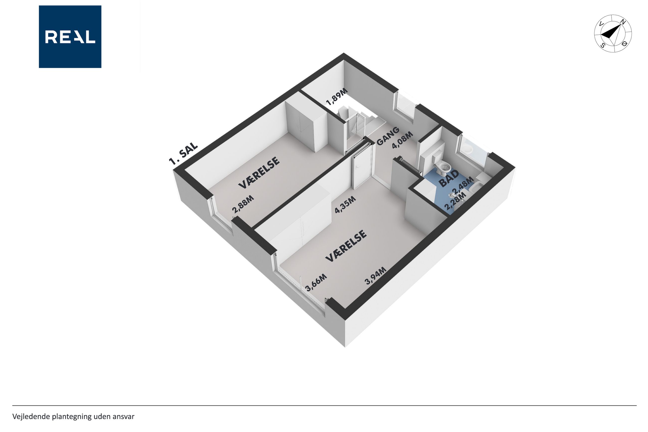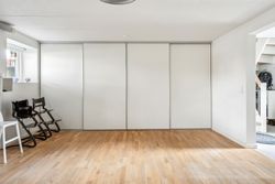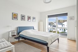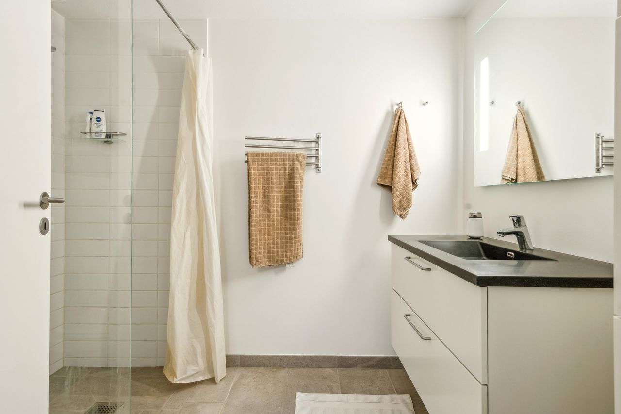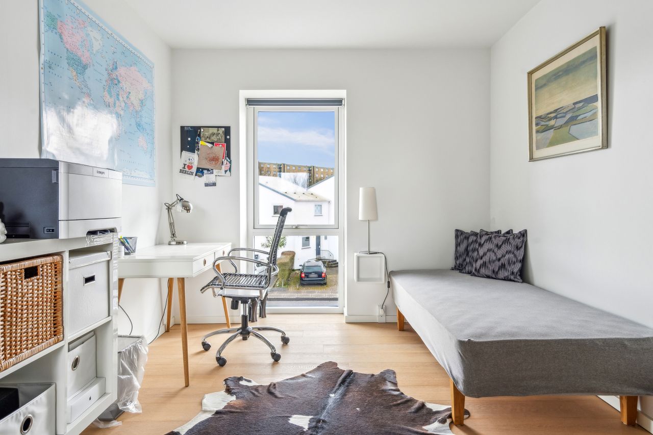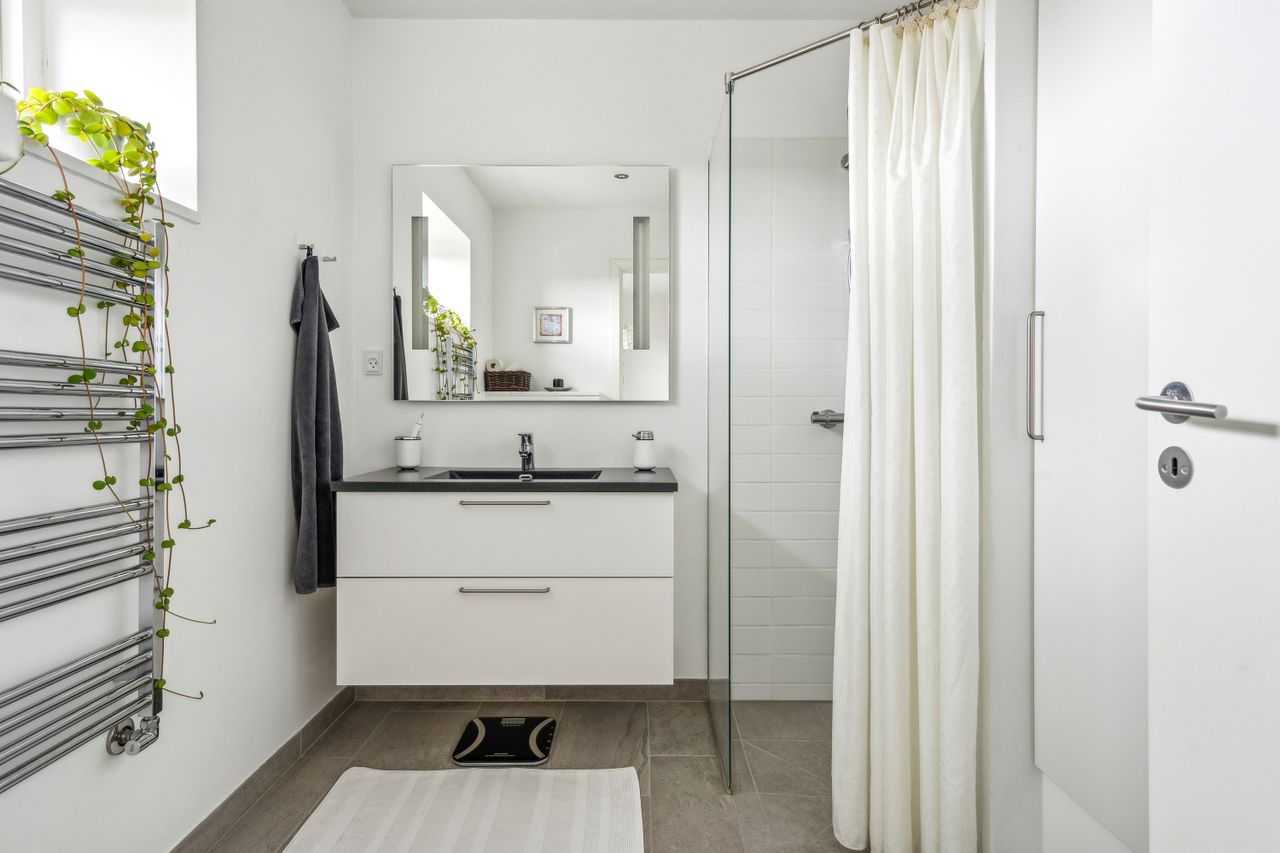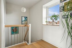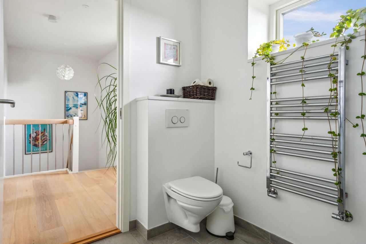 På førstesalen, næsten udsigt til Aarhus Bugten, finder du 2 gode værelser samt endnu et badeværelse med bruseniche.