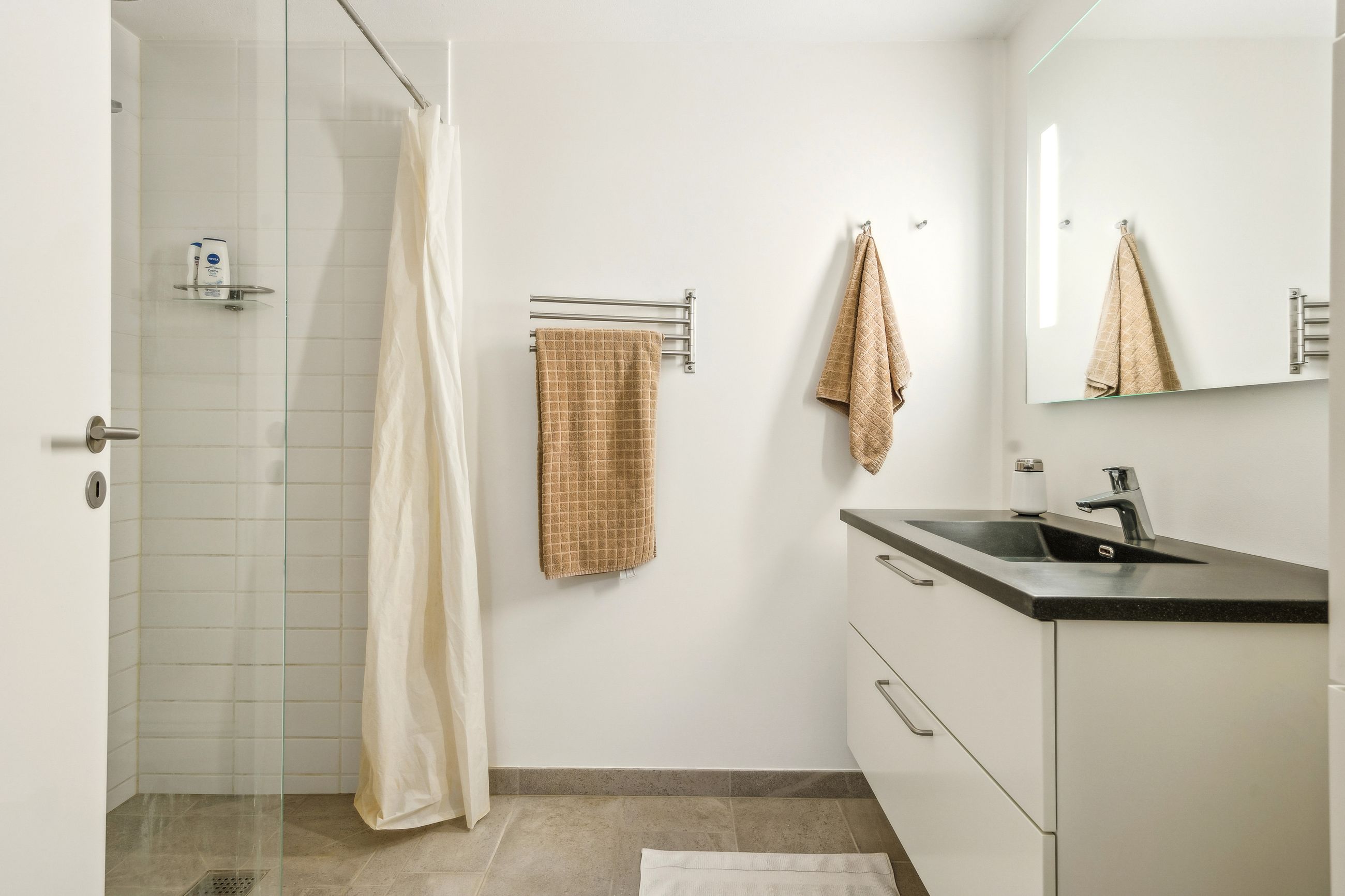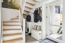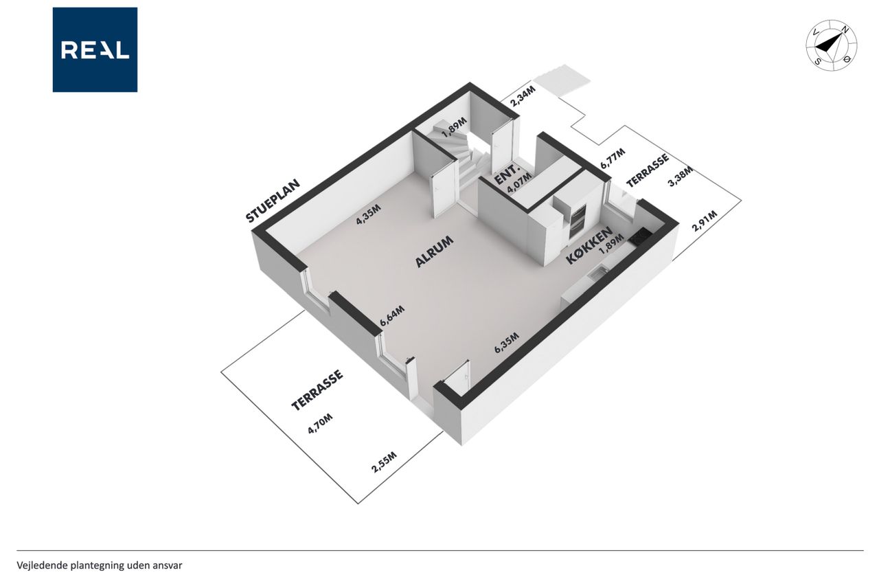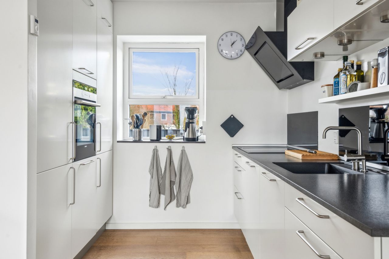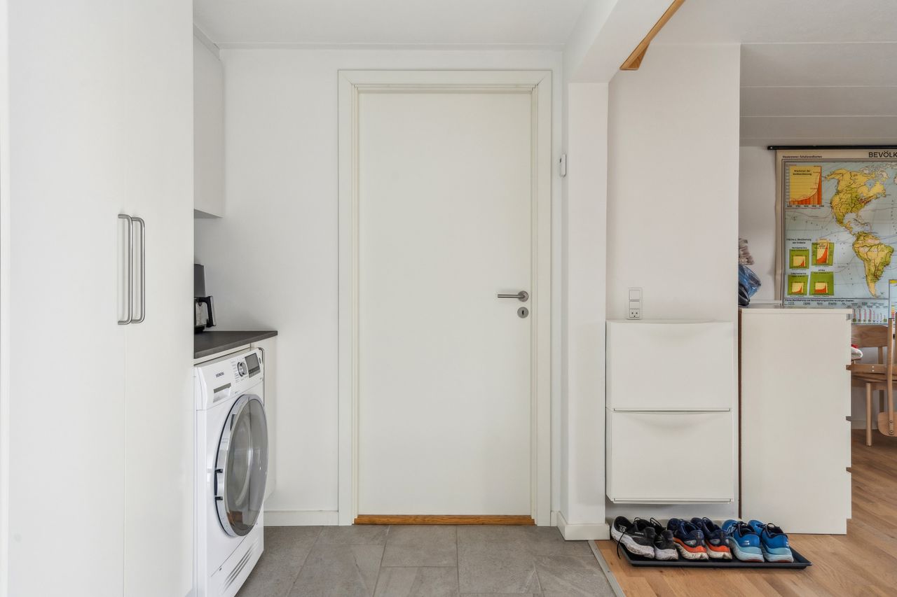I stueetagen træder du ind i en rummelig entré med god opbevaringsplads. Herfra er der adgang til et stilrent badeværelse med bruseniche samt et praktisk bryggers. Husets hjerte er det store køkken-alrum med åben forbindelse til stuen, hvilket skaber en lys og luftig atmosfære. Køkkenet er fra HTH og udstyret med moderne hvidevarer fra Siemens. Fra alrummet er der direkte udgang til en dejlig, stor og solrig terrasse.