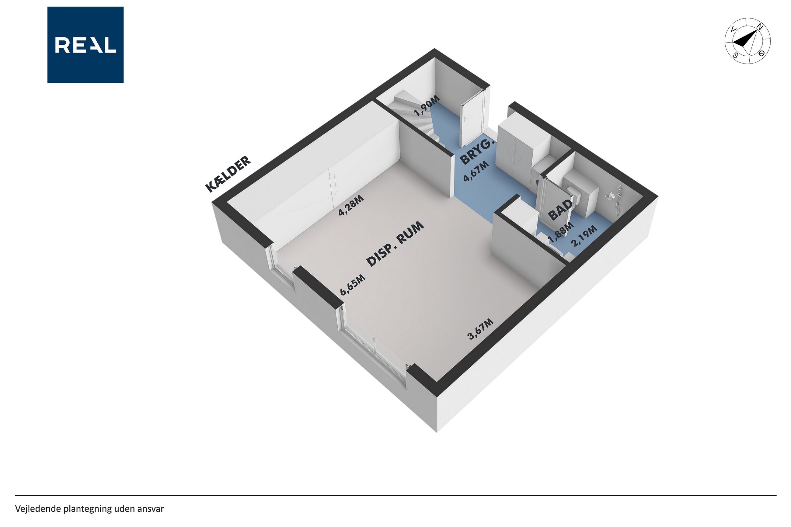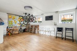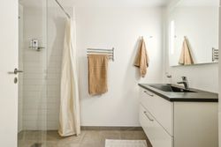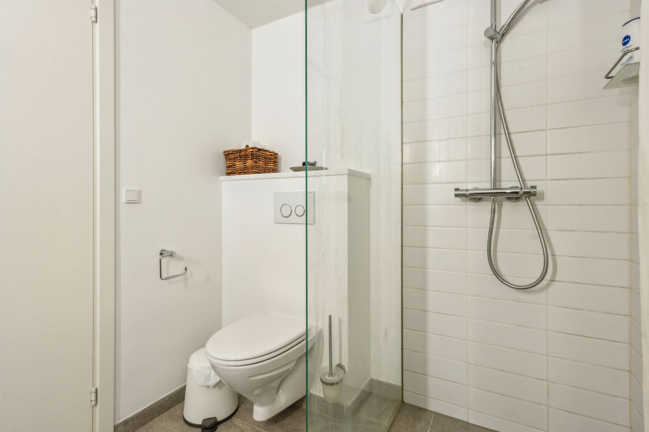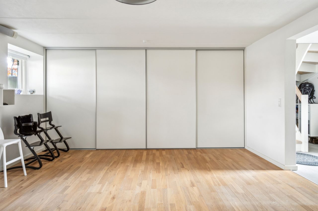 Kælderen er lys, højloftet samt materialer og den gode flotte stil fra resten af boligen går igen, så her har I et ekstra badeværelse, i samme kvalitet på på 1. salen, udgang til forhaven, således cykler/barnevogne nemt kan køres ned i kælderen. Hertil et kæmpe disp. rum med vinduer og stor skydeskabsvæg