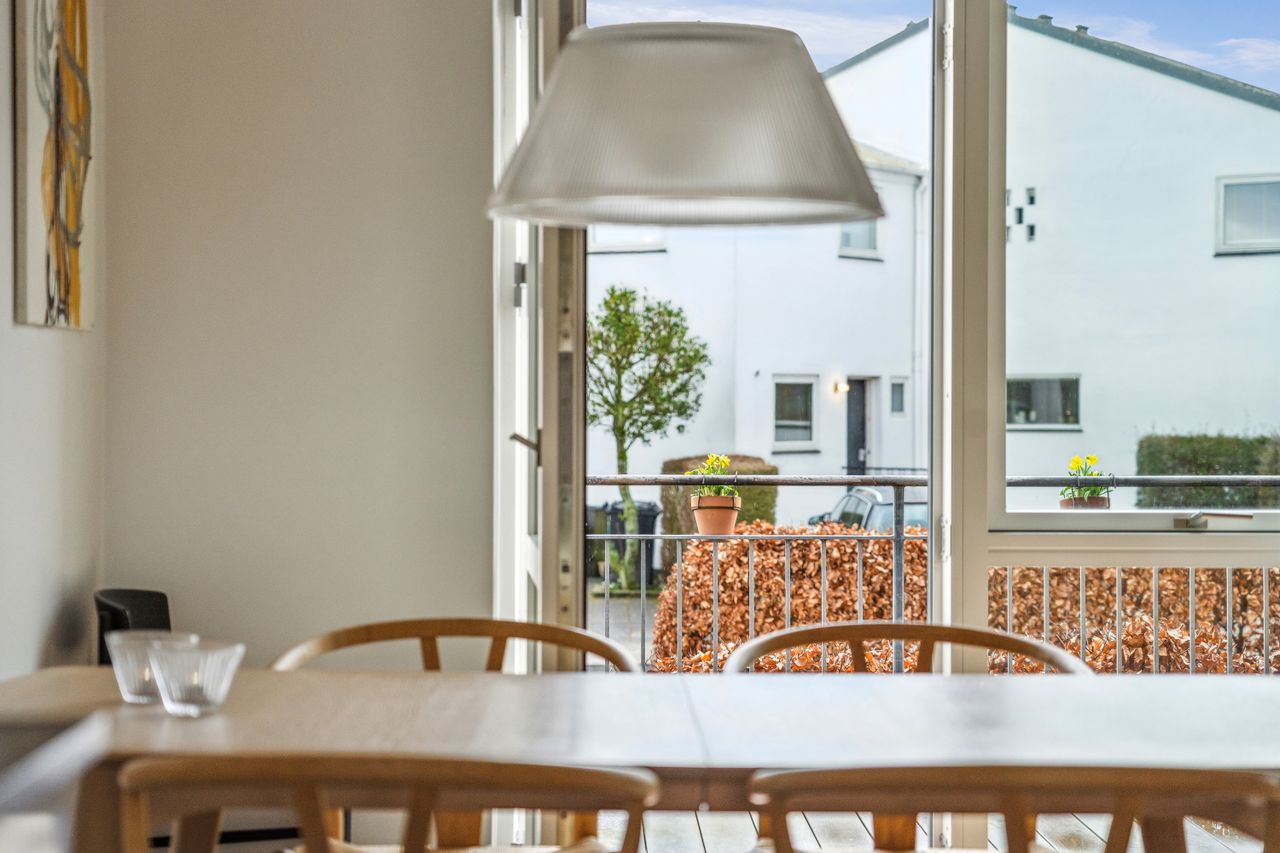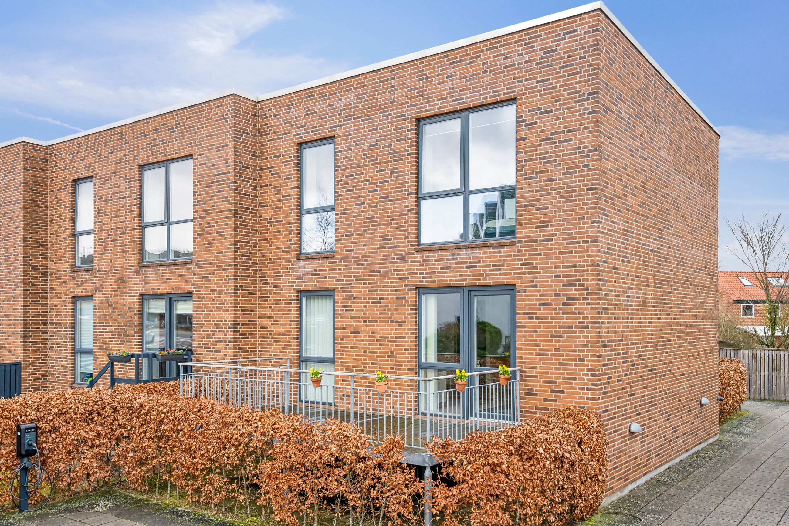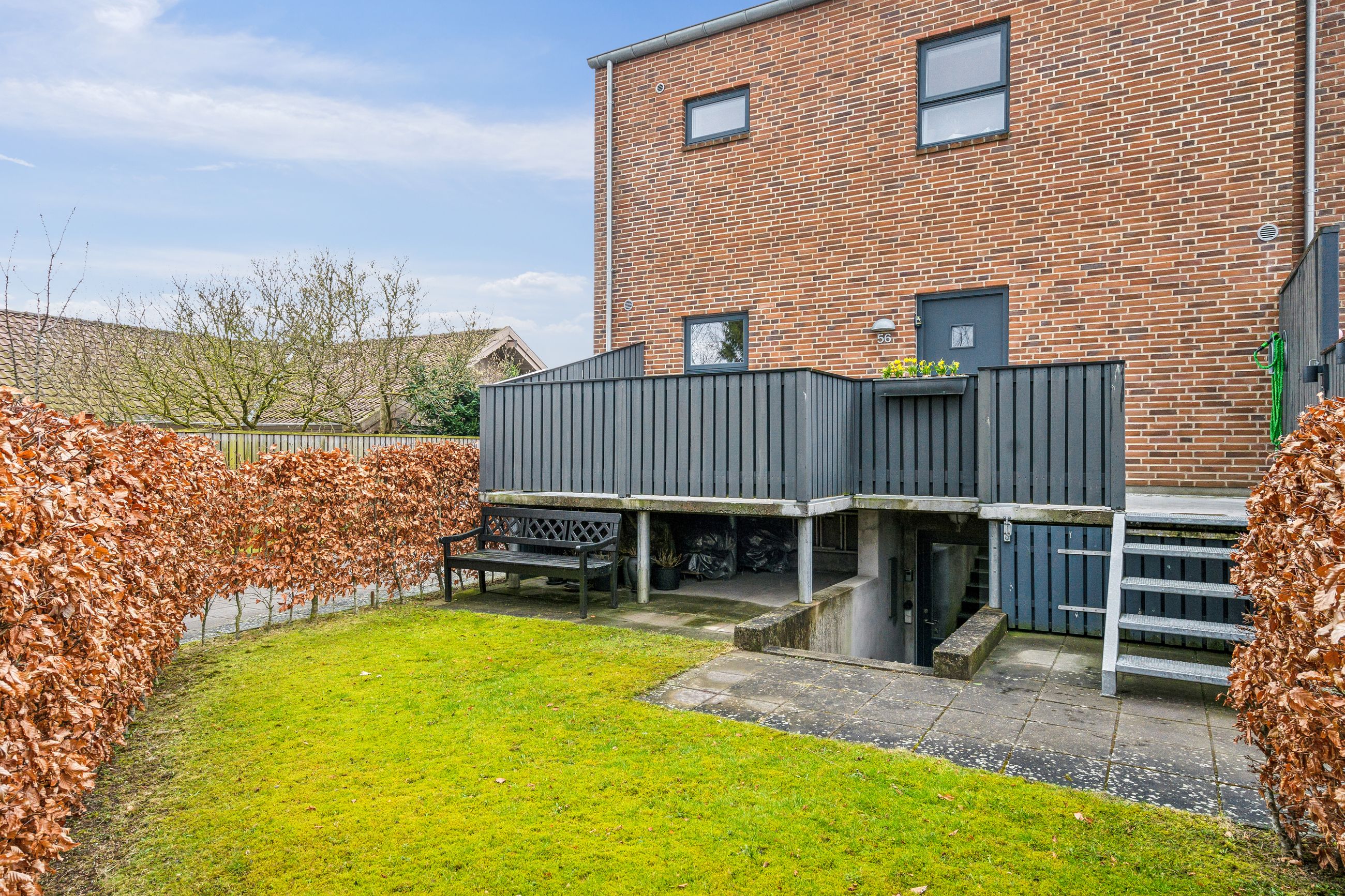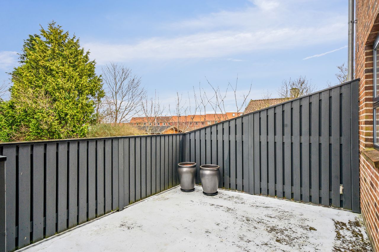 I bliver mødt af en lukket forhave, omkranset af en stor og flot bøgehæk, hvor morgens tidlige solstråler kan nydes helt i fred og ro, herfra går en trappe op til en ekstra morgenterrasse med let adgang til boligen via entredøren.