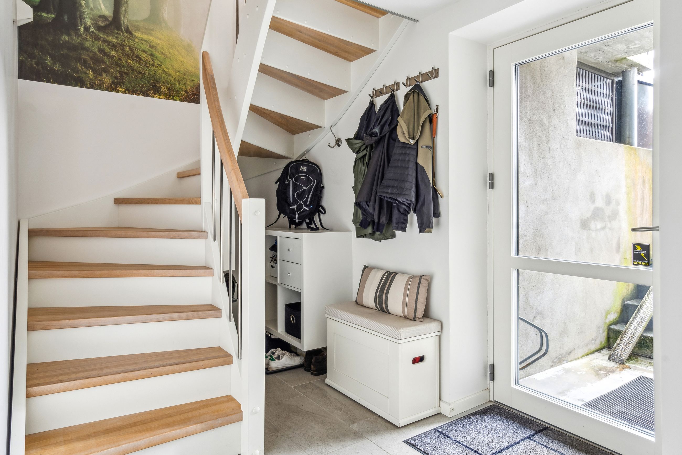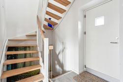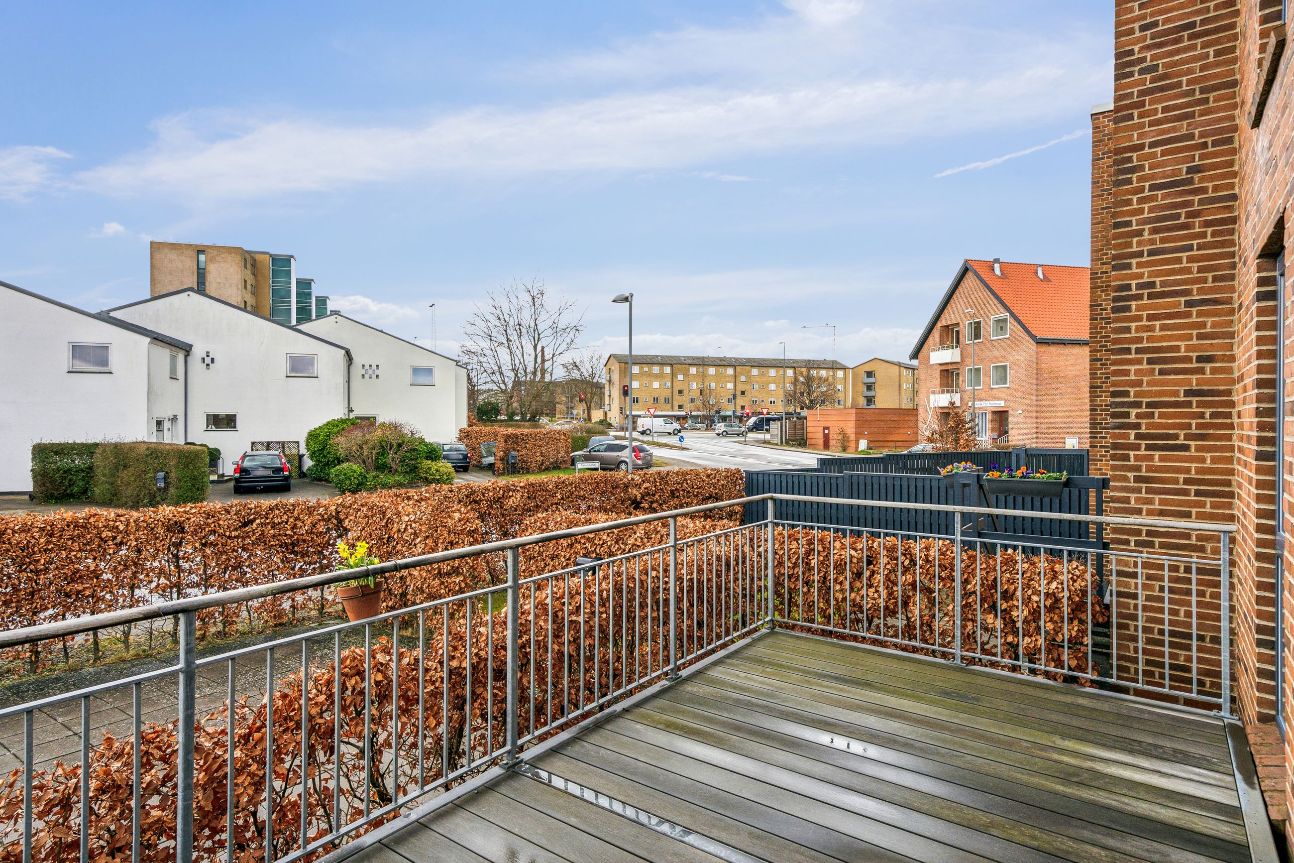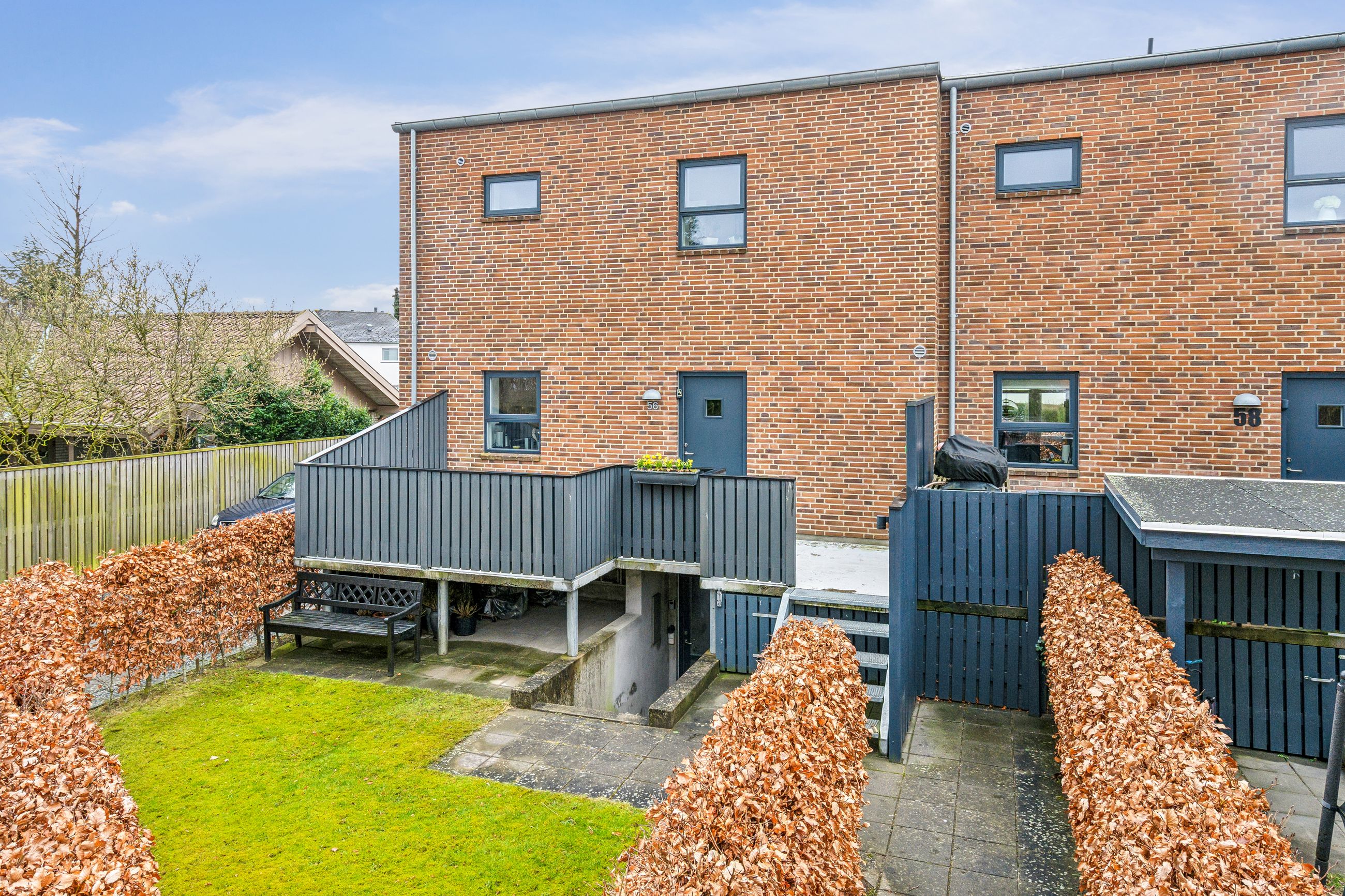 I bliver mødt af en lukket forhave, omkranset af en stor og flot bøgehæk, hvor morgens tidlige solstråler kan nydes helt i fred og ro, herfra går en trappe op til en ekstra morgenterrasse med let adgang til boligen via entredøren.