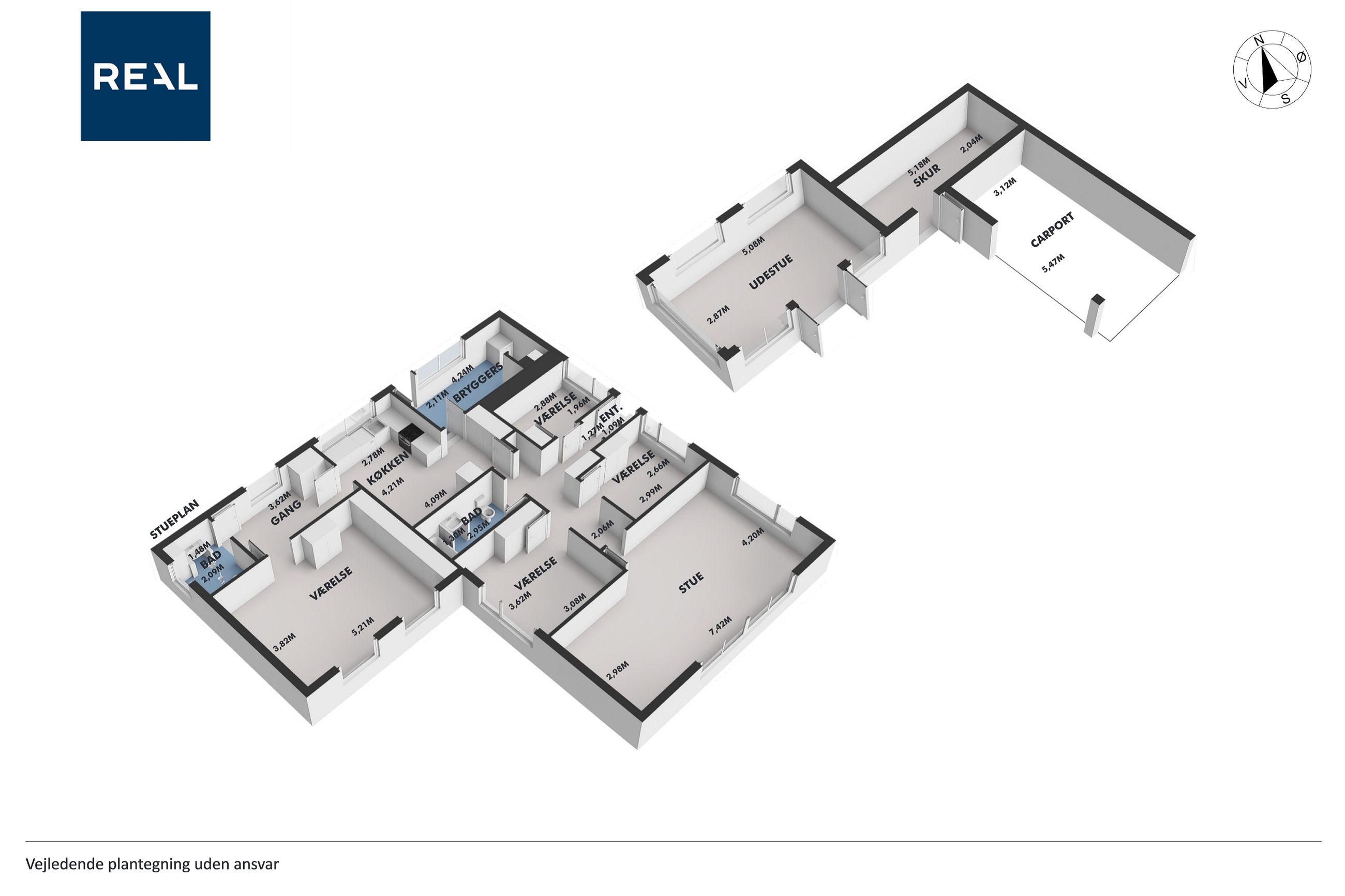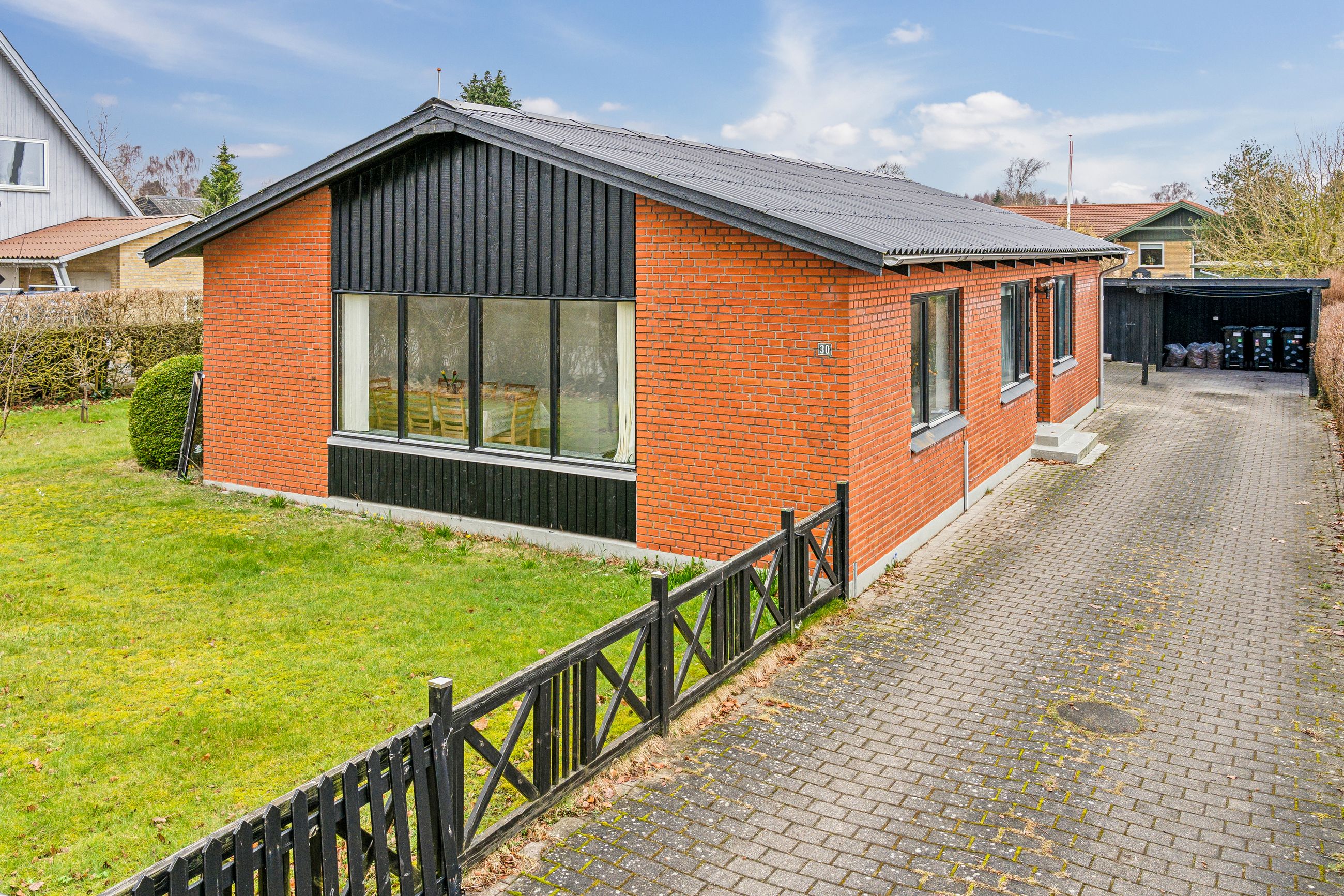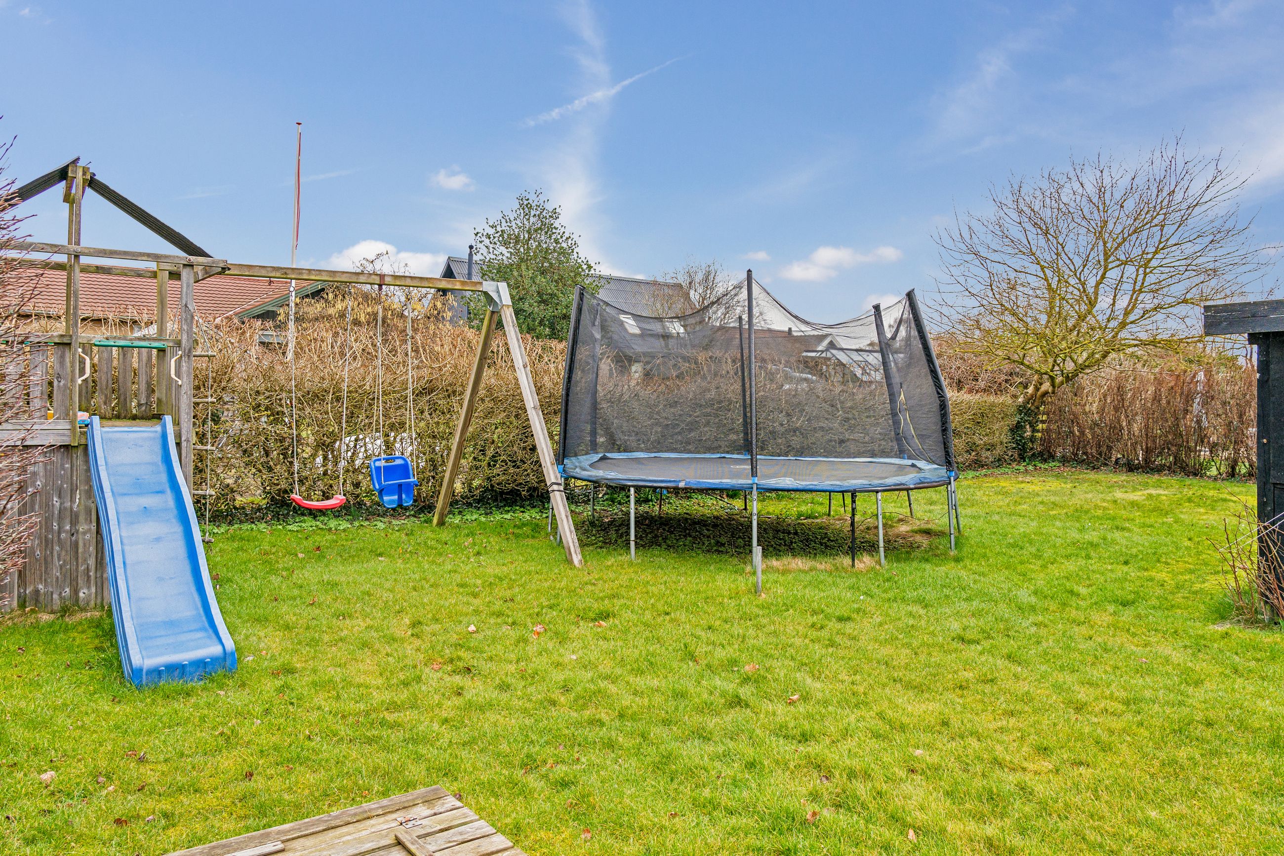 Ejendommen byder på en solrig grund på hele 839 kvadratmeter, hvor I kan nyde en nydelig forhave fyldt med frugttræer og bærbuske. Baghaven rummer ekstra parkeringsplads, en stor stenbelagt terrasse perfekt til sommerens grillfester, samt carport og udhus. Den ældre men funktionelle udestue inviterer til hyggelige stunder året rundt. Familiens mindste vil elske legearealet med sandkasse, trampolin og basketballkurv.