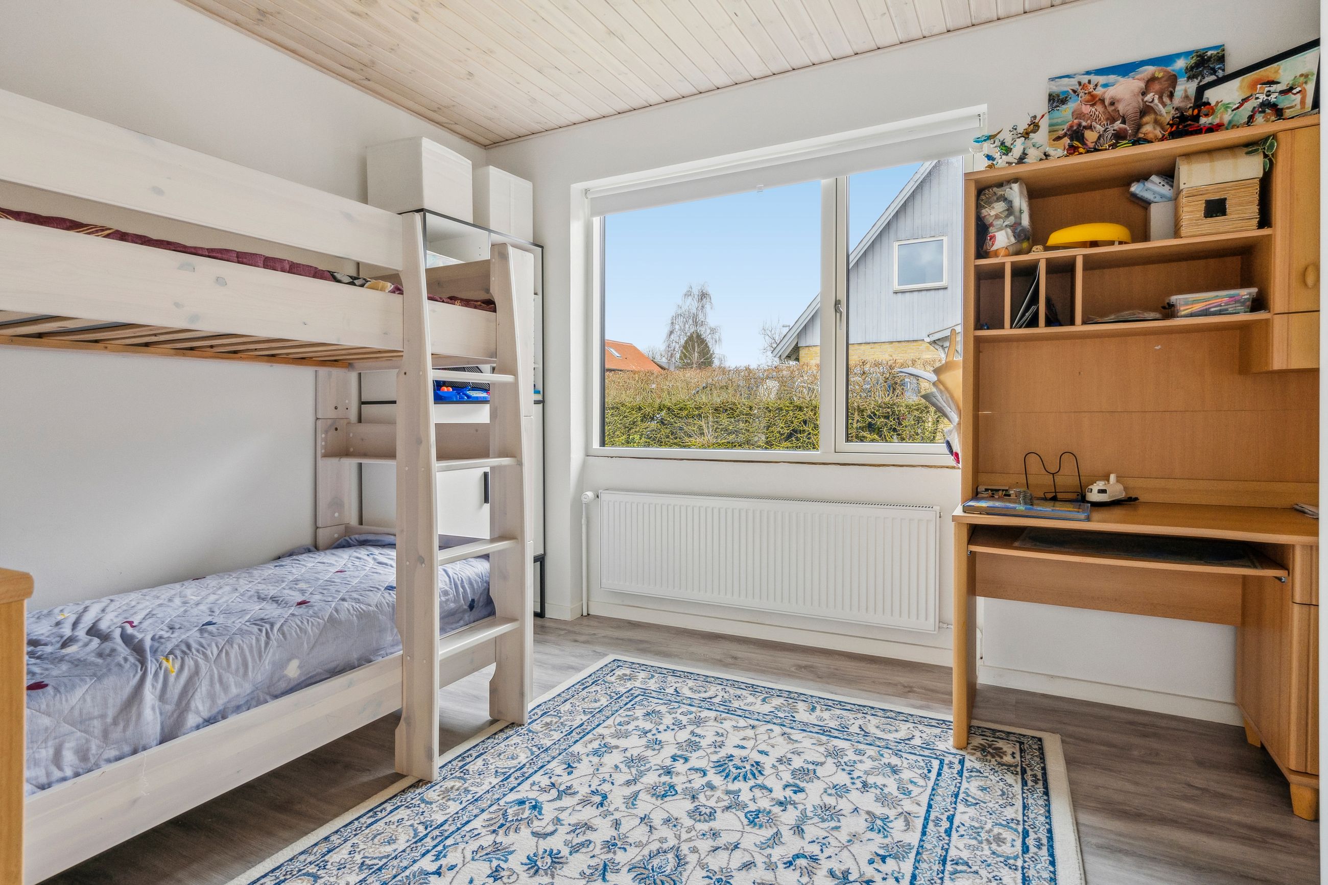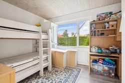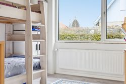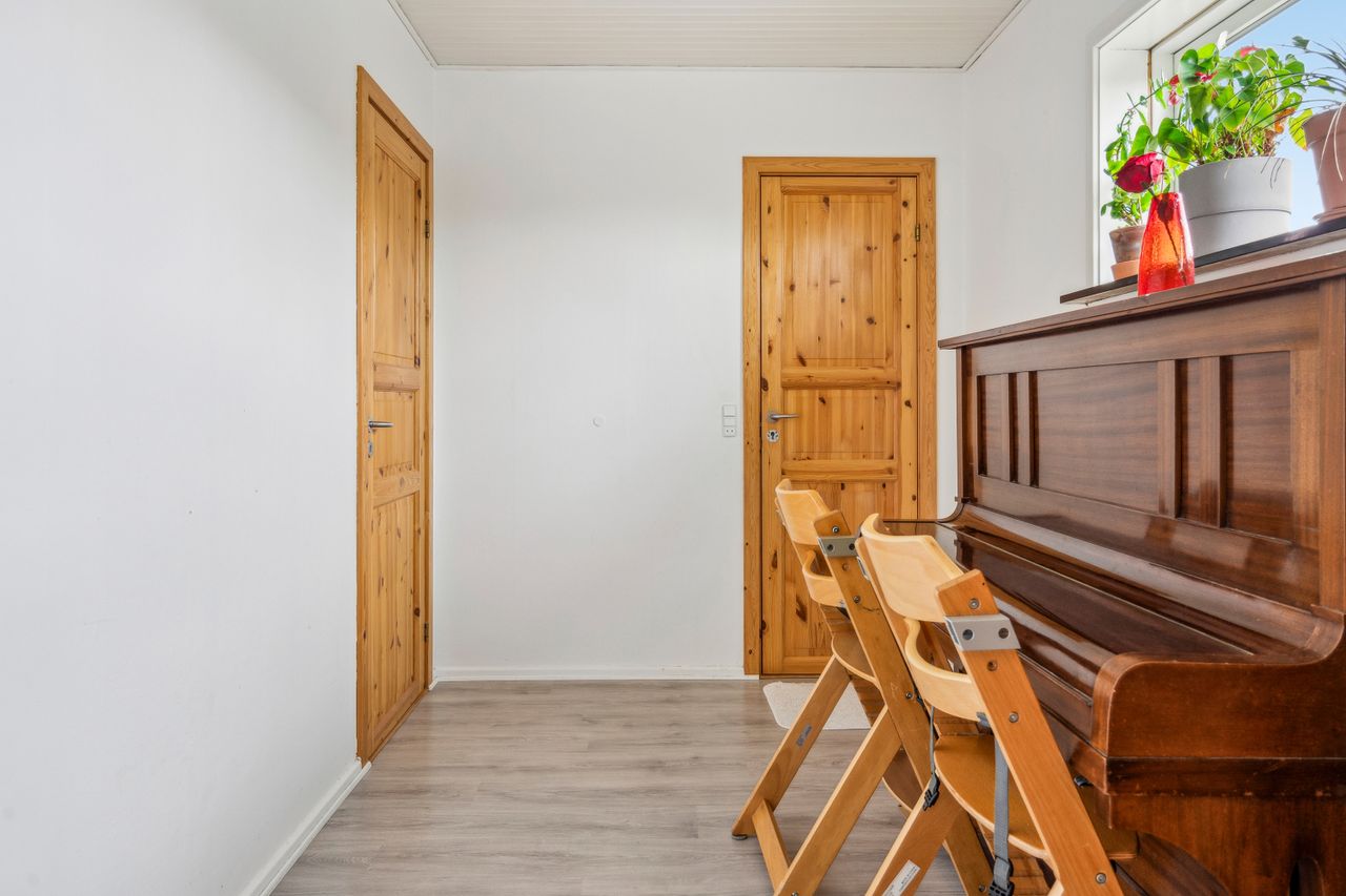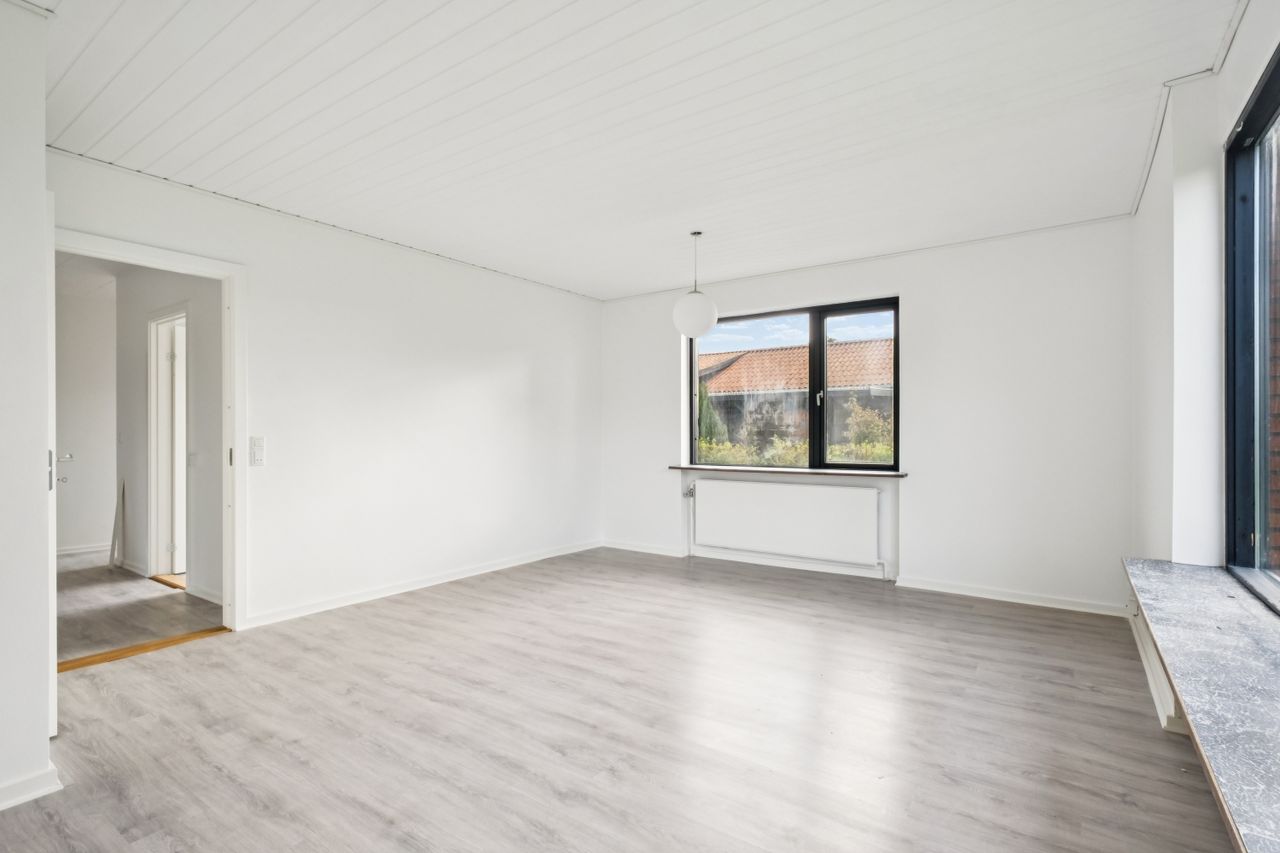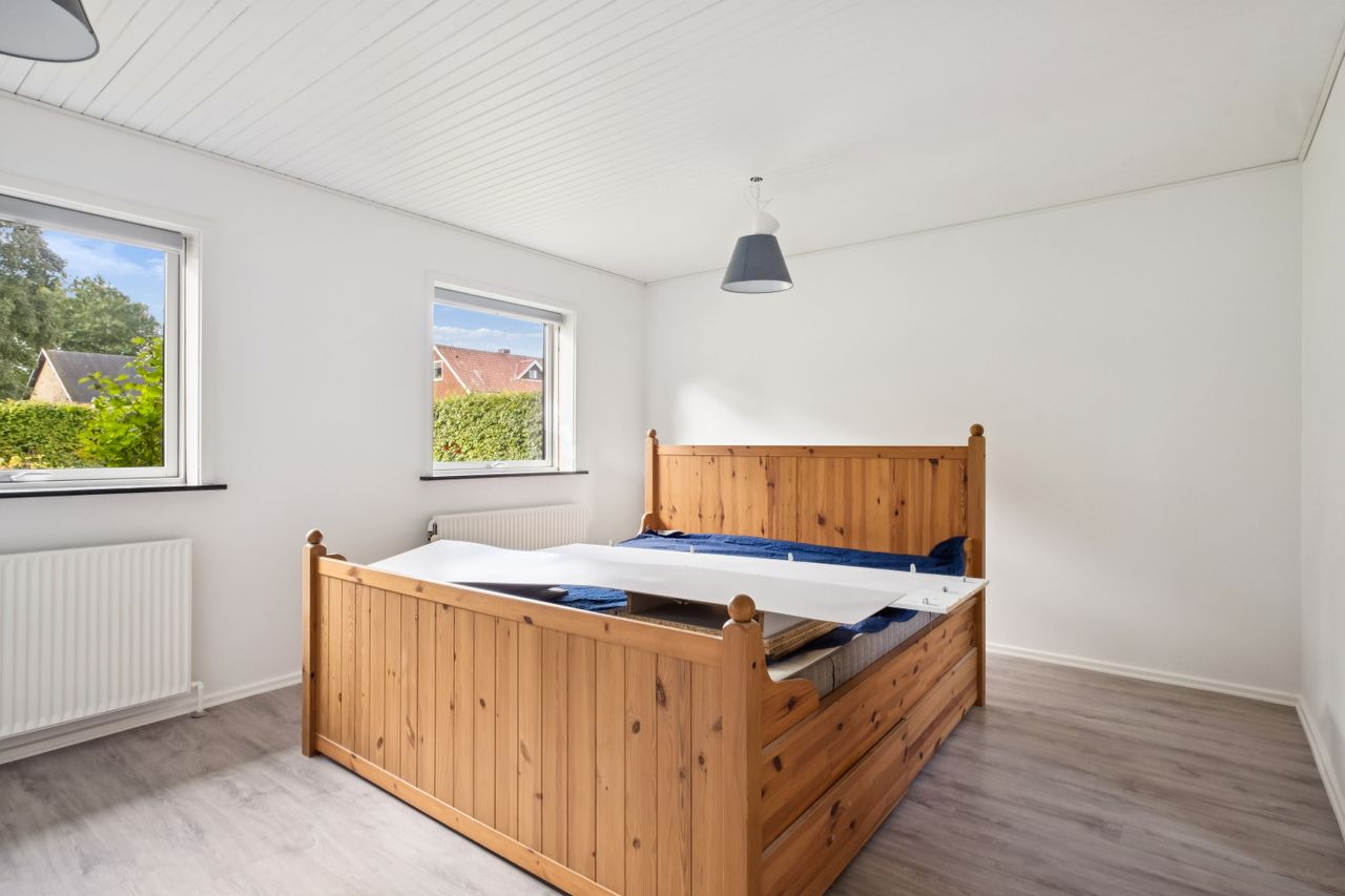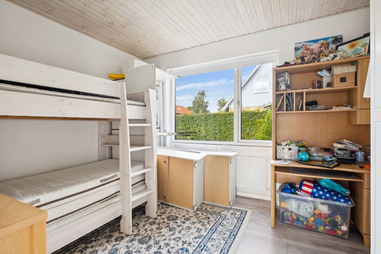 Det store soveværelse har rummelig skabsvægge og udsigt over haven, mens badeværelset fra 2018 imponerer med elegante klinker, gulvvarme og separat bruseområde. Derudover findes tre lyse børneværelser samt et ekstra badeværelse med badekar. Opholdsstuen er lysfyldt og møbleringsvenlig – perfekt for familien at samles i.