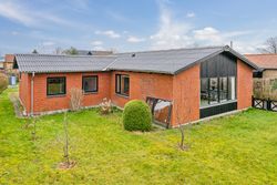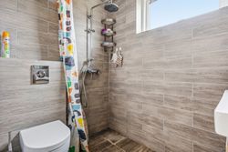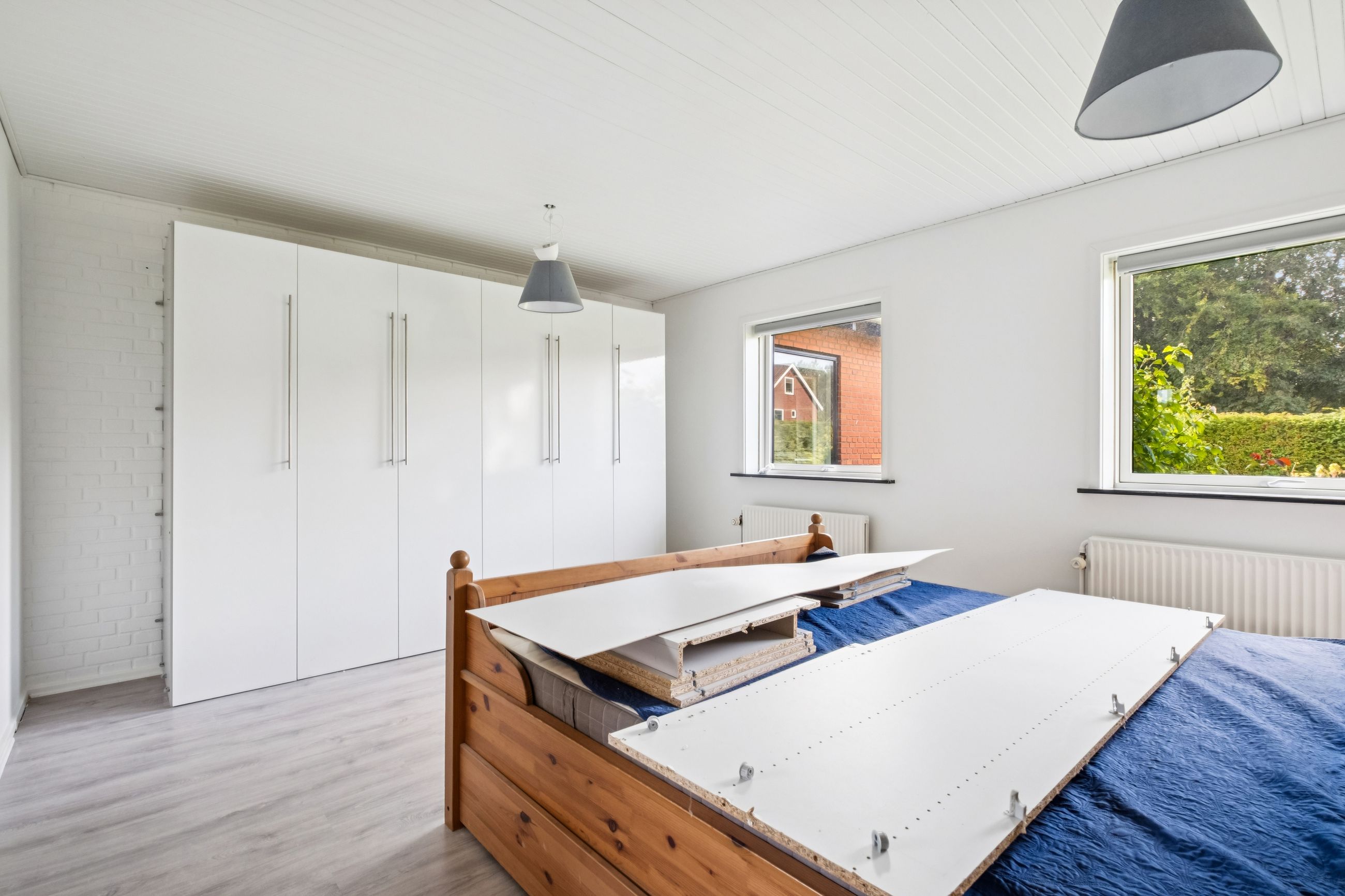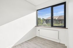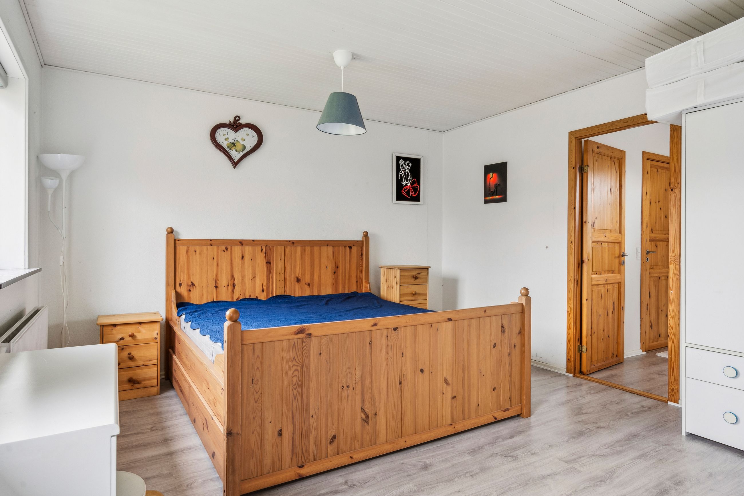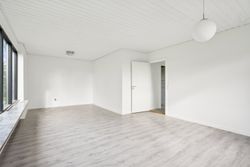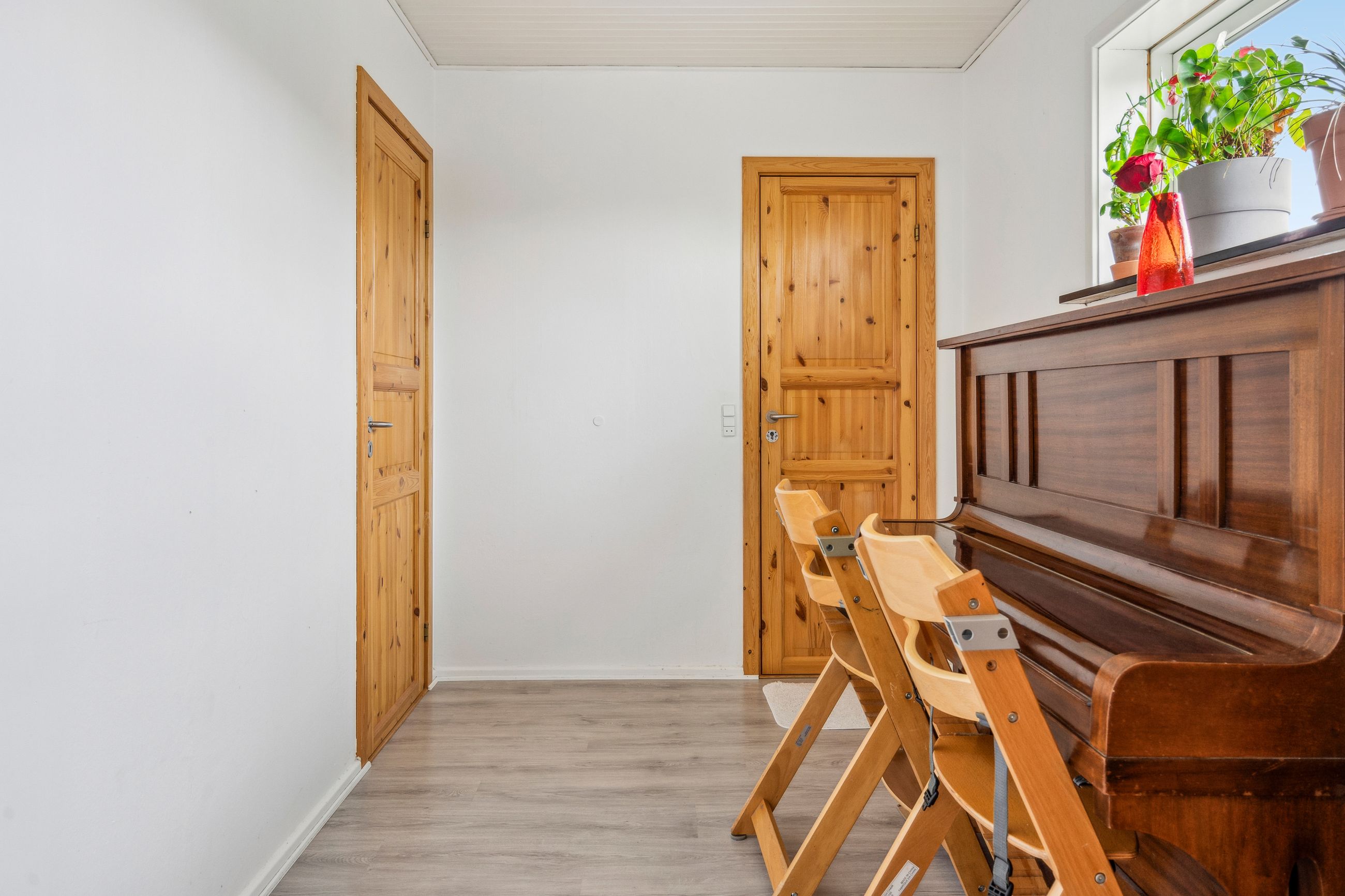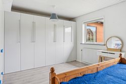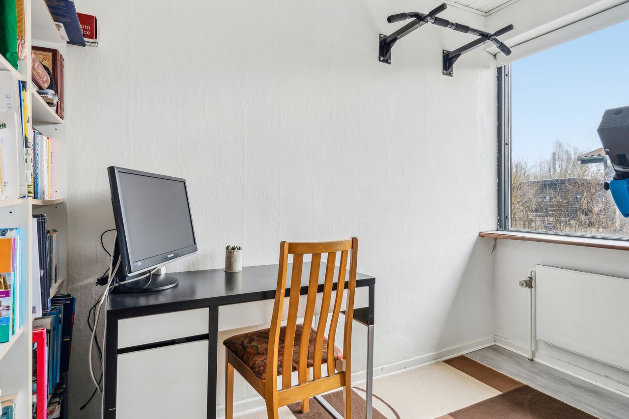 Det store soveværelse har rummelig skabsvægge og udsigt over haven, mens badeværelset fra 2018 imponerer med elegante klinker, gulvvarme og separat bruseområde. Derudover findes tre lyse børneværelser samt et ekstra badeværelse med badekar. Opholdsstuen er lysfyldt og møbleringsvenlig – perfekt for familien at samles i.