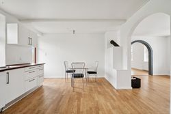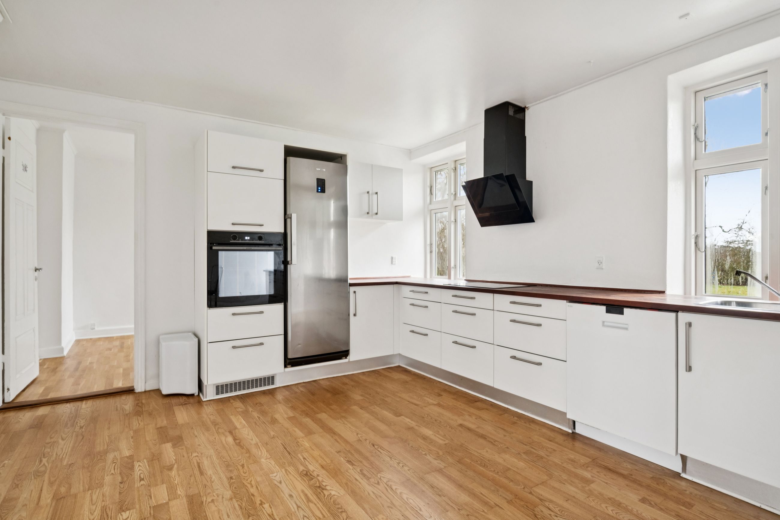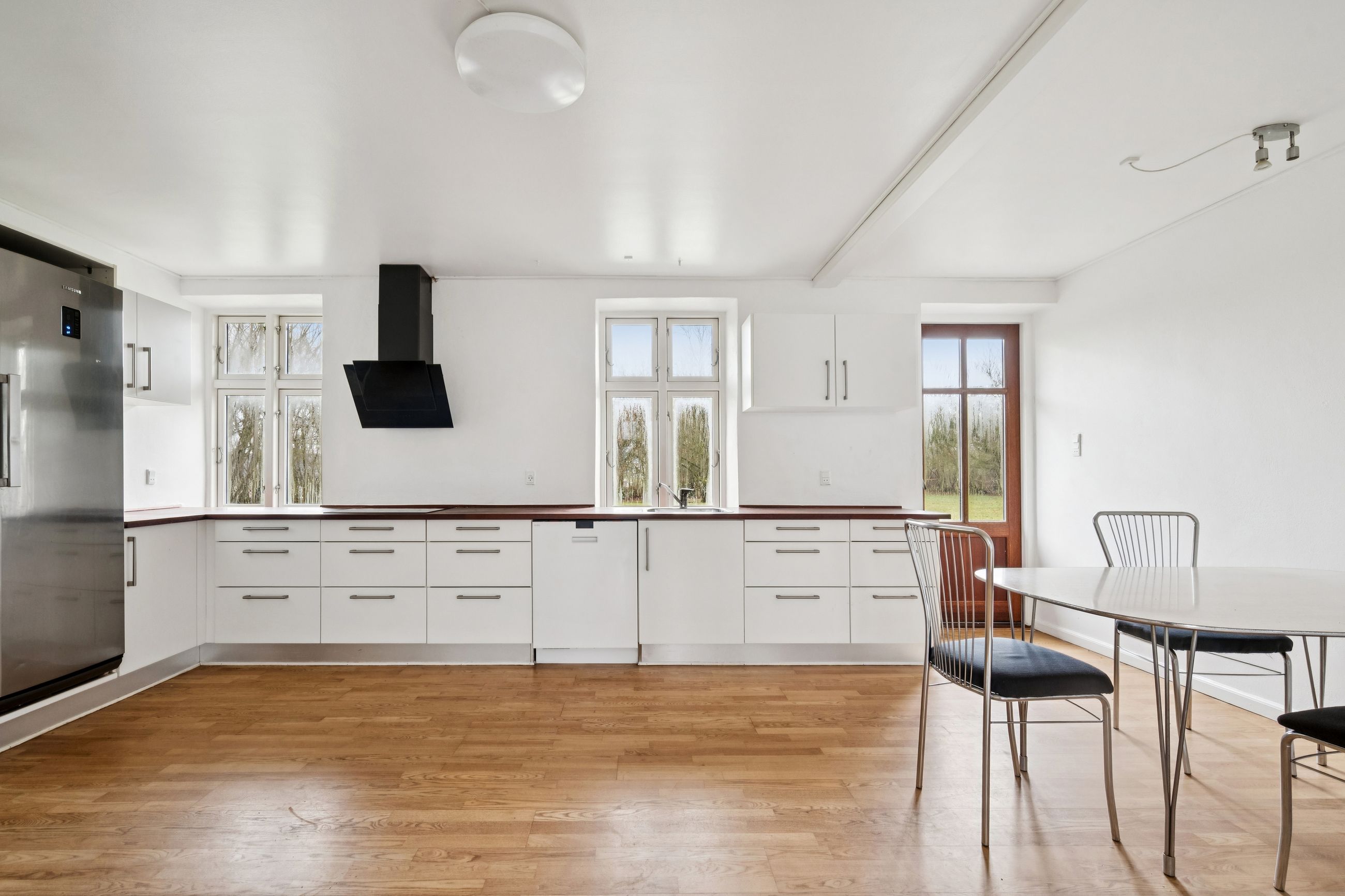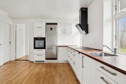 Landligt lyst køkken med kæmpe bordplade til madlavning eller bagning. Her kan hele familien samles omkring madlavningen, mens den store spiseplads inviterer til lange middage og hyggelige stunder. Den åbne forbindelse mellem køkkenet og spisestuen gør det nemt at være sammen på tværs af aktiviteter.