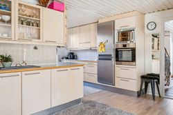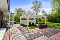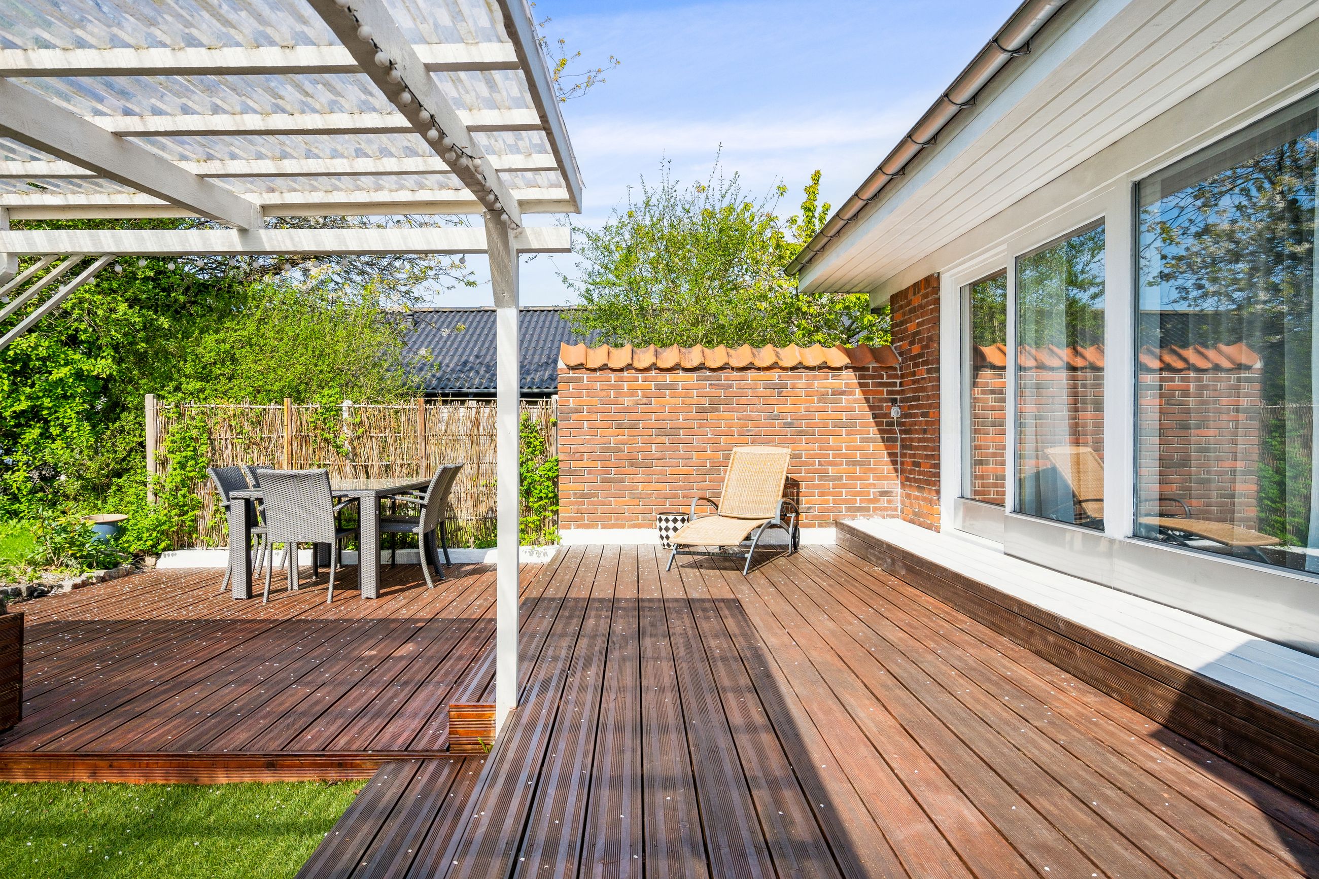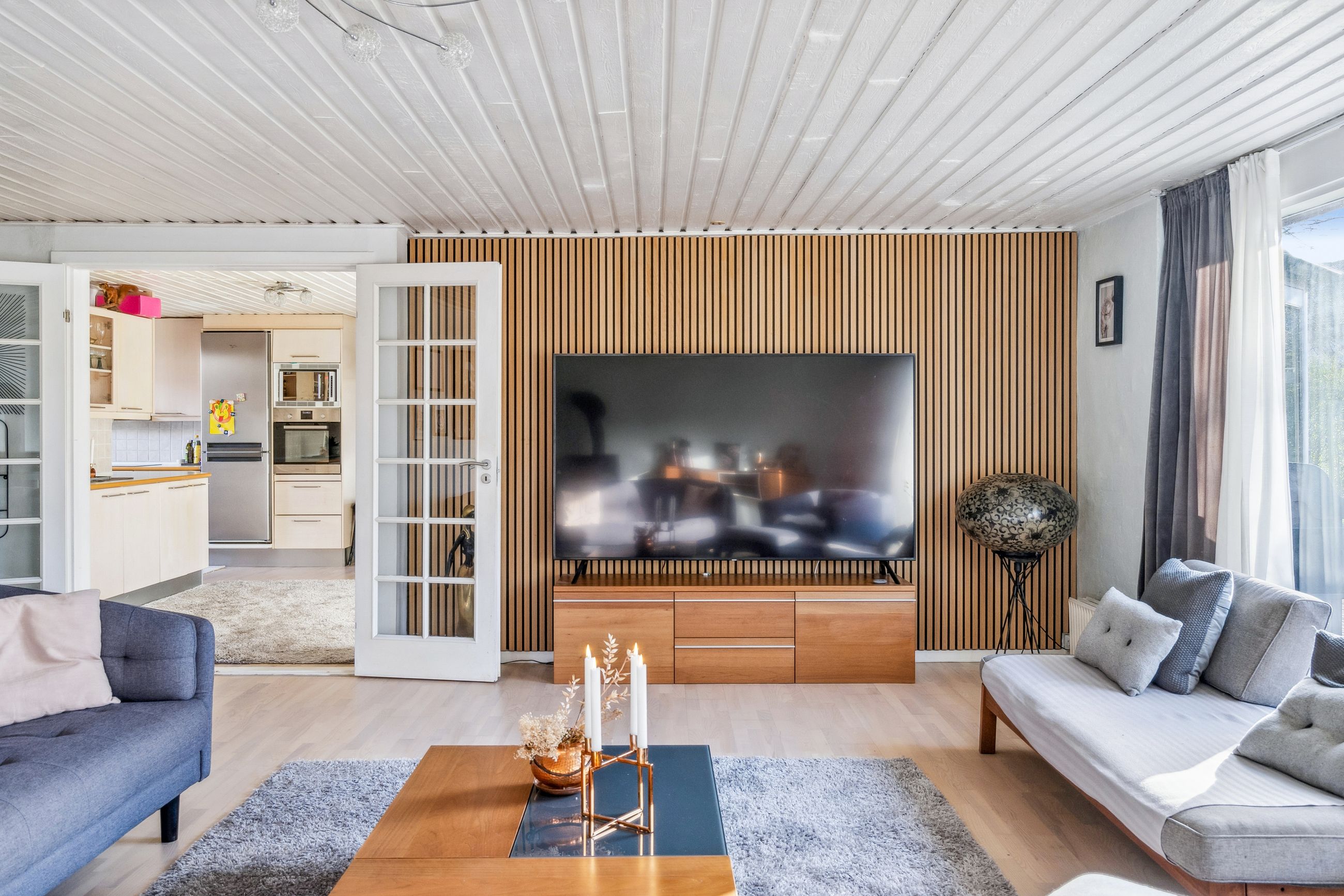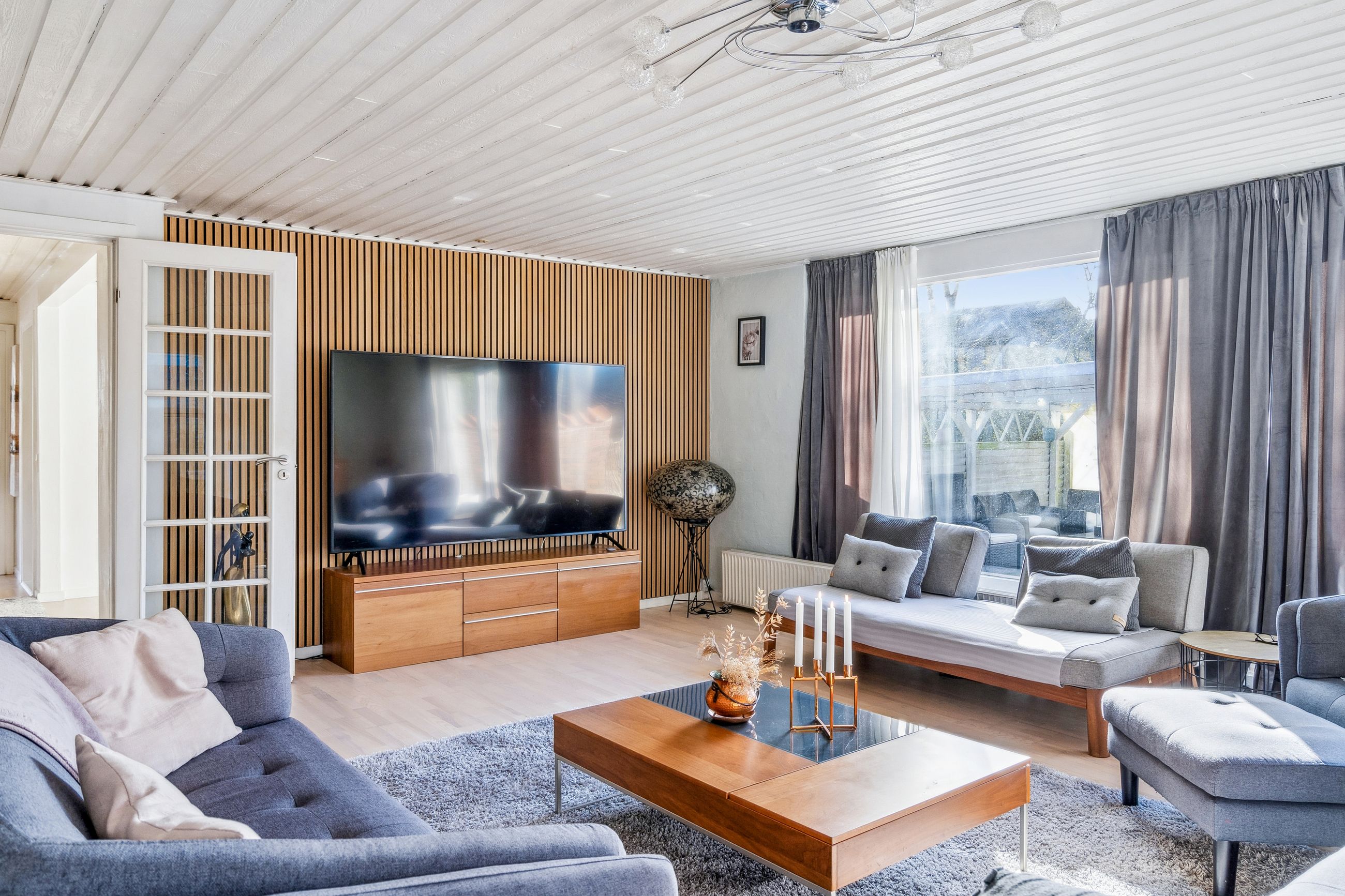 Køkken-alrummet er stort og funktionelt, hvor der er masser af plads til gæster. Du har stadig mulighed for at deltage i selskabet, mens du arbejder i køkkenet. Herfra er der adgang til den skønne stue, hvor der er flotte gulve, akustikpaneler og store vinduespartier, der sikrer et fantastisk lysindfald og skaber en indbydende atmosfære. Fra stuen er der direkte udgang til den dejlige terrasse, som ligger perfekt placeret i den sydvestvendte have. Dette gør det til et oplagt sted at nyde sommerens lange aftener, mens børnene leger i haven.
