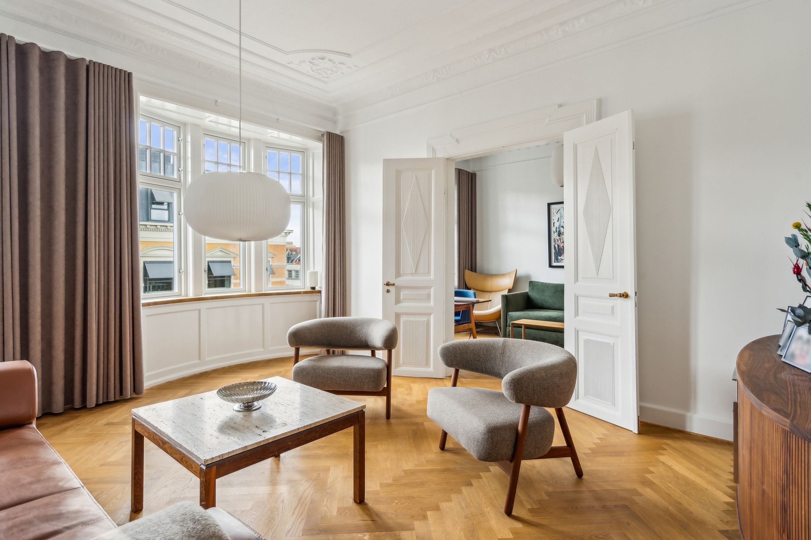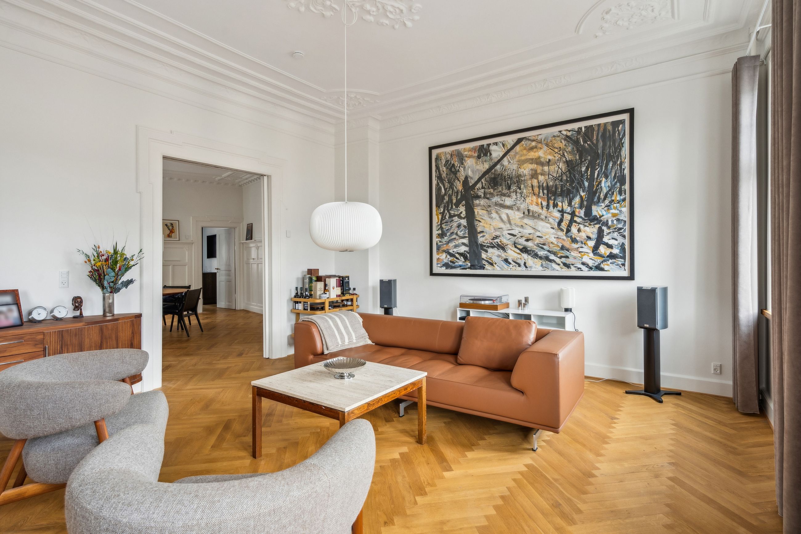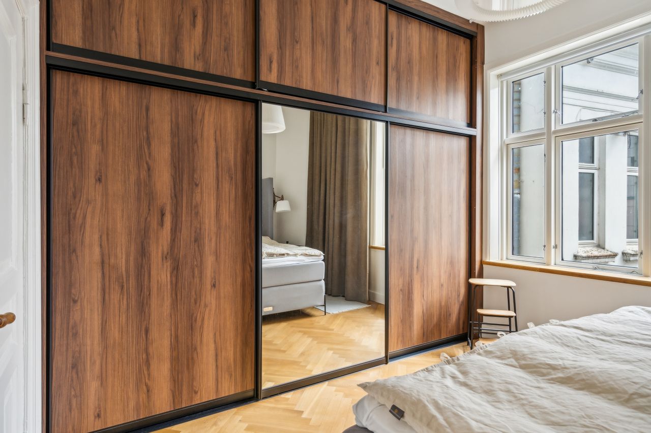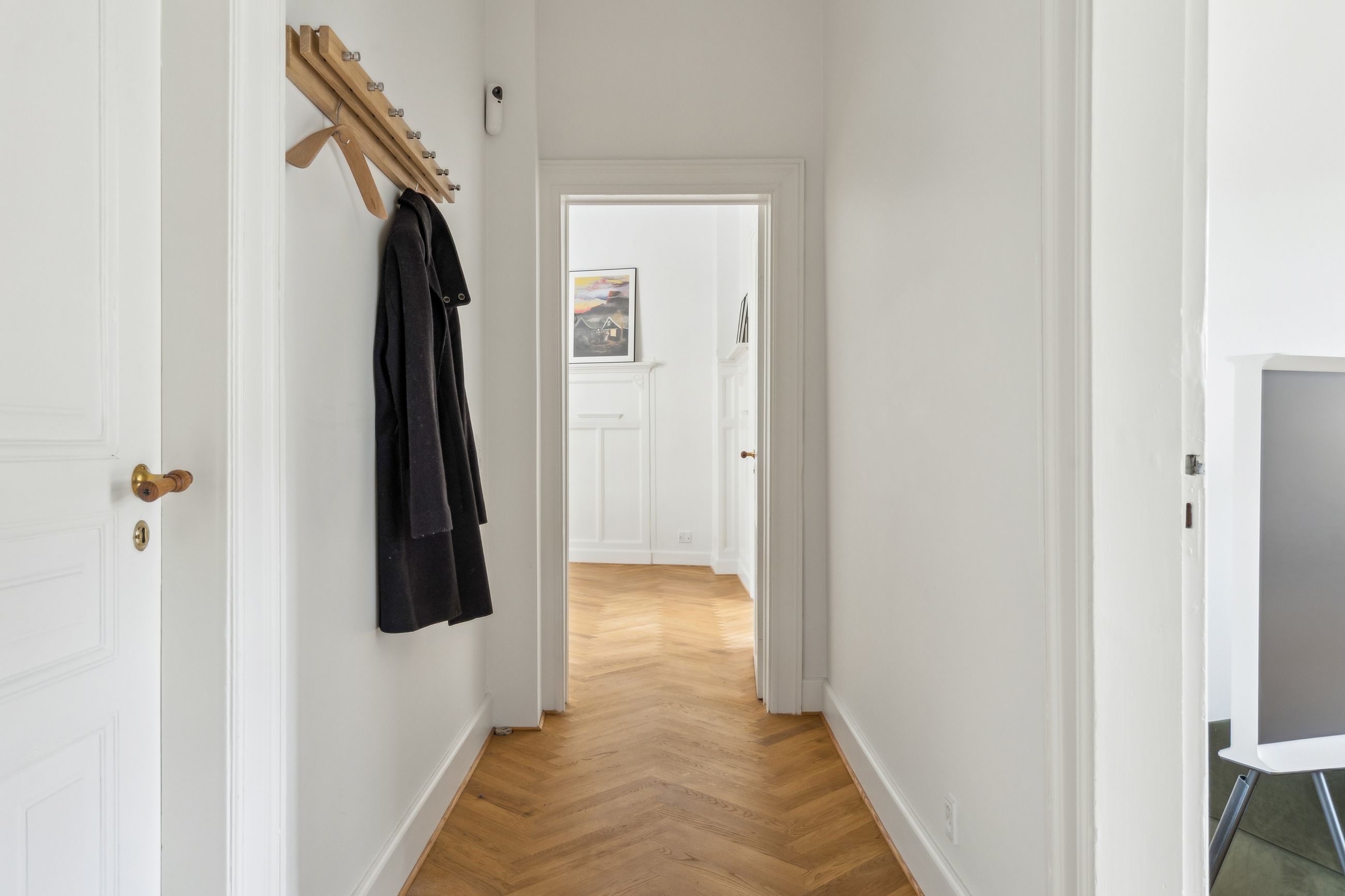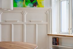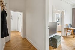 Opgangen til lejligheden vidner om en tid, hvor der i bygningen ikke blev sparet på detaljerne. Det går igen i hver en krog af denne skønne lejlighed, der har de smukkeste stuklofter, fine vægpaneler og døre med udskæringer, der kan danne rammen om et helt særligt hjem for den kræsne boligejer, der sætter pris på disse smukke detaljer.