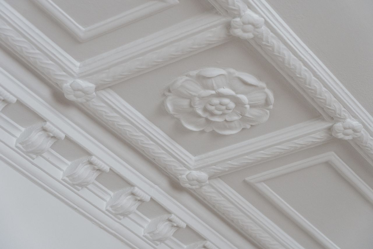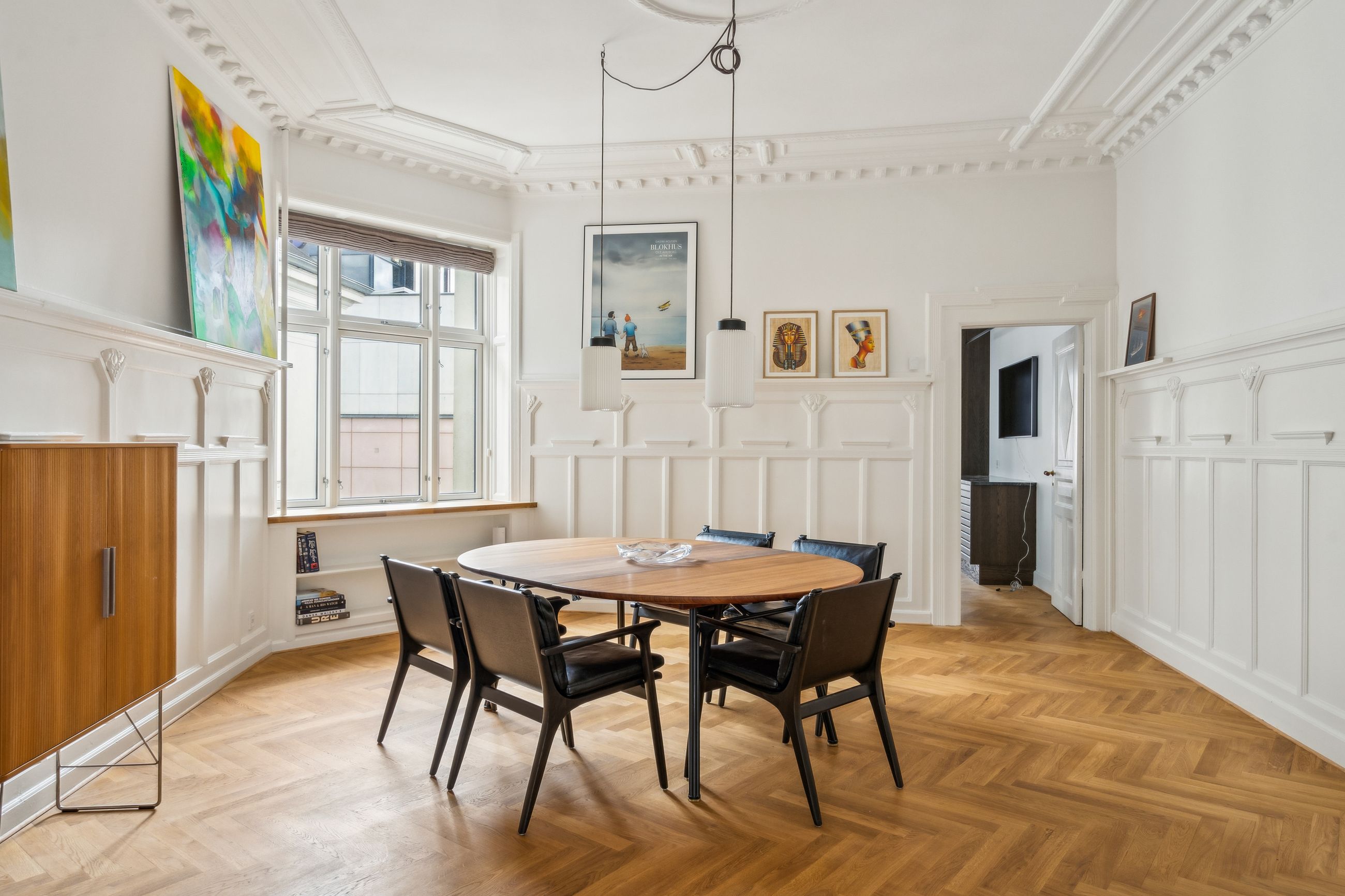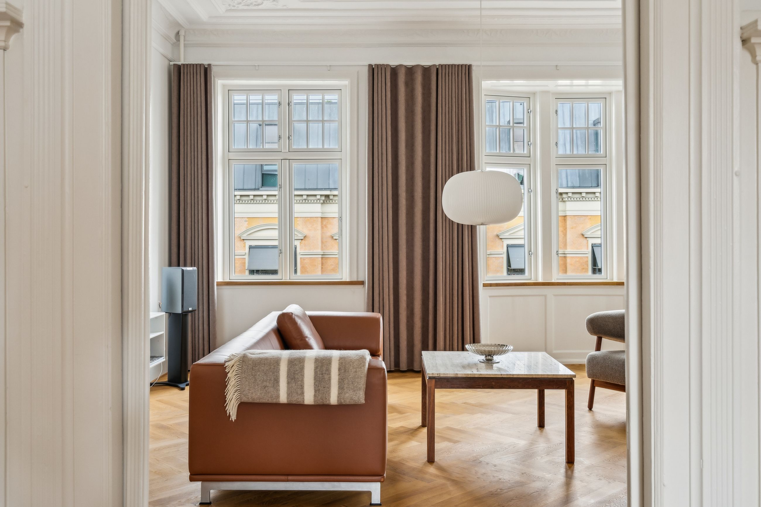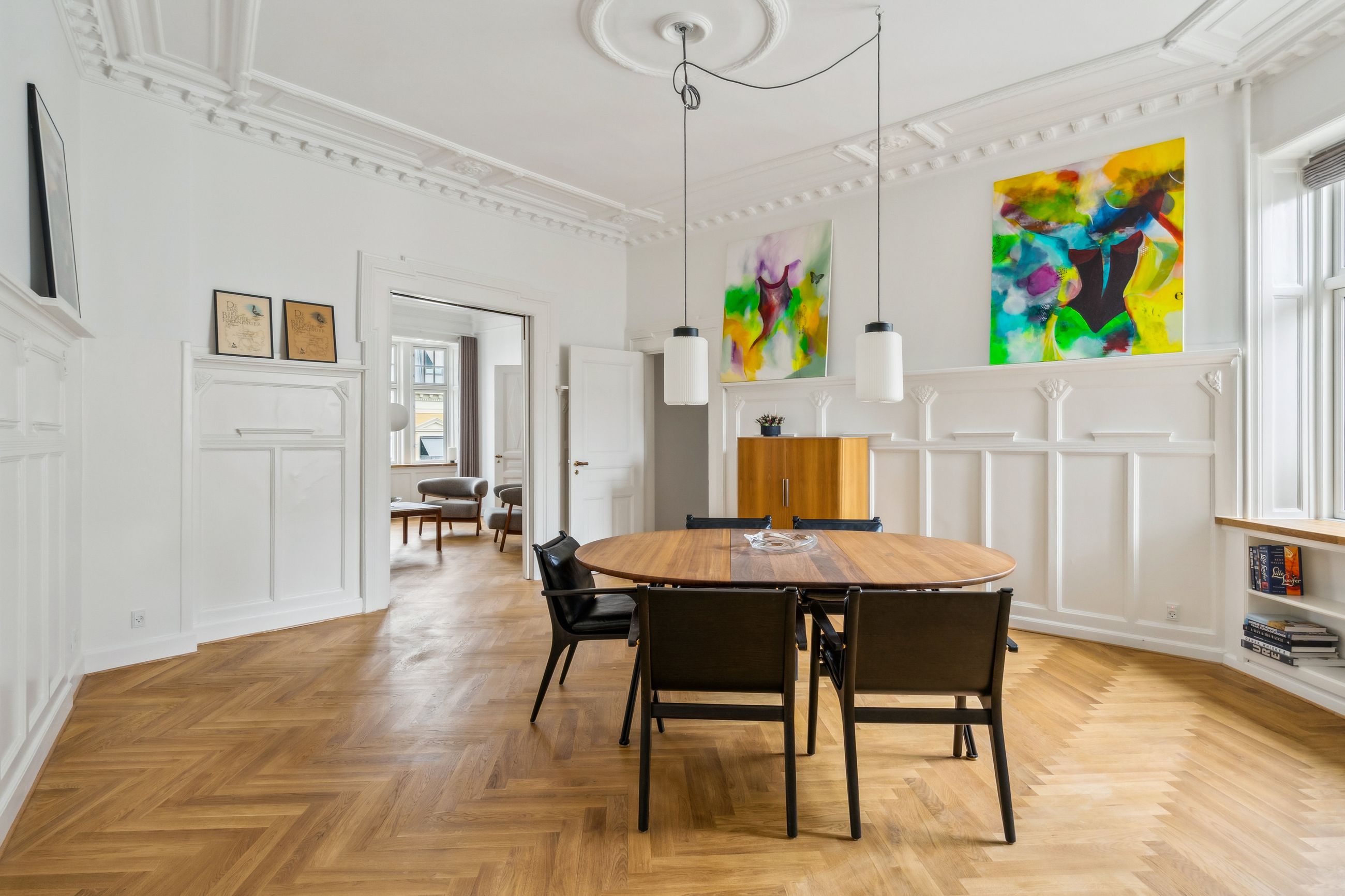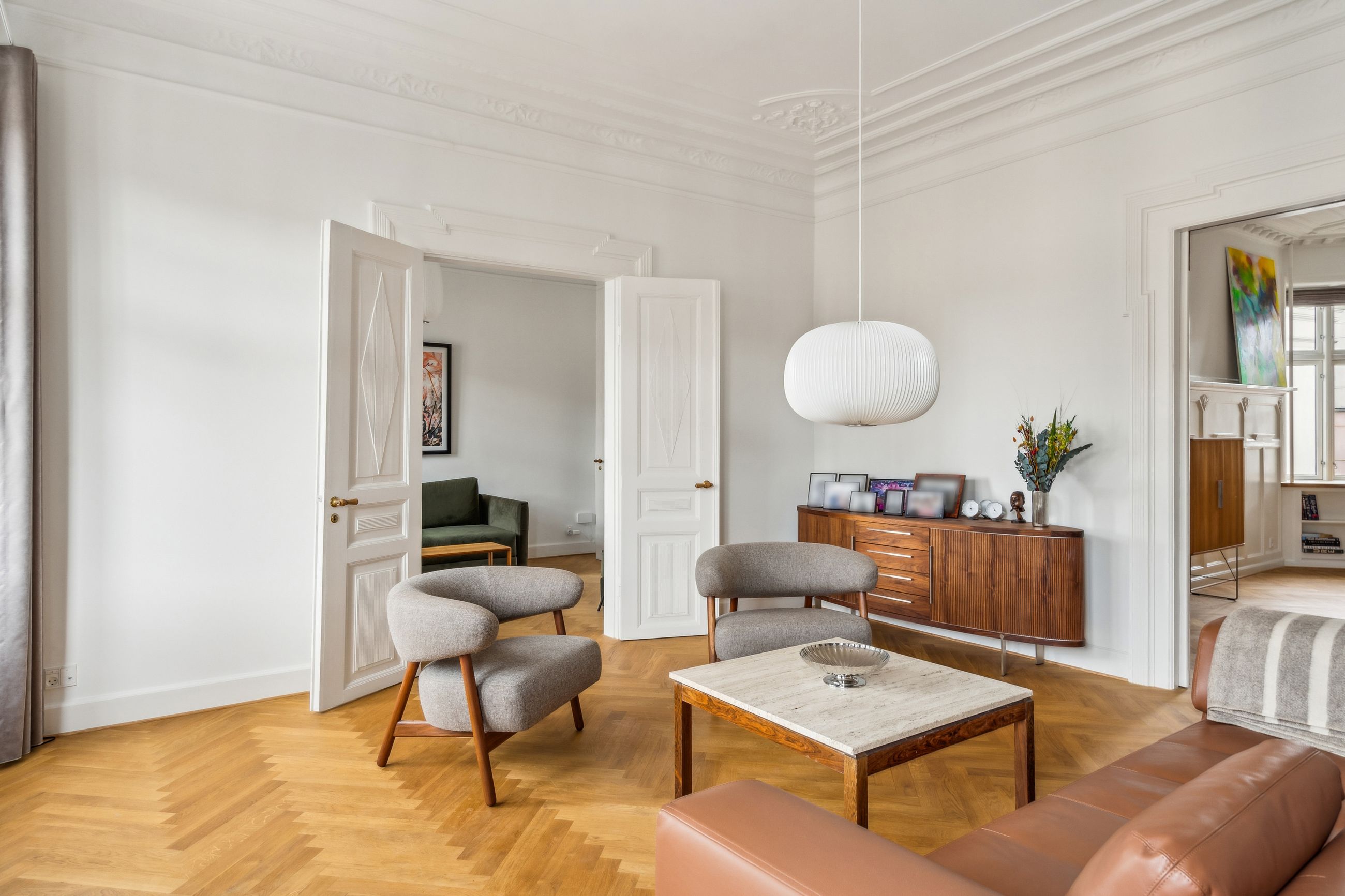 Opgangen til lejligheden vidner om en tid, hvor der i bygningen ikke blev sparet på detaljerne. Det går igen i hver en krog af denne skønne lejlighed, der har de smukkeste stuklofter, fine vægpaneler og døre med udskæringer, der kan danne rammen om et helt særligt hjem for den kræsne boligejer, der sætter pris på disse smukke detaljer.