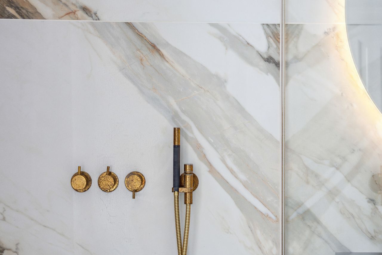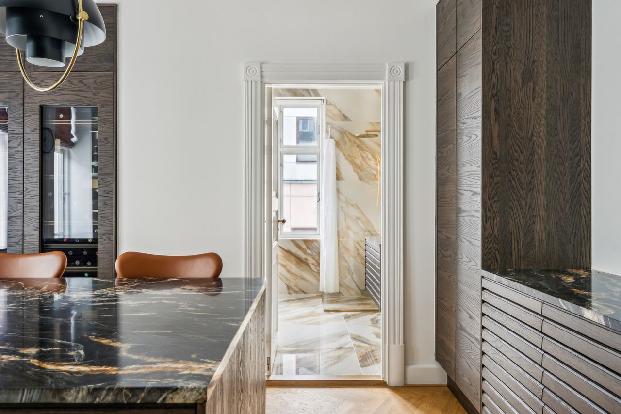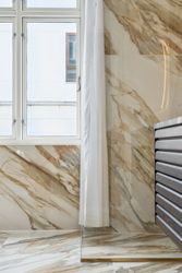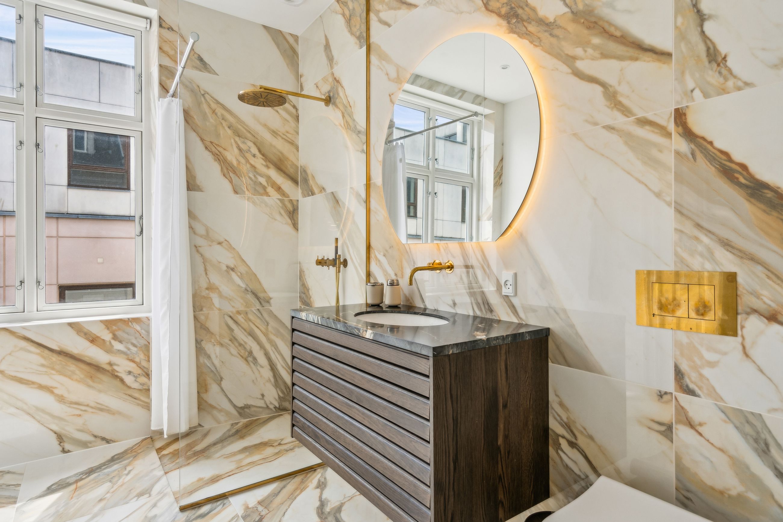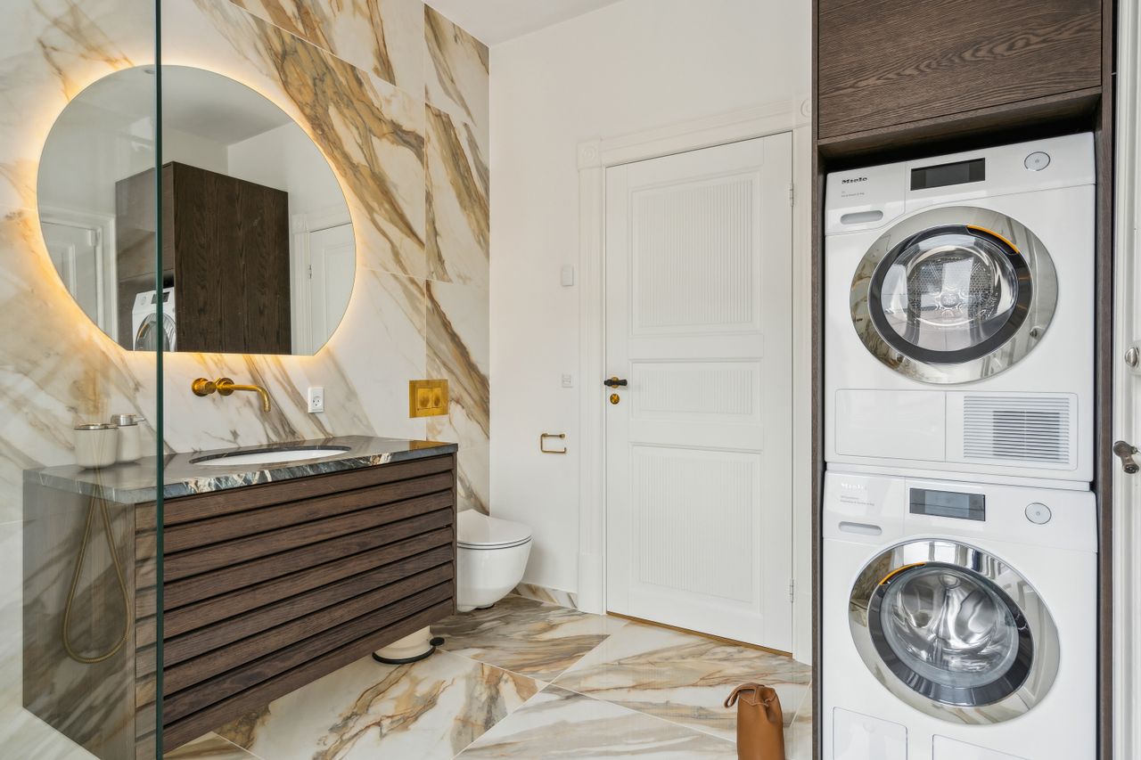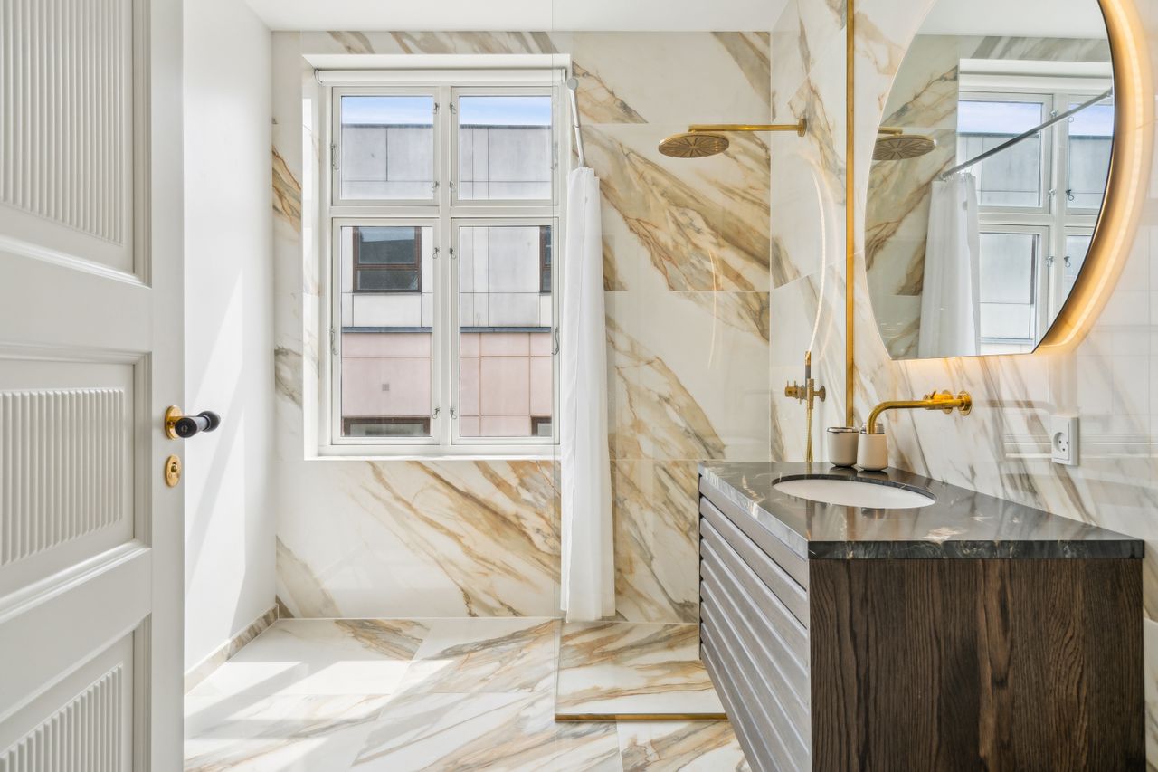 Badeværelset har en eksklusiv stil med store, flotte, italienske fliser - Jolie 03 Calacatta Vena Antica, hvor hver åre og hver eneste plade er resultatet af en nøje udvælgelse, for en ædel og tidløs effekt. Sammen med det store vindue, med fjernbetjente rullegardiner, giver det et dejligt lyst rum, hvor brusenichen er adskilt med en glasvæg. Badeværelset har smukt inventar (samme model som køkkenet), Vola armaturer i messing, væghængt toilet og en niche med vaskesøjle, hvor du får vaskemaskine og tørretumbler i en utrolig lydsvag model. Fra badeværelset er der adgang til bagtrappen, som endnu forefindes.