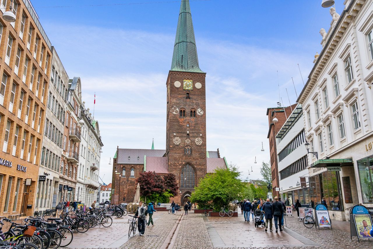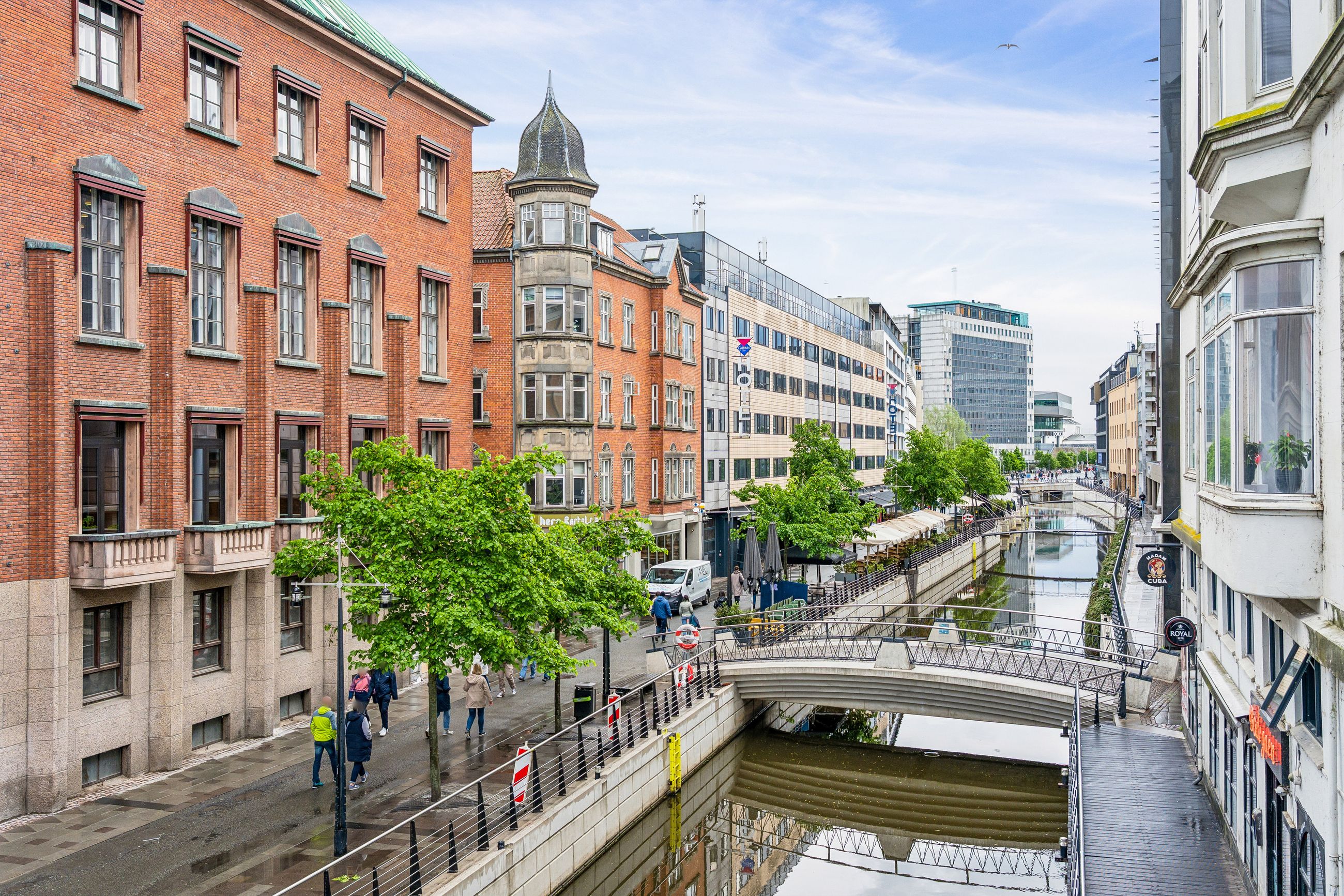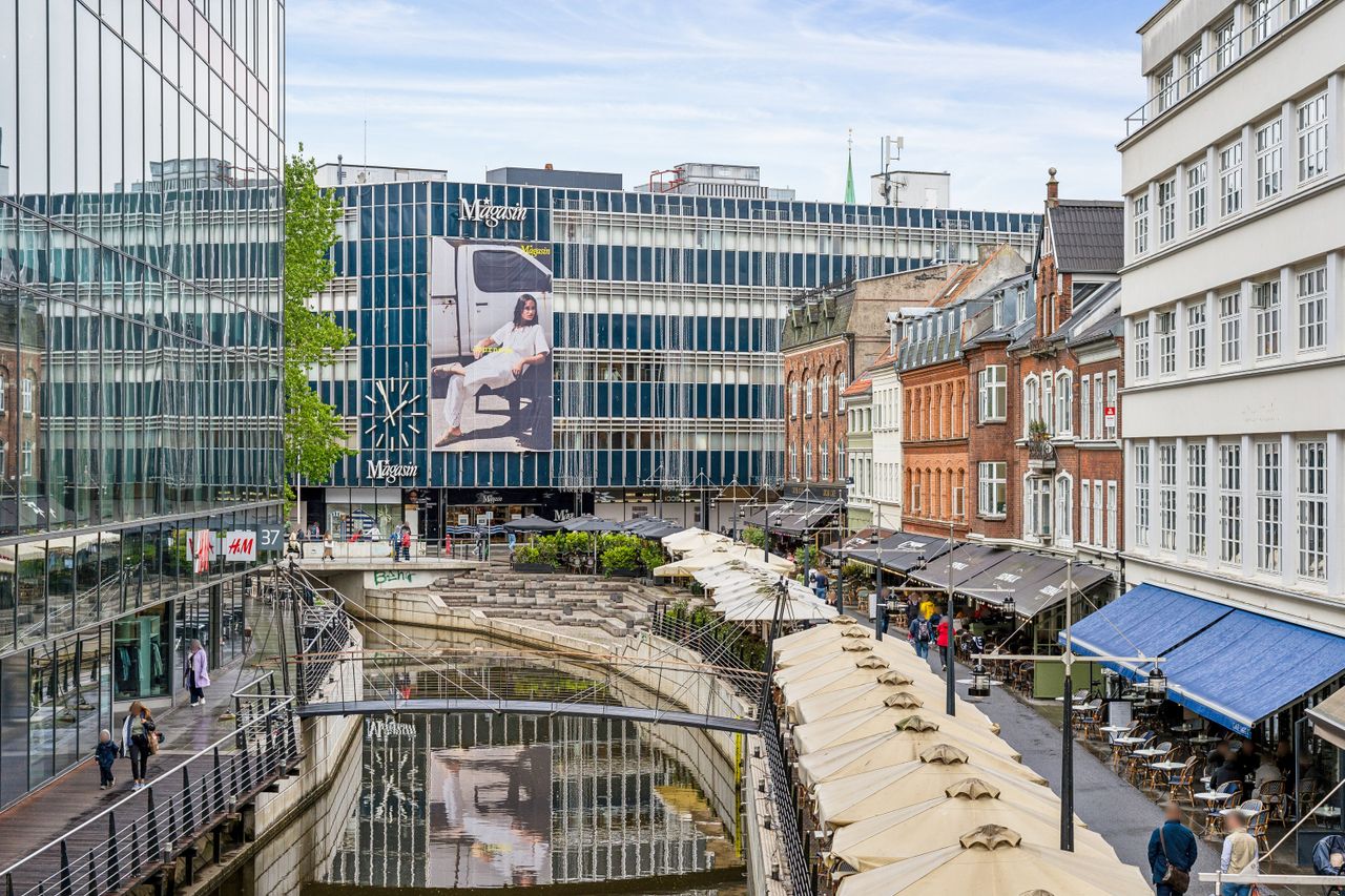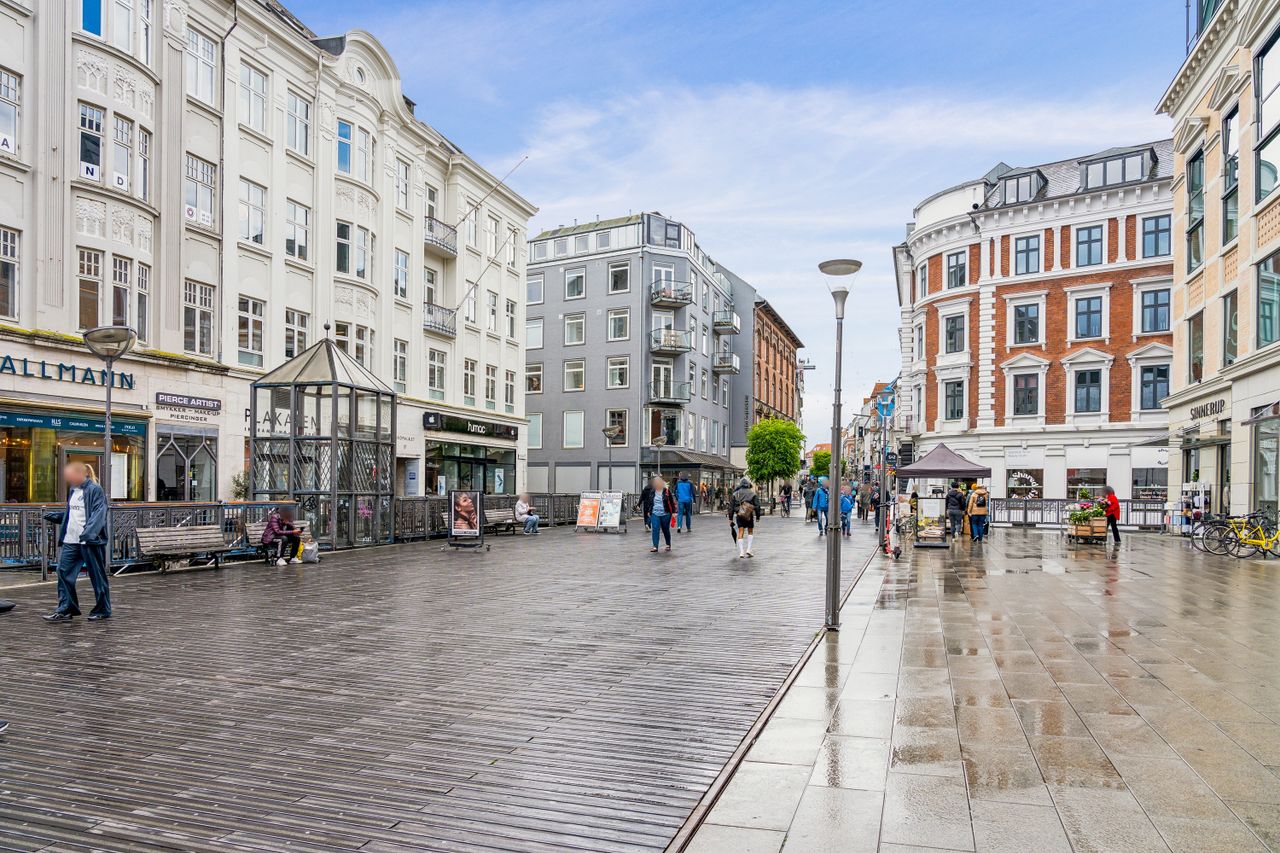 Der er indgang til lejligheden via et flot og præsentabelt dørparti fra Skt. Clemens Torv beliggende på Strøget midt i Aarhus. Lige der, hvor pulsen banker allermest. Tæt på åen, alle de skønne caféer, restauranter og butikker. Det berømte Latinerkvarter ligger lige om hjørnet.