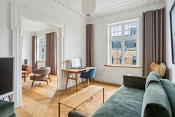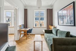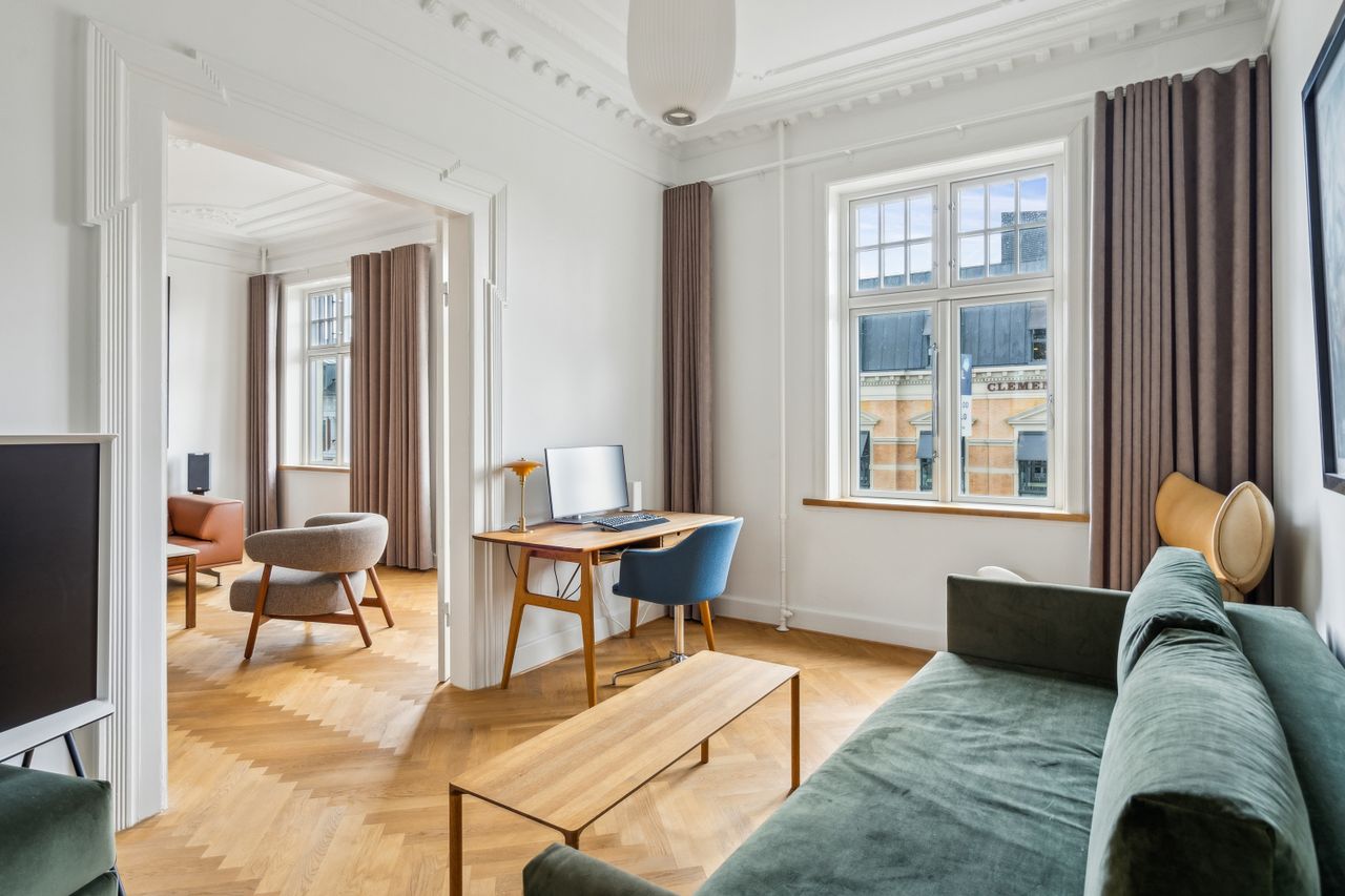 Lejligheden er indrettet med: En god og rummelig entré - 2 store stuer samt 1 kontor alle en suite - et stort soveværelse med skabsvæg fra Invita og mørklægningsgardiner - et stort køkken ud over det sædvanlige - et dejligt, lyst badeværelse.