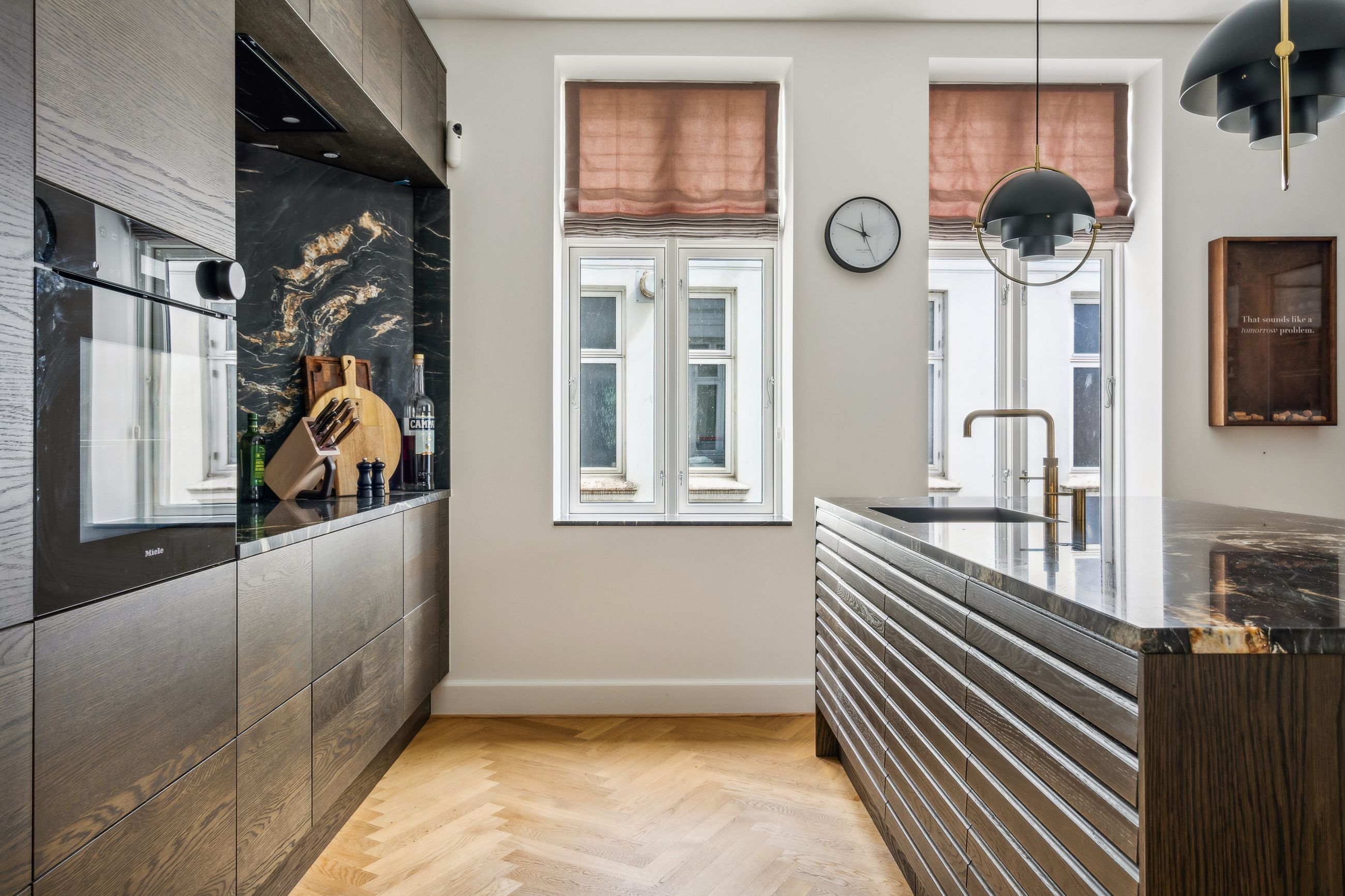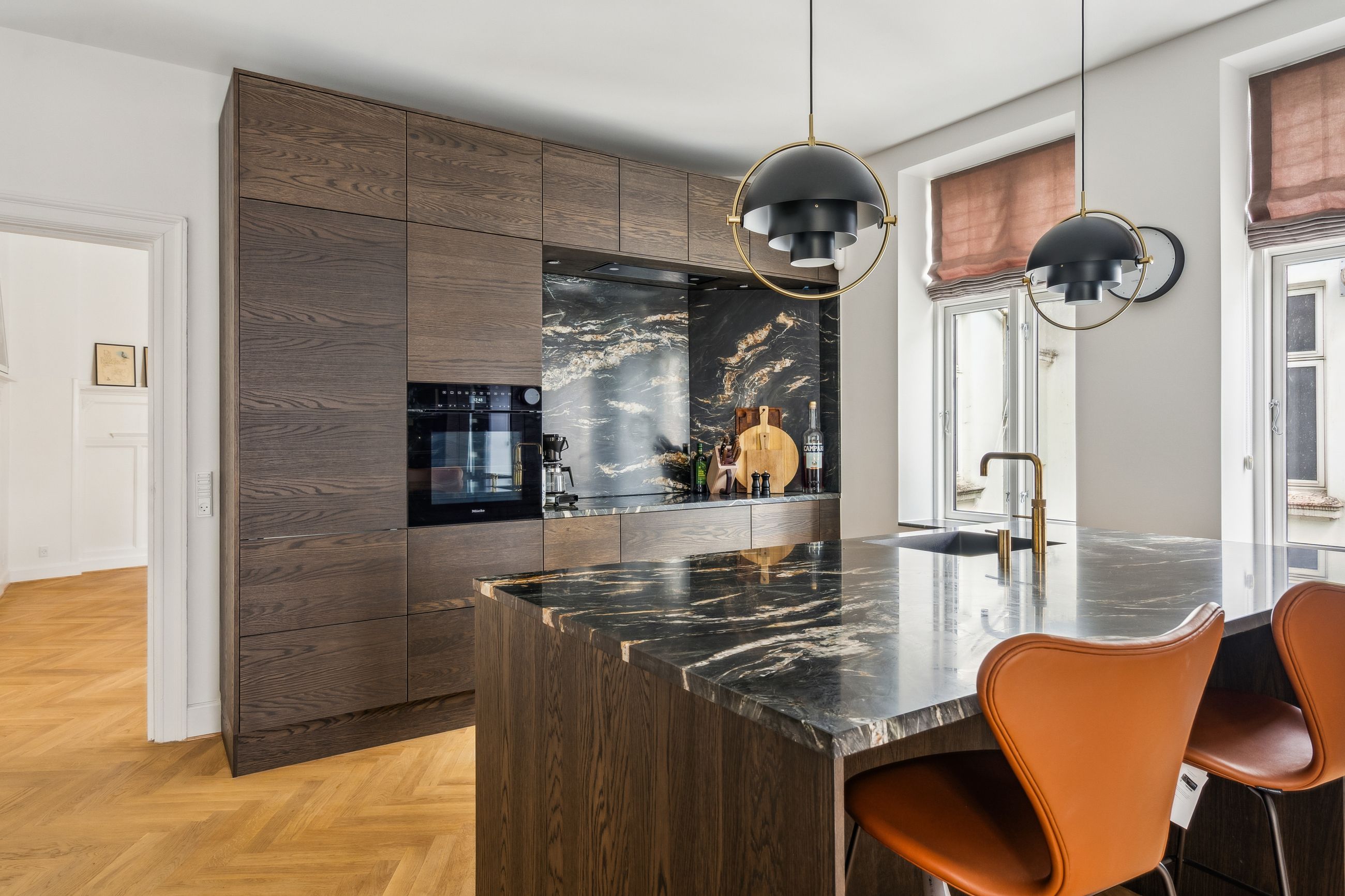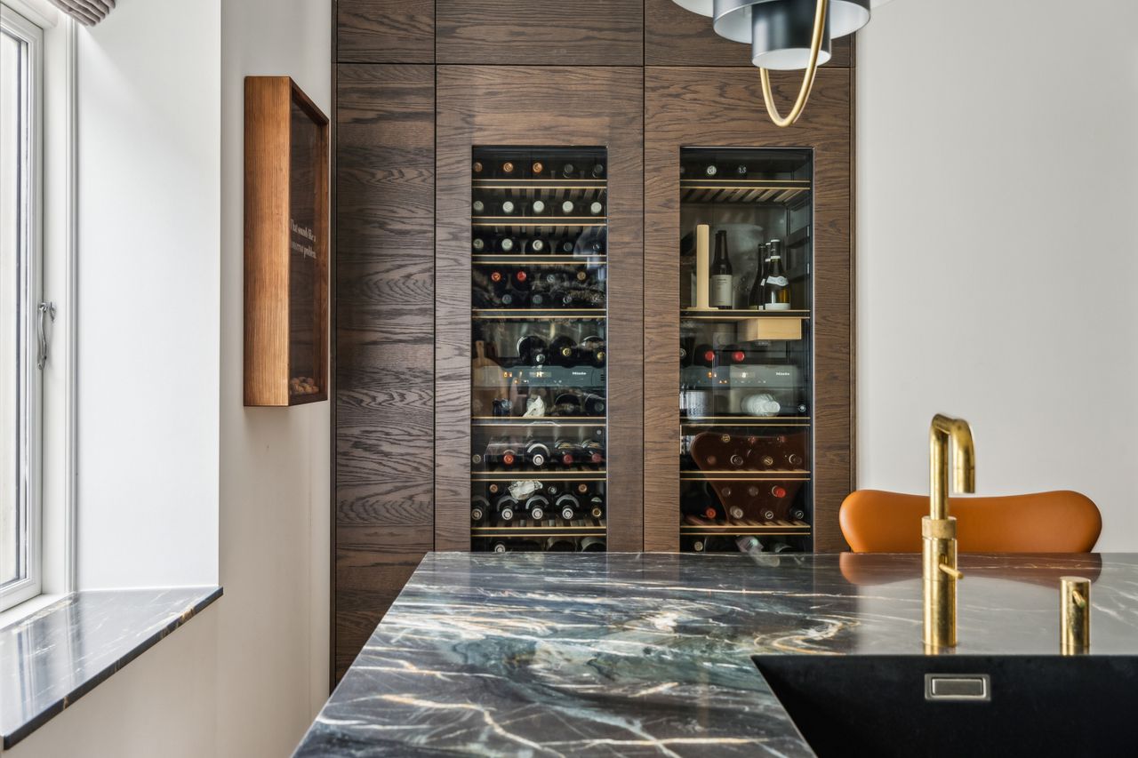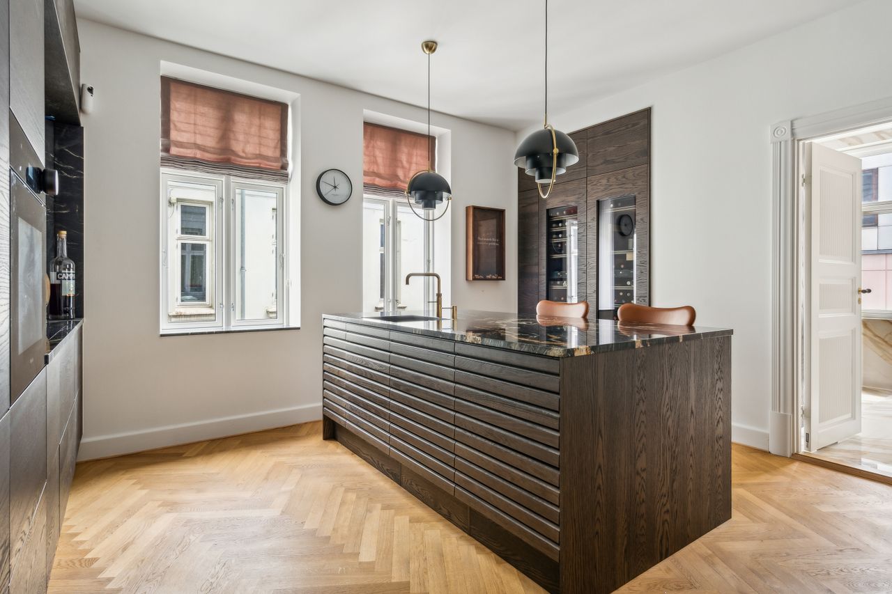 Køkkenet er et kapitel for sig. Her får du inventar i model RAW Nordic Finér fra Svane Køkken, der oplyser at køkkenet er en gennemført hyldest til skandinavisk design og kompromisløst håndværk. Serien kombinerer nordisk elegance med rå, mørke overflader og naturlige trætoner, hvilket skaber et markant udtryk, der føles eksklusivt og jordnært. Det toppes af køkkenbordpladerne, der er 30 mm finslebne stenplader i granit/kvartsit af typen Belvedere. Kan du lide et godt glas vin, kan du opbevare vinen ved den rette temperatur i de 2 store vinkøleskabe. Med undtagelse af den loftsintegrerede emhætte af mrk. Metz Medio, er alle hvidevarer af mrk. Miele. Armaturerne er fra Vola i messing, ligesom der er Quooker.