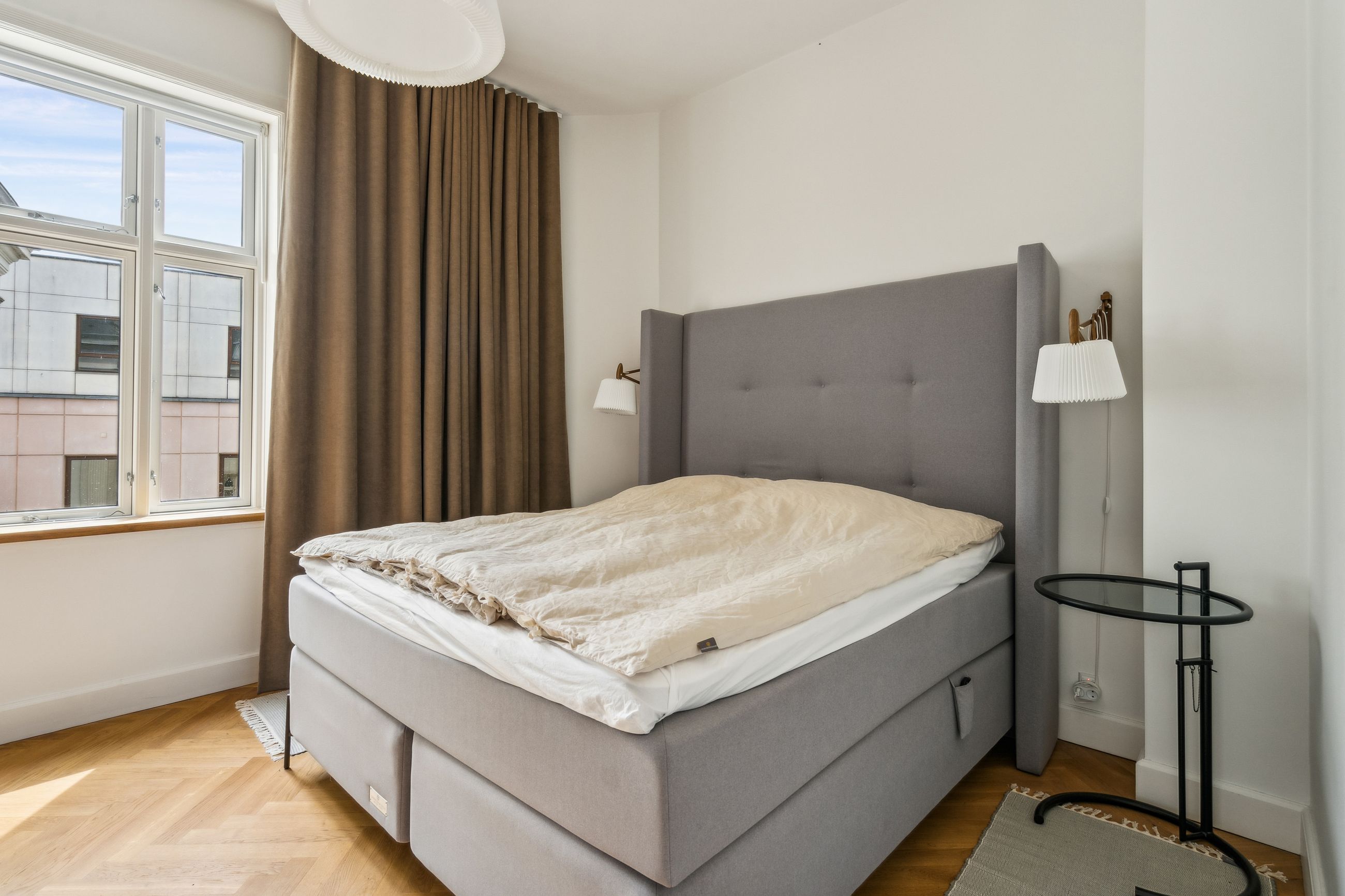 I hele lejligheden (undtagen badeværelset) er der fuldlimet sildebens/stavparket i massiv egetræ fra Hørning Parket samt gulvvarme, der kan styres individuelt i hvert rum.