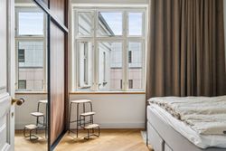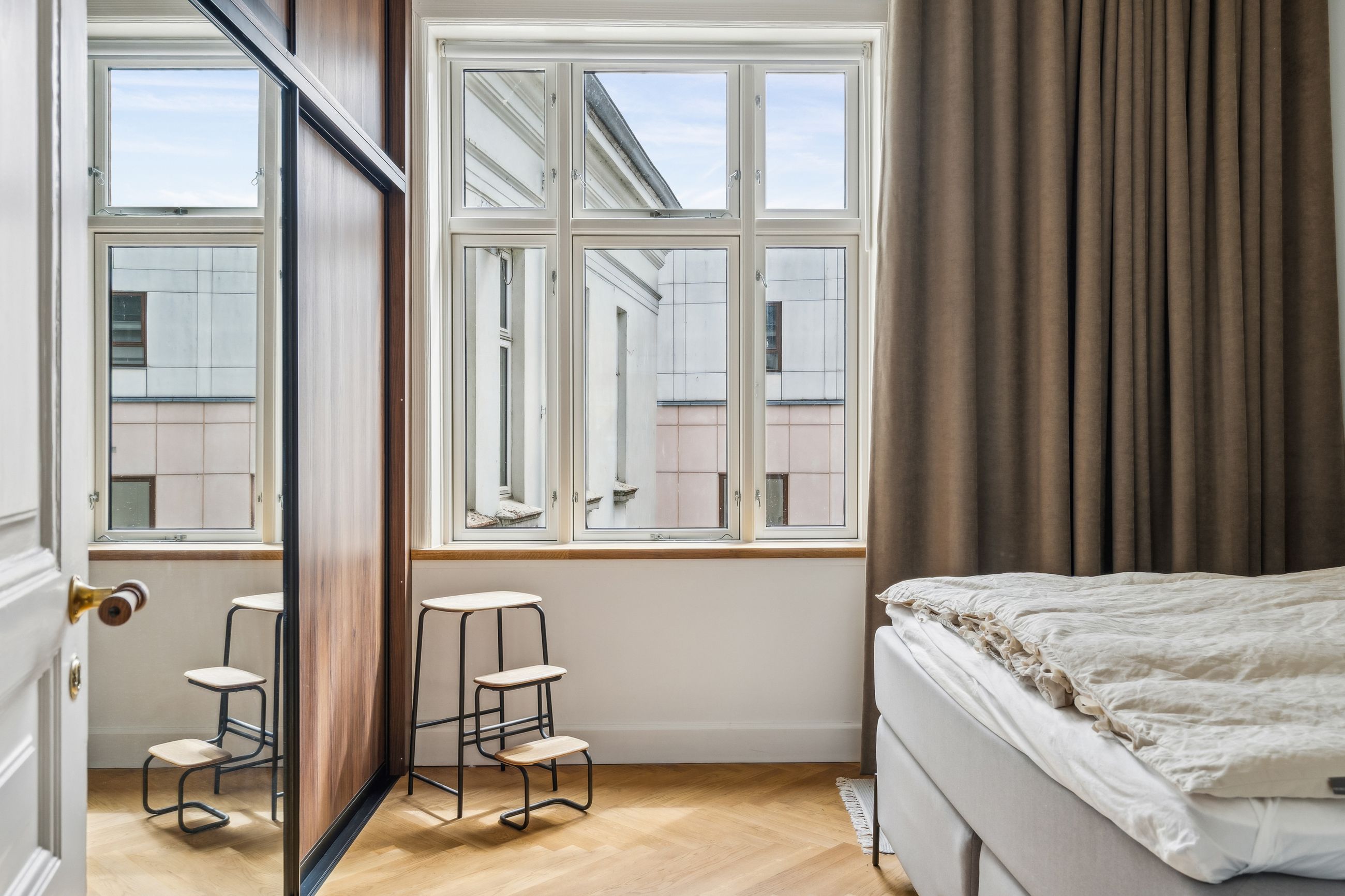 Vinduerne mod gaden er med nye 3-lags energiruder skiftet i 2023 og afsluttet med bundstykker af egetræ. Vinduerne i soveværelset og spisestuen er fra 2013.