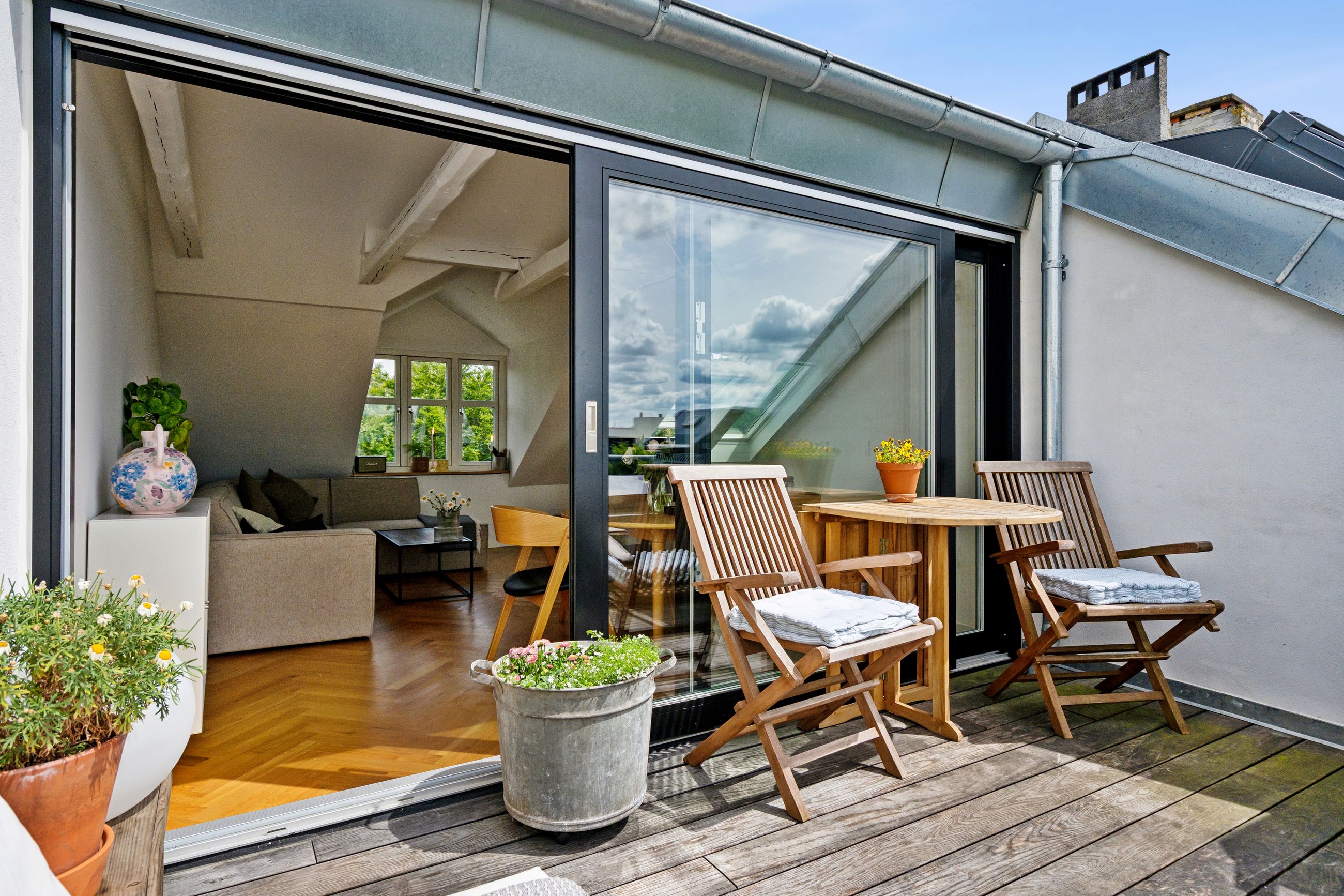 Totalmoderniseret og indflytningsklar 2-etagers ejerlejlighed med egen tagterrasse og parkeringsplads