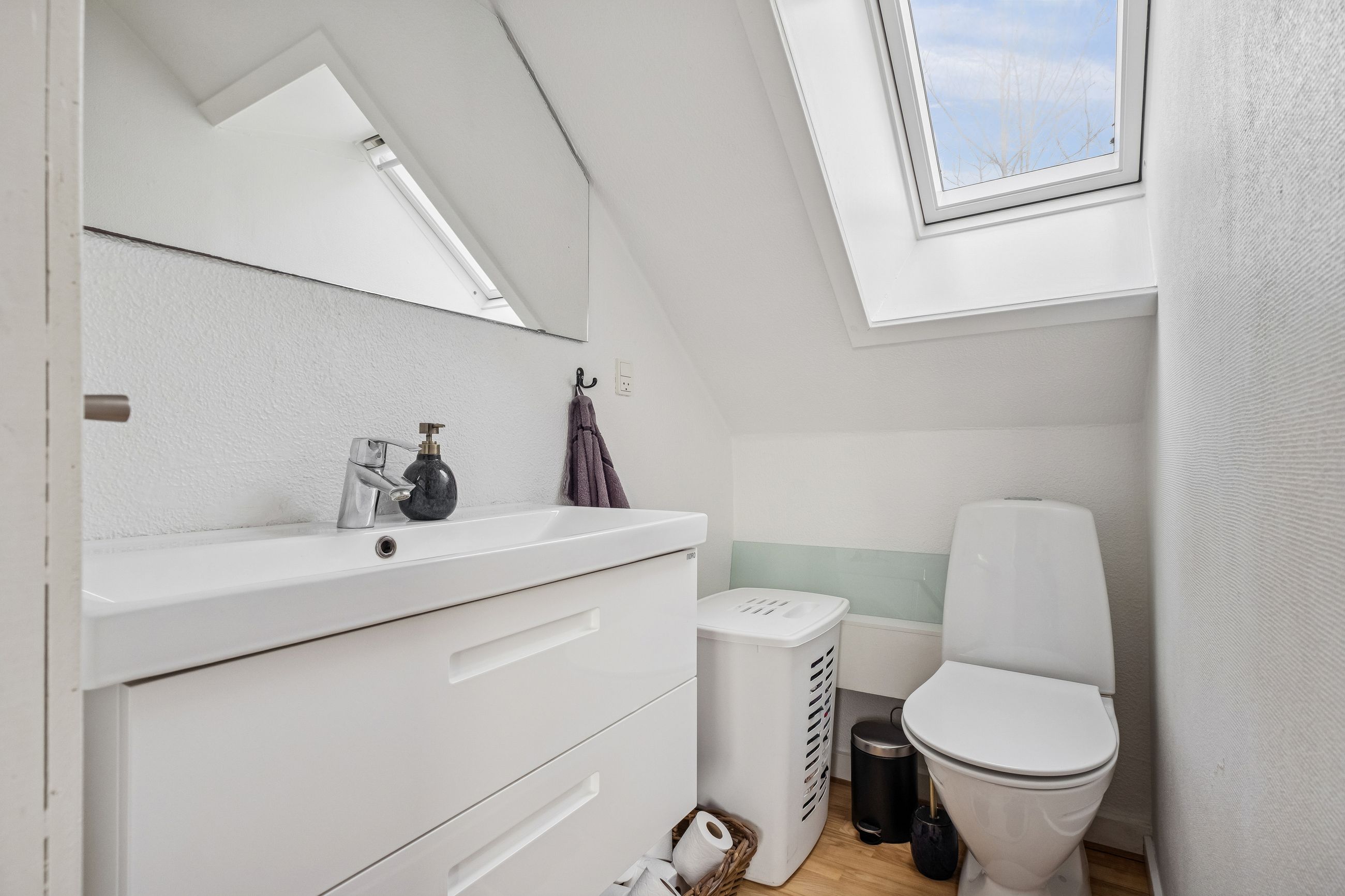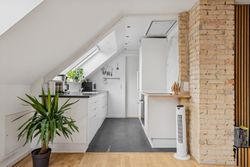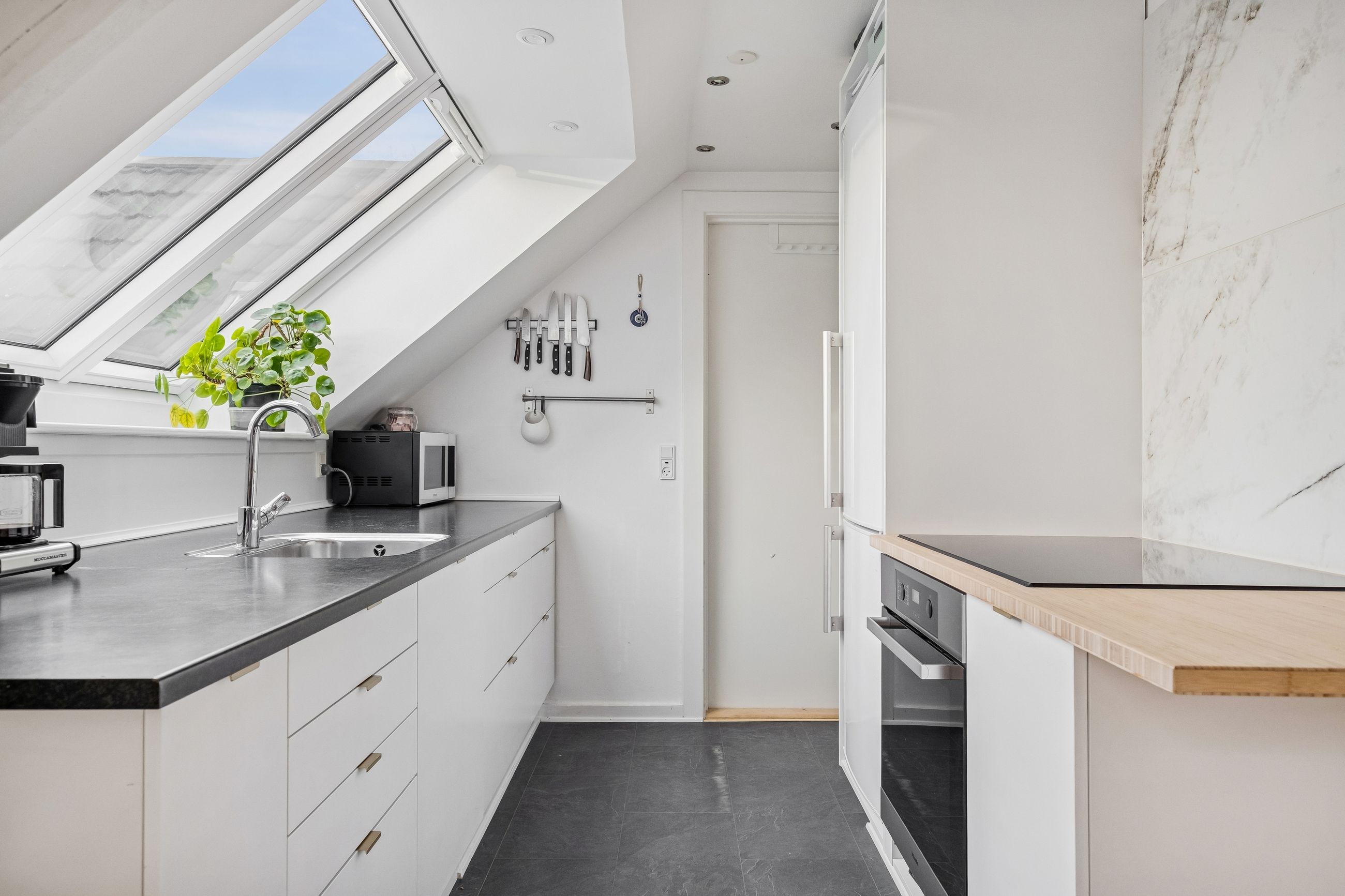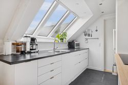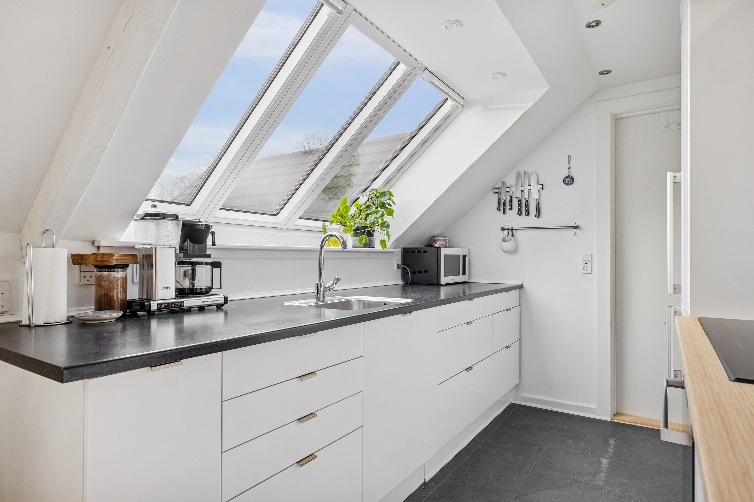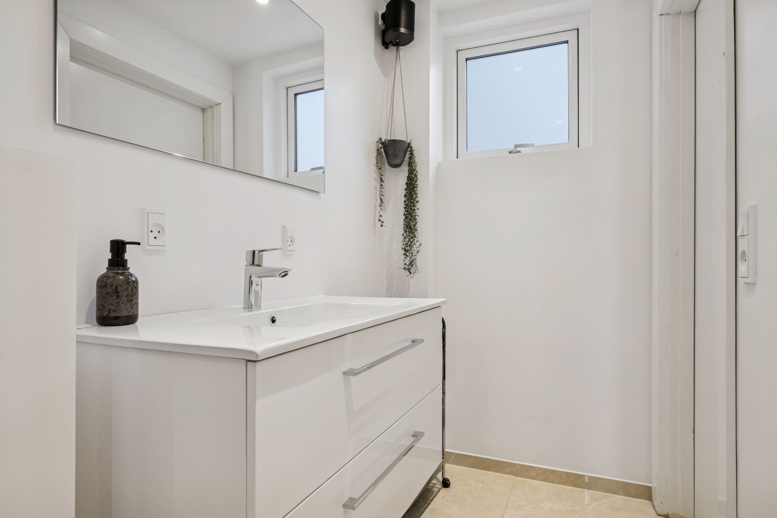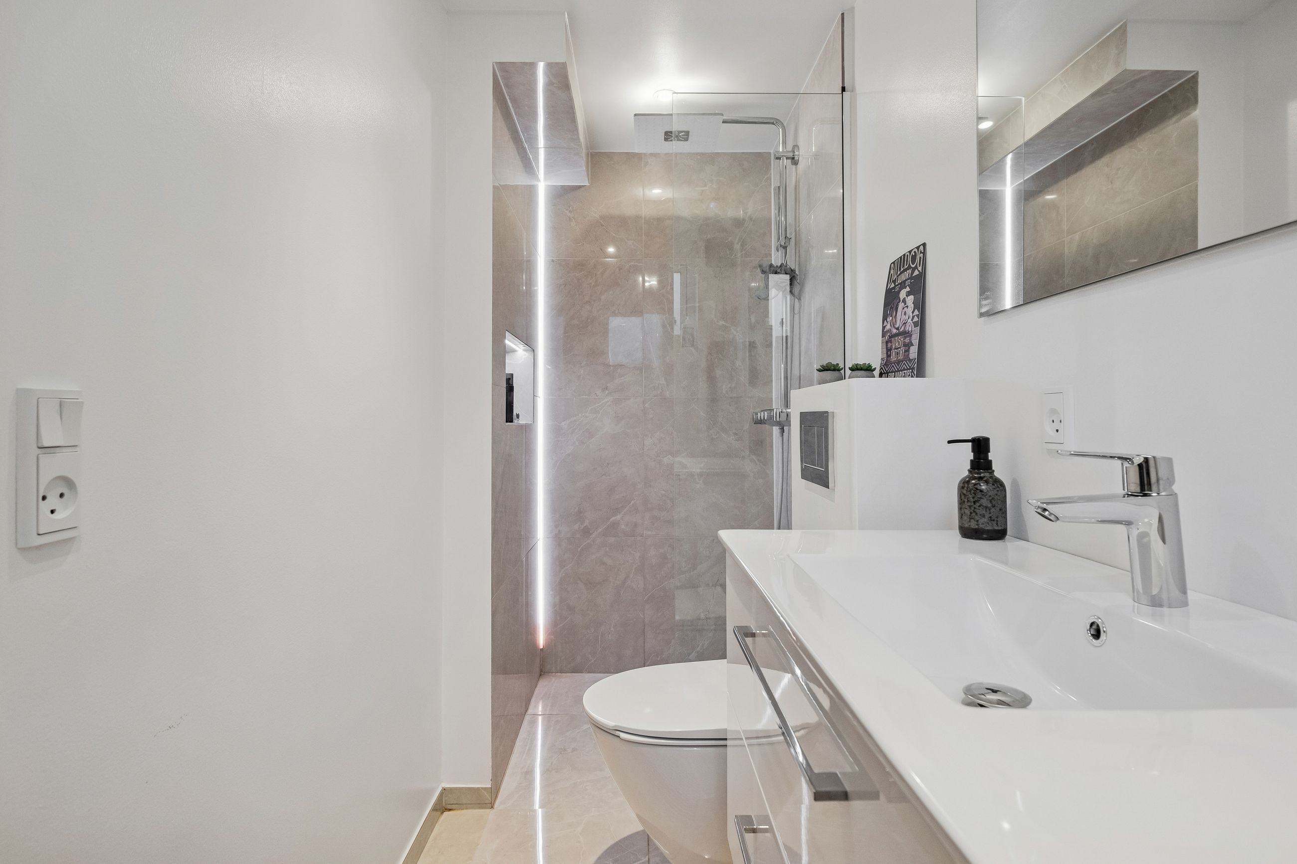 Det nyere køkken er moderniseret med et tidssvarende udtryk og gode opbevaringsløsninger, hvilket gør det både praktisk og indbydende i hverdagen. Soveværelset er regulært og giver god plads til seng og garderobe. Badeværelset er ligeledes nyt og pænt moderniseret med en stilren indretning, der bidrager til boligens samlede, opdaterede udtryk.