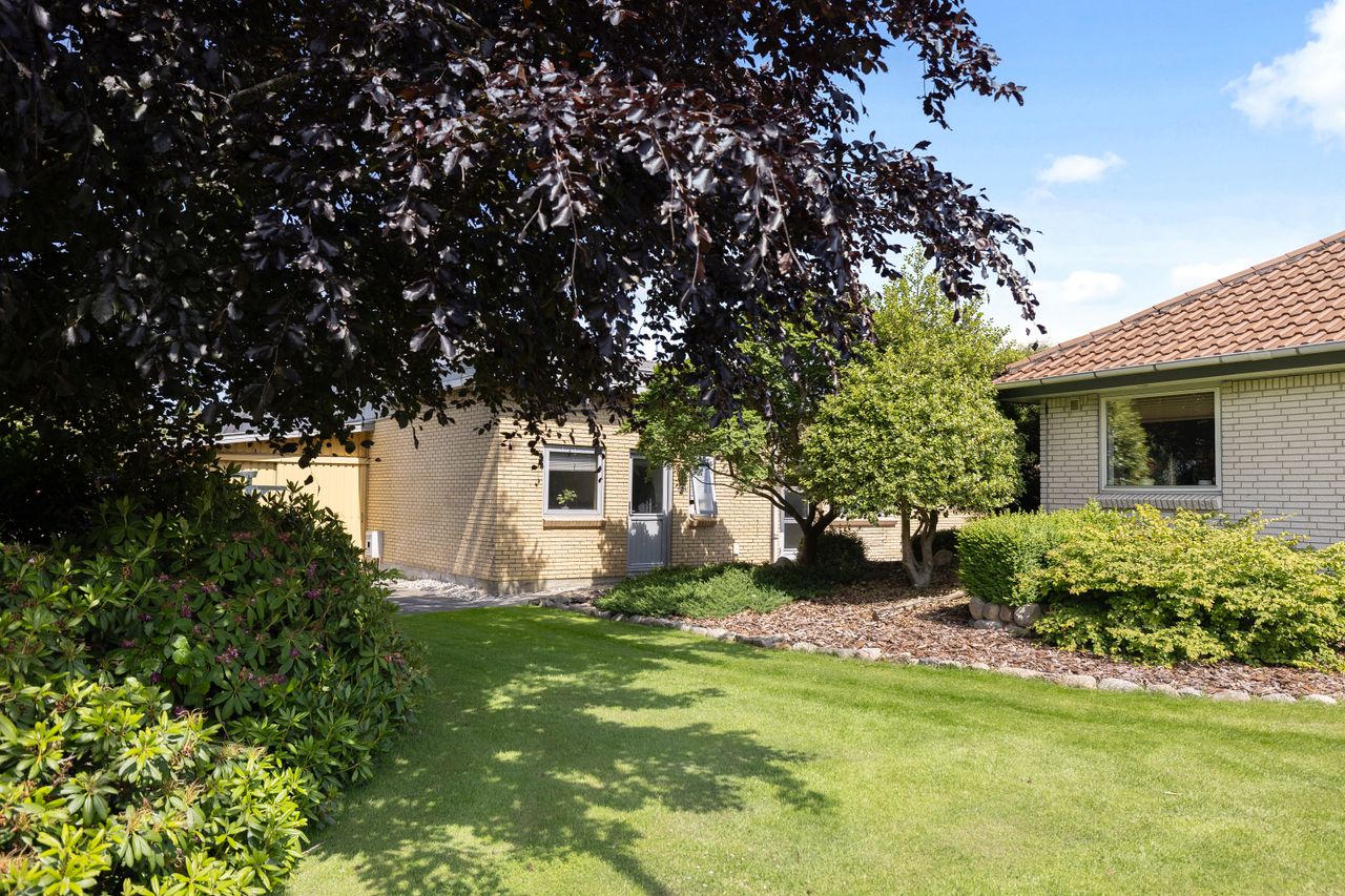 Haven til boligen er stor, flot og nydeligt anlagt, med flere forskellige buske, blomster og træer. Dertil er der to terrasser, hvor der til den ene er udgang fra stuen. Derudover er der et fint redskabsskur. Grunden må bebygges med 50% jf. kommuneplanrammerne, hvilket giver potentiale for at opføre godt 1.000 m2 ekstra.