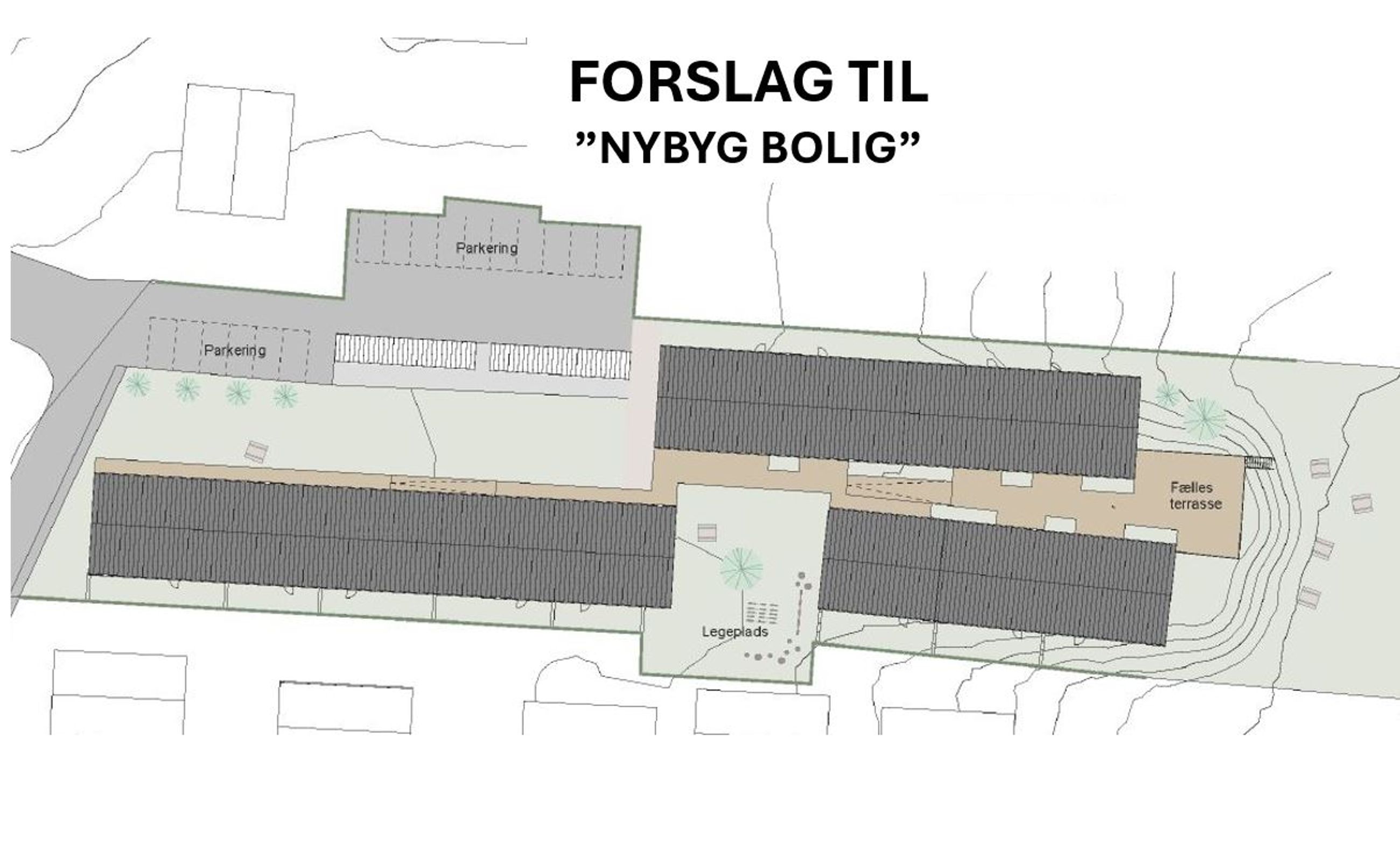 Ejer har ladet udarbejde foreløbige tegninger på opførelse af 20 unikke nye boliger i ét plan – med samlet etageareal på 1.357 m2. Projektet er gennemtænkt i forhold til placering, terræn og udnyttelse af grunden.