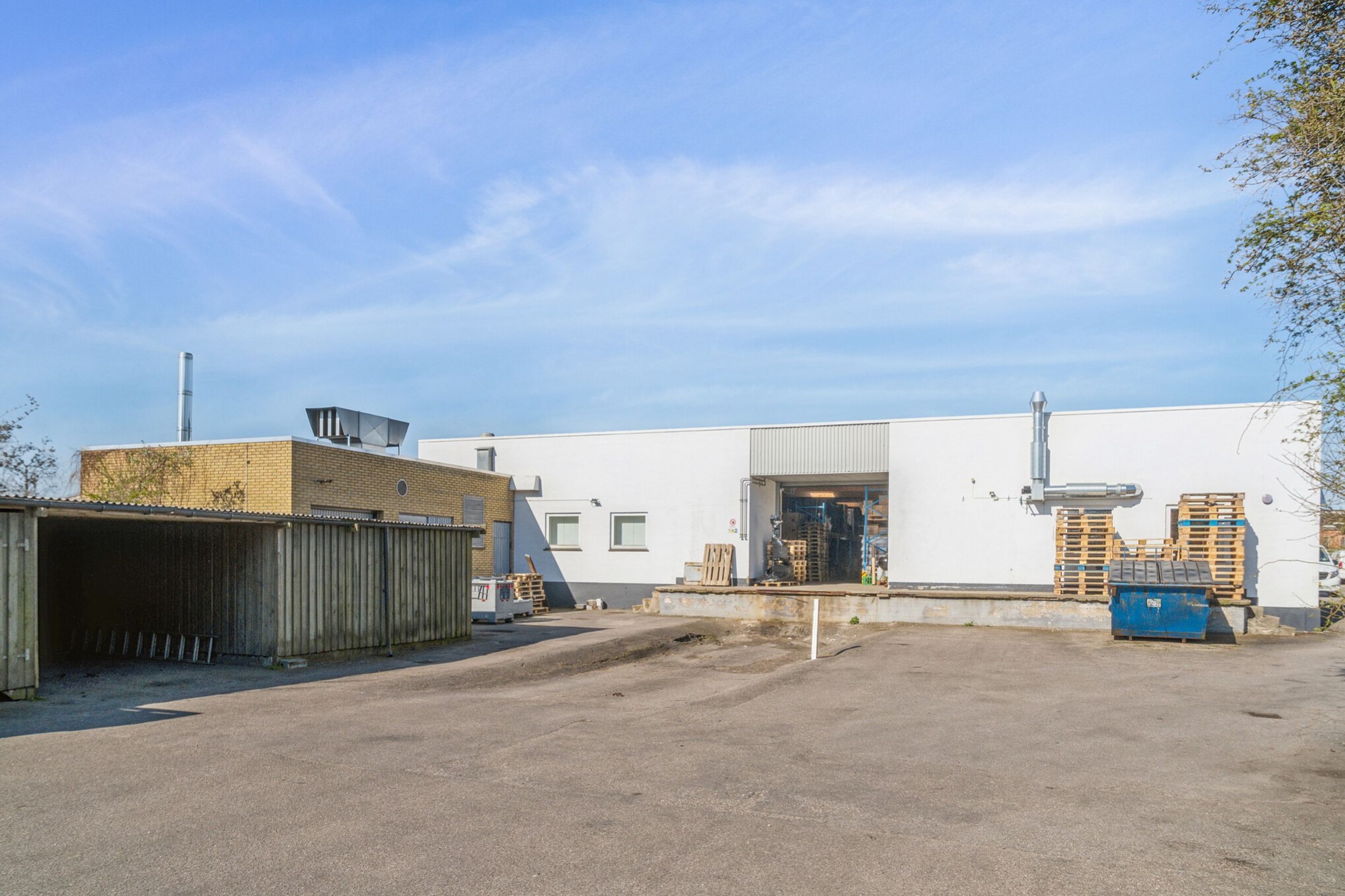 Lager-/produktionsbygning med højt til loftet, store porte og tilkørselsrampe – anvendelig til mange formål.
